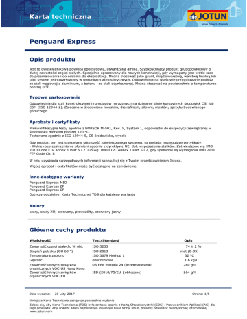 Karta techniczna Approved 2921;2400;2401 1 2400 epoksy ^(ValidationDate) Penguard Express Opis produktu Jest to dwuskładnikowa powłoka epoksydowa, utwardzana aminą. Szybkoschnący produkt grubopowłokowy o dużej zawartości części stałych. Specjalnie opracowany dla nowych konstrukcji, gdy wymagany jest krótki czas do przemalowania i do oddania do eksploatacji. Można stosować jako grunt, międzywarstwę, warstwę finalną lub jako system jednowarstwowy w warunkach atmosferycznych. Odpowiednia na właściwie przygotowane podłoża ze stali węglowej z aluminium, z betonu i ze stali ocynkowanej. Można stosować na powierzchnie o temperaturze poniżej 0 °C. Typowe zastosowanie Odpowiednia dla stali konstrukcyjnej i rurociągów narażonych na działanie silnie korozyjnych środowisk C5I lub C5M (ISO 12944-2). Zalecana w środowisku morskim, dla rafinerii, siłowni, mostów, sprzętu budowlanego i górniczego. Inne Aprobaty i certyfikaty Prekwalifikacyjne testy zgodnie z NORSOK M-501, Rev. 5, System 1, odpowiedni do ekspozycji zewnętrznej w środowisku morskim poniżej 120 °C. Testowano zgodnie z ISO 12944-5, C5-środowisko, wysoki Gdy produkt ten jest stosowany jako część zatwierdzonego systemu, to posiada następujące certyfikaty: - Wolne rozprzestrzenianie płomieni zgodnie z dyrektywą UE, dot. wyposażenia statków. Zatwierdzone wg IMO 2010 Code FTP Annex 1 Part 5 i 2 lub wg IMO FTPC Annex 1 Part 5 i 2, gdy spełnione są wymagania IMO 2010 FTP Code Ch. 8 W celu uzyskania szczegółowych informacji skonsultuj się z Twoim przedstawicielem Jotuna. Więcej aprobat i certyfikatów może być dostępne na zamówienie. lnne dostępne warianty Penguard Express MIO Penguard Express ZP Penguard Express CF Dotyczy oddzielnej Karty Technicznej TDS dla każdego wariantu Kolory szary, szary XO, czerwony, płowożółty, czerwony jasny Główne cechy produktu Właściwość Test/Standard Zawartość części stałych, % obj. ISO 3233 Stopień połysku (GU 60 °) ISO 2813 Temperatura zapłonu Gęstość ISO 3679 Method 1 obliczeniowa Zawartość lotnych związków organicznych VOC-US Hong Kong Zawartość lotnych związków organicznych VOC-EU US EPA metoda 24 (przetestowana) 260 g/l IED (2010/75/EU (obliczone) 264 g/l Data wydania: 20 Luty 2017 Opis 74 ± 2 % mat (0-35) 32 °C 1,6 kg/l Strona: 1/5 Niniejsza Karta Techniczna zastępuje poprzednie wydanie. Zaleca się, aby Karta Techniczna (TDS) była czytana łącznie z Kartą Charakterystyki (SDS) i Przewodnikiem Aplikacji (AG) dla tego produktu. Aby znaleźć adres najbliższego lokalnego biura firmy Jotun, prosimy odwiedzić naszą stronę internetową www.jotun.com 1 Karta techniczna Penguard Express Zawartość lotnych związków organicznych VOC Chiny GB/T 23985-2009 (ISO 11890-1) (przetestowana) 274 g/l Wyżej podane objętości odnoszą sie do kolorów wyprodukowanych w fabryce. Należy wziąć pod uwagę, że lokalne warianty wielkości opakowań i napełnianych objętości moga się różnić ze względu na lokalne przepisy. Wszystkie dane dotyczą farby po zmieszaniu. Opis połysku: Zgodnie z definicją Jotun Performance Coatings. Grubość jednej powłoki Typowy zalecany zakres specyfikowania grubości Grubość powłoki na sucho - 250 µm Grubość powłoki na mokro 100 - 75 340 µm Wydajność teoretyczna 9,9 - 3 m²/l Przygotowanie podłoża Aby zapewnić trwałą przyczepność do kolejnego produktu, wszystkie powierzchnie powinny być czyste, suche i wolne od wszelkich zanieczyszczeń. Przygotowanie powierzchni - tabela zbiorcza Przygotowanie podłoża Podłoże Minimum Zalecane Stal węglowa St 2 (ISO 8501-1) Sa 2½ (ISO 8501-1) Stal ocynkowana Powierzchnia powinna być czysta, sucha o chropowatym i matowym profilu. Oczyszczone wykończenie powierzchni przy użyciu niemetelicznego ścierniwa, tworzące czyste, chropowate i równomierne podłoże. Aluminium Powierzchnia powinna być ręcznie lub maszynowo szlifowana przy użyciu niemetalicznego ścierniwa lub urządzeniem z włókniną lub ręcznie, klockami ściernymi tworząc nacięcia na jej powierzchni i usunięcie z niej wszelkiej gładkości. Obróbka strumieniowo-ścierna do osiągnięcia profilu powierzchni stosując zatwierdzone niemetaliczne ścierniwo, które odpowiednie jest do uzyskania ostrego i kątowego profilu powierzchni. Stal z gruntem czasowej ochrony Suchy, czysty i zatwierdzony Omiecenie ścierniwem lub obróbka nieorganiczny grunt czasowej ochrony. strumieniowo-ścierna do klasy Sa 2 co najmniej 70 % powierzchni zgodnie z ISO 8501 1:1988. Powierzchnie pokryte Czysta, sucha i nieuszkodzona, kompatybilna powłoka (ISO 12944-4 6.1) Czysta, sucha i nieuszkodzona, kompatybilna powłoka (ISO 12944-4 6.1) Beton Minimum 4 tygodnie utwardzania. Zawartość wilgoci maksimum 5 %. Mechaniczne przygotowanie istniejącej powierzchni betonu przez frezowanie, przy użyciu pistoletu igłowego i szlifowanie mechaniczne. Minimum 4 tygodnie utwardzania. Zawartość wilgoci maksimum 5 %. Przygotowanie powierzchni za pomocą bezpyłowego śrutowania lub szlifowania tarczami diamentowymi lub innymi odpowiednimi środkami w celu usunięcia betonu i powłoki mleczka cementowego. Data wydania: 20 Luty 2017 Strona: 2/5 Niniejsza Karta Techniczna zastępuje poprzednie wydanie. Zaleca się, aby Karta Techniczna (TDS) była czytana łącznie z Kartą Charakterystyki (SDS) i Przewodnikiem Aplikacji (AG) dla tego produktu. Aby znaleźć adres najbliższego lokalnego biura firmy Jotun, prosimy odwiedzić naszą stronę internetową www.jotun.com Karta techniczna Penguard Express Aplikacja Metody stosowania Produkt może być nałożony przy pomocy Natrysk: Stosować natrysk bezpowietrzny. Pędzel: Zalecany do niewielkich powierzchni oraz do wyrabiania krawędzi, spawów i miejsc trudnodostępnych. Należy zwrócić uwagę, aby osiągnąć specyfikowaną grubość powłoki. Proporcje mieszania produktu (obj.) Penguard Express Comp A Penguard Express Comp B 4 część(i) 1 czę