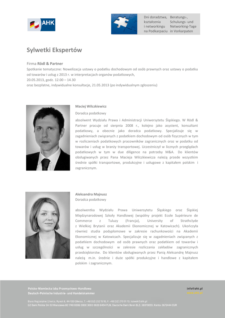 Dni doradztwa, kształcenia i networkingu na Podkarpaciu Beratungs-, Schulungs- und Networking-Tage in Vorkarpaten Sylwetki Ekspertów Firma Rödl & Partner Spotkanie tematyczne: Nowelizacja ustawy o podatku dochodowym od osób prawnych oraz ustawy o podatku od towarów i usług z 2013 r. w interpretacjach organów podatkowych, 20.05.2013, godz. 12.00 – 14.30 oraz bezpłatne, indywidualne konsultacje, 21.05.2013 (po indywidualnym zgłoszeniu) Maciej Wilczkiewicz Doradca podatkowy absolwent Wydziału Prawa i Administracji Uniwersytetu Śląskiego. W Rödl & Partner pracuje od sierpnia 2008 r., kolejno jako asystent, konsultant podatkowy, a obecnie jako doradca podatkowy. Specjalizuje się w zagadnieniach związanych z podatkiem dochodowym od osób fizycznych w tym w rozliczeniach podatkowych pracowników zagranicznych oraz w podatku od towarów i usług w branży transportowej. Uczestniczył w licznych przeglądach podatkowych w tym w due diligence na potrzeby M&A. Do klientów obsługiwanych przez Pana Macieja Wilczkiewicza należą przede wszystkim średnie spółki transportowe, produkcyjne i usługowe z kapitałem polskim i zagranicznym. Aleksandra Majnusz Doradca podatkowy absolwentka Wydziału Prawa Uniwersytetu Śląskiego oraz Śląskiej Międzynarodowej Szkoły Handlowej (wspólny projekt Ecole Supérieure de Commerce z Tuluzy (Francja), University of Strathclyde z Wielkiej Brytanii oraz Akademii Ekonomicznej w Katowicach). Ukończyła również studia podyplomowe w zakresie rachunkowości na Akademii Ekonomicznej w Katowicach. Specjalizuje się w zagadnieniach związanych z podatkiem dochodowym od osób prawnych oraz podatkiem od towarów i usług w szczególności w zakresie rozliczania zakładów zagranicznych przedsiębiorstw. Do klientów obsługiwanych przez Panią Aleksandrę Majnusz należą m.in. średnie i duże spółki produkcyjne i handlowe z kapitałem polskim i zagranicznym. Dni doradztwa, kształcenia i networkingu na Podkarpaciu Beratungs-, Schulungs- und Networking-Tage in Vorkarpaten Sylwetki Ekspertów Firma Siegma Consult Martin Siegwald Spotkanie tematyczne: Dotacje unijne w 2013 r., 20.05.2013, godz. 15.00 – 17.00 oraz bezpłatne, indywidualne konsultacje, 21.05.2013 (po indywidualnym zgłoszeniu) Martin Siegwald właściciel firmy Posiada długoletnie doświadczenie w opracowywaniu wniosków o dofinansowanie oraz w zarządzaniu projektami. Jest autorem podręcznika „Fördergelder in Polen“ /”Dotacje w Polsce” wydanego przez Polsko - Niemieckie Towarzystwo Wspierania Gospodarki. Lidia Lalinsky – Sawier Absolwentka Wyższej Szkoły Biznesu – National Louis University w Nowym Sączu. Pracuje jako specjalista ds. Funduszy Strukturalnych. Od ponad czterech laty specjalizuje się w opracowywaniu biznes planów oraz wniosków o dofinansowanie. Ewelina Biszczak – Dul specjalista ds. Funduszy Strukturalnych Ukończyła Politechnikę Rzeszowską na kierunku Zarządzanie i Marketing. Tematyką dotacji unijnych zajmuje się od czterech lat. Z powodzeniem opracowuje wnioski o dofinansowanie, biznes plany oraz zarządza realizacją projektów. Justyna Piniło Absolwentka Katolickiego Uniwersytetu Lubelskiego. Posiada doświadczenie w realizacji projektów lokalnych i międzynarodowych współfinansowanych ze środków Unii Europejskiej. Dni doradztwa, kształcenia i networkingu na Podkarpaciu Beratungs-, Schulungs- und Networking-Tage in Vorkarpaten Sylwetki Ekspertów Firma TPA Horwath Spotkanie tematyczne: Strategie optymalizacji podatkowej, czyli jak skutecznie zredukować obciążenia podatkowe, 20.05.2013, godz. 9.30 – 11.30 oraz bezpłatne, indywidualne konsultacje, 21.05.2013 (po indywidualnym zgłoszeniu) Krzysztof Horodko Partner Zarządzający Krzysztof Horodko jest ekspertem w zakresie polskich i międzynarodowych standardów rachunkowości. Rozpoczął pracę w poznańskim biurze spółki Arthur Andersen w dziale audytu i doradztwa gospodarczego w 1997 roku. W 2001 założył własną firmę, która w 2005 roku wstąpiła do grupy TPA Horwath. Krzysztof był zaangażowany w liczne projekty obejmujące przeglądy typu due diligence (m.in. spółek przemysłu naftowego, energetycznego, ciepłowniczego oraz telekomunikacyjnego, z branży nieruchomości, cukrowni oraz wiele innych), wyceny oraz przeglądy i badania sprawozdań finansowych. Brał także udział w projektach obejmujących szeroko pojęte doradztwo gospodarcze (m.in. łączenie i podział spółek, konwersje pożyczek i kredytów). Kilkunastoletnie doświadczenie Krzysztofa obejmuje udział bądź nadzór nad badaniami sprawozdań finansowych, wyceny oraz projekty typu due diligence, a także business consulting. Prowadził liczne seminaria oraz uczestniczył w wielu programach szkoleniowych m.in.: Core IAS Techniques czy Business Audit Advanced. Maciej Guzek Starszy Menedżer Maciej Guzek jest uprawnionym doradcą podatkowym od 2004 roku, zajmuje się głównie doradztwem dla spółek z kapitałem zagranicznym. Pracował zarówno dla renomowanych kancelarii prawa gospodarczego, jak i dla międzynarodowych spółek doradztwa podatkowego (m. in. Rödl & Partner w Poznaniu). Maciej specjalizuje się w problematyce dotyczącej opodatkowania międzynarodowego, postępowania podatkowego oraz sądowoadministracyjnego, prawa gospodarczego, restrukturyzacji oraz optymalizacji podatkowych, a także przepisów oraz praktyki działalności gospodarczej w SSE. Jest współautorem Komentarza do polsko-niemieckiej umowy o unikaniu podwójnego opodatkowania z roku 2006, jak również autorem licznych publikacji prasowych o tematyce podatkowej, a także wykładowcą studiów podyplomowych prowadzonych przez Wyższą Szkołę Bankową w Poznaniu.