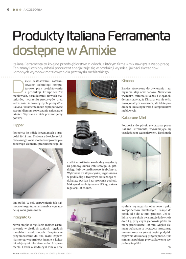 6 AKCESORIA Produkty Italiana Ferramenta dostępne w Amixie Italiana Ferramenta to kolejne przedsiębiorstwo z Włoch, z którym firma Amix nawiązała współpracę. Ten znany i ceniony włoski producent specjalizuje się w produkcji wysokiej jakości akcesoriów i drobnych wyrobów metalowych dla przemysłu meblarskiego. zięki zastosowaniu zaawansowanej technologii komputerowej przy projektowaniu i produkcji komponentów meblowych, poszukiwaniu nowych materiałów, tworzeniu prototypów oraz wdrażaniu innowacyjnych pomysłów Italiana Ferramenta może zaproponować swoim klientom rozwiązania najwyższej jakości. Wybrane z nich prezentujemy poniżej. Kimana Flipper Podpórka do półek stworzona przez Italiana Ferramenta, wyróżniająca się urzekającym wzornictwem. Doskonale D Zawias stworzony do otwierania i zamykania klap oraz barków. Niewielkie wymiary, minimalistyczny i elegancki design sprawia, że Kimana jest nie tylko funkcjonalnym zawiasem, ale także produktem unikalnym wśród komponentów meblowych. Kalabrone Mini Podpórka do półek drewnianych o grubości 16-18 mm. Złożona z dwóch części: metalowego kołka montażowego oraz plastikowego elementu przeznaczonego do szafki umożliwia swobodną regulację za pomocą klucza imbusowego S6, płaskiego lub gwiazdkowego śrubokrętu. Wykonana ze stopu cynku, wyposażona w podkładkę z tworzywa sztucznego redukującą poślizg i zarysowania podłogi. Maksymalne obciążenie – 175 kg; zakres regulacji – 0-25 mm. dna półki. W celu zapewnienia jak najmocniejszego trzymania mebla wymagane są kołki gwintowane. Integrato G Nowa stopka z regulacją mająca zastosowanie w ciężkich szafach, regałach i meblach modułowych. Bezpieczne przymocowanie do dna szafki zapewnia szereg wsporników łącznie z kolcami wbijanymi młotkiem w dno korpusu mebla. Otwór o średnicy 8 mm w dnie MEBLE MATERIAŁY I AKCESORIA | Nr 10/175 | listopad 2015 r. spełnia wymagania obecnego rynku komponentów meblowych. Pasuje do półek od 5 do 10 mm grubości. Jej solidna konstrukcja gwarantuje ładowność do 6 kg, przy czym głębokość półki nie może przekraczać 150 mm. Miękki element wykonany z tworzywa sztucznego umieszczony na górnej części podpórki zapewnia doskonałą przyczepność, tym samym zapobiega przypadkowemu wypadnięciu półki. (jb) www.mmia.pl
