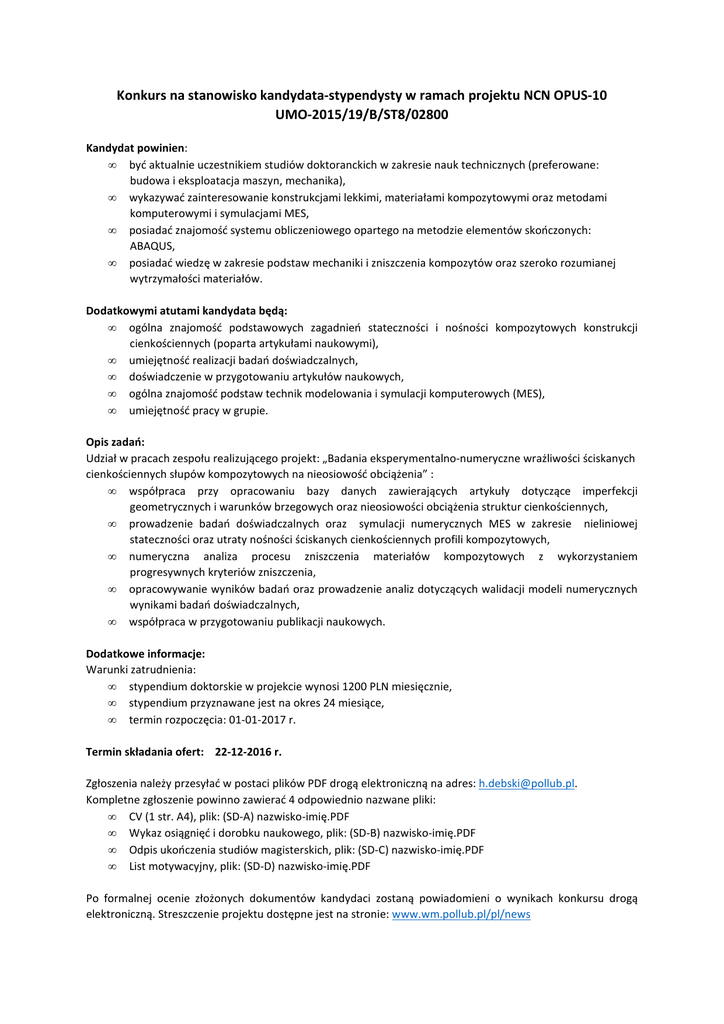 Konkurs na stanowisko kandydata-stypendysty w ramach projektu NCN OPUS-10 UMO-2015/19/B/ST8/02800 Kandydat powinien: • być aktualnie uczestnikiem studiów doktoranckich w zakresie nauk technicznych (preferowane: budowa i eksploatacja maszyn, mechanika), • wykazywać zainteresowanie konstrukcjami lekkimi, materiałami kompozytowymi oraz metodami komputerowymi i symulacjami MES, • posiadać znajomość systemu obliczeniowego opartego na metodzie elementów skończonych: ABAQUS, • posiadać wiedzę w zakresie podstaw mechaniki i zniszczenia kompozytów oraz szeroko rozumianej wytrzymałości materiałów. Dodatkowymi atutami kandydata będą: • ogólna znajomość podstawowych zagadnień stateczności i nośności kompozytowych konstrukcji cienkościennych (poparta artykułami naukowymi), • umiejętność realizacji badań doświadczalnych, • doświadczenie w przygotowaniu artykułów naukowych, • ogólna znajomość podstaw technik modelowania i symulacji komputerowych (MES), • umiejętność pracy w grupie. Opis zadań: Udział w pracach zespołu realizującego projekt: „Badania eksperymentalno-numeryczne wrażliwości ściskanych cienkościennych słupów kompozytowych na nieosiowość obciążenia” : • współpraca przy opracowaniu bazy danych zawierających artykuły dotyczące imperfekcji geometrycznych i warunków brzegowych oraz nieosiowości obciążenia struktur cienkościennych, • prowadzenie badań doświadczalnych oraz symulacji numerycznych MES w zakresie nieliniowej stateczności oraz utraty nośności ściskanych cienkościennych profili kompozytowych, • numeryczna analiza procesu zniszczenia materiałów kompozytowych z wykorzystaniem progresywnych kryteriów zniszczenia, • opracowywanie wyników badań oraz prowadzenie analiz dotyczących walidacji modeli numerycznych wynikami badań doświadczalnych, • współpraca w przygotowaniu publikacji naukowych. Dodatkowe informacje: Warunki zatrudnienia: • stypendium doktorskie w projekcie wynosi 1200 PLN miesięcznie, • stypendium przyznawane jest na okres 24 miesiące, • termin rozpoczęcia: 01-01-2017 r. Termin składania ofert: 22-12-2016 r. Zgłoszenia należy przesyłać w postaci plików PDF drogą elektroniczną na adres: [email protected]. Kompletne zgłoszenie powinno zawierać 4 odpowiednio nazwane pliki: • CV (1 str. A4), plik: (SD-A) nazwisko-imię.PDF • Wykaz osiągnięć i dorobku naukowego, plik: (SD-B) nazwisko-imię.PDF • Odpis ukończenia studiów magisterskich, plik: (SD-C) nazwisko-imię.PDF • List motywacyjny, plik: (SD-D) nazwisko-imię.PDF Po formalnej ocenie złożonych dokumentów kandydaci zostaną powiadomieni o wynikach konkursu drogą elektroniczną. Streszczenie projektu dostępne jest na stronie: www.wm.pollub.pl/pl/news