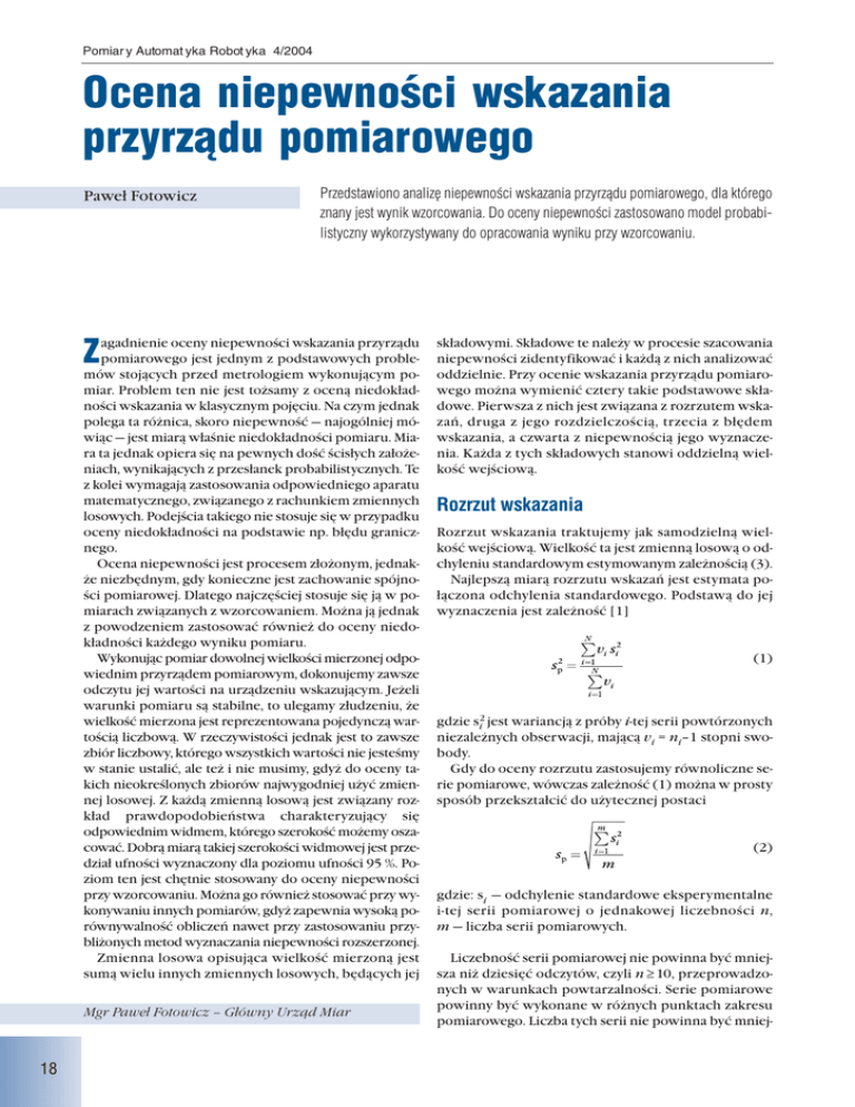 Pomiar y Automat yka Robot yka 4/2004 Ocena niepewności wskazania przyrządu pomiarowego Paweł Fotowicz Przedstawiono analizę niepewności wskazania przyrządu pomiarowego, dla którego znany jest wynik wzorcowania. Do oceny niepewności zastosowano model probabi− listyczny wykorzystywany do opracowania wyniku przy wzorcowaniu. Z agadnienie oceny niepewności wskazania przyrządu pomiarowego jest jednym z podstawowych problemów stojących przed metrologiem wykonującym pomiar. Problem ten nie jest tożsamy z oceną niedokładności wskazania w klasycznym pojęciu. Na czym jednak polega ta różnica, skoro niepewność — najogólniej mówiąc — jest miarą właśnie niedokładności pomiaru. Miara ta jednak opiera się na pewnych dość ścisłych założeniach, wynikających z przesłanek probabilistycznych. Te z kolei wymagają zastosowania odpowiedniego aparatu matematycznego, związanego z rachunkiem zmiennych losowych. Podejścia takiego nie stosuje się w przypadku oceny niedokładności na podstawie np. błędu granicznego. Ocena niepewności jest procesem złożonym, jednakże niezbędnym, gdy konieczne jest zachowanie spójności pomiarowej. Dlatego najczęściej stosuje się ją w pomiarach związanych z wzorcowaniem. Można ją jednak z powodzeniem zastosować również do oceny niedokładności każdego wyniku pomiaru. Wykonując pomiar dowolnej wielkości mierzonej odpowiednim przyrządem pomiarowym, dokonujemy zawsze odczytu jej wartości na urządzeniu wskazującym. Jeżeli warunki pomiaru są stabilne, to ulegamy złudzeniu, że wielkość mierzona jest reprezentowana pojedynczą wartością liczbową. W rzeczywistości jednak jest to zawsze zbiór liczbowy, którego wszystkich wartości nie jesteśmy w stanie ustalić, ale też i nie musimy, gdyż do oceny takich nieokreślonych zbiorów najwygodniej użyć zmiennej losowej. Z każdą zmienną losową jest związany rozkład prawdopodobieństwa charakteryzujący się odpowiednim widmem, którego szerokość możemy oszacować. Dobrą miarą takiej szerokości widmowej jest przedział ufności wyznaczony dla poziomu ufności 95 %. Poziom ten jest chętnie stosowany do oceny niepewności przy wzorcowaniu. Można go również stosować przy wykonywaniu innych pomiarów, gdyż zapewnia wysoką porównywalność obliczeń nawet przy zastosowaniu przybliżonych metod wyznaczania niepewności rozszerzonej. Zmienna losowa opisująca wielkość mierzoną jest sumą wielu innych zmiennych losowych, będących jej Mgr Paweł Fotowicz – Główny Urząd Miar 18 składowymi. Składowe te należy w procesie szacowania niepewności zidentyfikować i każdą z nich analizować oddzielnie. Przy ocenie wskazania przyrządu pomiarowego można wymienić cztery takie podstawowe składowe. Pierwsza z nich jest związana z rozrzutem wskazań, druga z jego rozdzielczością, trzecia z błędem wskazania, a czwarta z niepewnością jego wyznaczenia. Każda z tych składowych stanowi oddzielną wielkość wejściową. Rozrzut wskazania Rozrzut wskazania traktujemy jak samodzielną wielkość wejściową. Wielkość ta jest zmienną losową o odchyleniu standardowym estymowanym zależnością (3). Najlepszą miarą rozrzutu wskazań jest estymata połączona odchylenia standardowego. Podstawą do jej wyznaczenia jest zależność [1] (1) gdzie si2 jest wariancją z próby i-tej serii powtórzonych niezależnych obserwacji, mającą vi = ni–1 stopni swobody. Gdy do oceny rozrzutu zastosujemy równoliczne serie pomiarowe, wówczas zależność (1) można w prosty sposób przekształcić do użytecznej postaci (2) gdzie: si — odchylenie standardowe eksperymentalne i-tej serii pomiarowej o jednakowej liczebności n, m — liczba serii pomiarowych. Liczebność serii pomiarowej nie powinna być mniejsza niż dziesięć odczytów, czyli n ≥ 10, przeprowadzonych w warunkach powtarzalności. Serie pomiarowe powinny być wykonane w różnych punktach zakresu pomiarowego. Liczba tych serii nie powinna być mniej- Pomiar y Automat yka Robot yka 4/2004 sza niż trzy, czyli m ≥ 3. Należy zadbać, aby równomiernie rozłożyć punkty w zakresie pomiarowym. Obliczona na podstawie (2) wartość estymaty jest dobrym oszacowaniem odchylenia standardowego zmiennej losowej związanej z rozrzutem wskazań, a duża liczba odczytów pozwala przyjąć wiarygodne założenie o normalności jej rozkładu. Jeśli chcemy uzyskać informację o niepewności rozrzutu dowolnej wskazanej wartości wielkości mierzonej przez przyrząd pomiarowy, to wystarczy wyznaczyć średnią z odczytów i przypisać jej niepewność standardową daną zależnością mi punktami, dla których zostało przeprowadzone wzorcowanie. Wartości błędów dla tych punktów podane są w świadectwie. Należy zatem dokonać ich randomizacji. Randomizacja będzie polegać na założeniu, że każda nieznana wartość błędu z przedziału, którego granice wyznaczają wartości znane, może przyjmować każdą wartość o rozkładzie trapezowym, którego górną i dolną podstawę wyznaczają te granice. Wówczas niepewność standardowa związana ze zrandomizowanym błędem wyniesie (3) gdzie a i b to wartości błędów wskazania dla granic przedziału zakresu pomiarowego, w którym dokonano odczytu. Zasadę powyższą można również uogólnić na cały zakres pomiarowy, przyjmując jako dolną podstawę rozkładu trapezowego największą wartość błędu, a jako górną najmniejszą jego wartość, odczytane ze świadectwa wzorcowania. Wówczas niepewność z powyższego tytułu będzie dotyczyć wszystkich wskazań w całym zakresie pomiarowym, a nie tylko w określonym jego przedziale. Oprócz niepewności związanej z randomizacją błędu należy uwzględnić również niepewność wyznaczenia samego błędu wskazania. W świadectwie wzorcowania są podawane niepewności rozszerzone U wyznaczenia błędów wskazania wraz ze współczynnikami rozszerzenia k zapewniającymi po