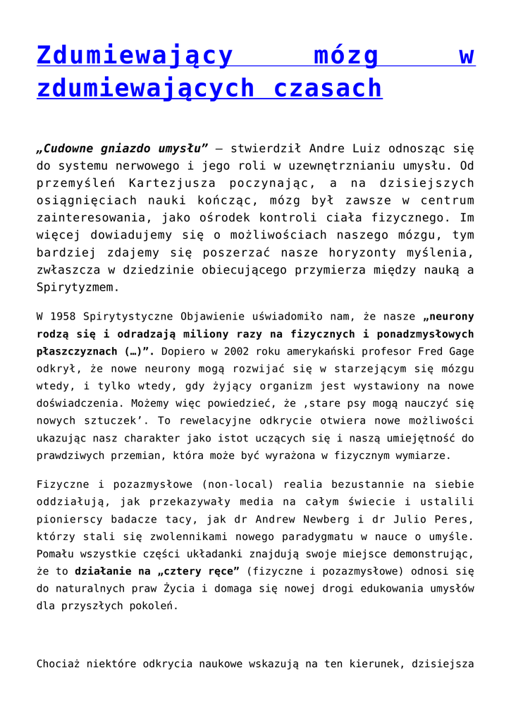 Zdumiewający mózg zdumiewających czasach w „Cudowne gniazdo umysłu” – stwierdził Andre Luiz odnosząc się do systemu nerwowego i jego roli w uzewnętrznianiu umysłu. Od przemyśleń Kartezjusza poczynając, a na dzisiejszych osiągnięciach nauki kończąc, mózg był zawsze w centrum zainteresowania, jako ośrodek kontroli ciała fizycznego. Im więcej dowiadujemy się o możliwościach naszego mózgu, tym bardziej zdajemy się poszerzać nasze horyzonty myślenia, zwłaszcza w dziedzinie obiecującego przymierza między nauką a Spirytyzmem. W 1958 Spirytystyczne Objawienie uświadomiło nam, że nasze „neurony rodzą się i odradzają miliony razy na fizycznych i ponadzmysłowych płaszczyznach (…)”. Dopiero w 2002 roku amerykański profesor Fred Gage odkrył, że nowe neurony mogą rozwijać się w starzejącym się mózgu wtedy, i tylko wtedy, gdy żyjący organizm jest wystawiony na nowe doświadczenia. Możemy więc powiedzieć, że ‚stare psy mogą nauczyć się nowych sztuczek’. To rewelacyjne odkrycie otwiera nowe możliwości ukazując nasz charakter jako istot uczących się i naszą umiejętność do prawdziwych przemian, która może być wyrażona w fizycznym wymiarze. Fizyczne i pozazmysłowe (non-local) realia bezustannie na siebie oddziałują, jak przekazywały media na całym świecie i ustalili pionierscy badacze tacy, jak dr Andrew Newberg i dr Julio Peres, którzy stali się zwolennikami nowego paradygmatu w nauce o umyśle. Pomału wszystkie części układanki znajdują swoje miejsce demonstrując, że to działanie na „cztery ręce” (fizyczne i pozazmysłowe) odnosi się do naturalnych praw Życia i domaga się nowej drogi edukowania umysłów dla przyszłych pokoleń. Chociaż niektóre odkrycia naukowe wskazują na ten kierunek, dzisiejsza nauka jeszcze nie udowodniła, że niezależny od zmysłów umysł kieruje fizycznym mózgiem. Jednak Spirytyzm przybliża nas do tej wizji swoją dynamiką i prawami twierdząc, że myśl jest mierzalną siłą! Ta wymierna siła może być zilustrowana poprzez doświadczenia, które stały się udziałem sławnego medium i humanisty Chico Xaviera. Opowiadał on o mentalnym pocisku (skumulowanej w myślach negatywnej energii), który otrzymał od znajomego po zwróceniu mu uwagi, że ma on złe podejście do swoich aktualnych zajęć. Nie pogodziwszy się z uwagą Chico Xaviera osoba ta wysłała w jego kierunku myśl wypełnioną nienawiścią… Dzięki Bogu przyjaciele ze świata duchowego rozładowali cios. Ale mimo wszystko Chico Xavier przez kolejne dni odczuwał silny ból w ramieniu… Ze wszystkim, co wciąż pozostaje do odkrycia na świecie i czym jeszcze można podzielić się z ludzkością, oddajemy w Twoje ręce, drogi czytelniku, ten artykuł, jako propozycję oczyszczenia w nowej erze, w której już żyjemy. W tym nowym okresie potrzebujemy nowych standardów, a najważniejszym z nich jest jedyna miara. Nowe standardy dla odradzającego się świata wymagają ciągłego skupiania się na naszych potrzebach postępu i przeobrażania i wprowadzania ich w życie z radością, nadzieją i odwagą zgodnie z Dobrą Nowiną. Otwórzmy więc serca i podążajmy zawsze do przodu, ponieważ posiadamy zadziwiający mózg, który prowadzi nas w zadziwiających czasach! Vanessa Anseloni PhD Źródło: „The Spiritist Magazine”, 2013 January Nº20: „Amazing Brain for Amazing Times” „Cudowne gniazdo umysłu” – stwierdził Andre Luiz odnosząc się do systemu nerwowego i jego roli w uzewnętrznianiu umysłu. Od przemyśleń Kartezjusza poczynając, a na dzisiejszych osiągnięciach nauki kończąc, mózg był zawsze w centrum zainteresowania, jako ośrodek kontroli ciała fizycznego. Im więcej dowiadujemy się o możliwościach naszego mózgu, tym bardziej zdajemy się poszerzać nasze horyzonty myślenia, zwłaszcza w dziedzinie obiecującego przymierza między nauką a Spirytyzmem.