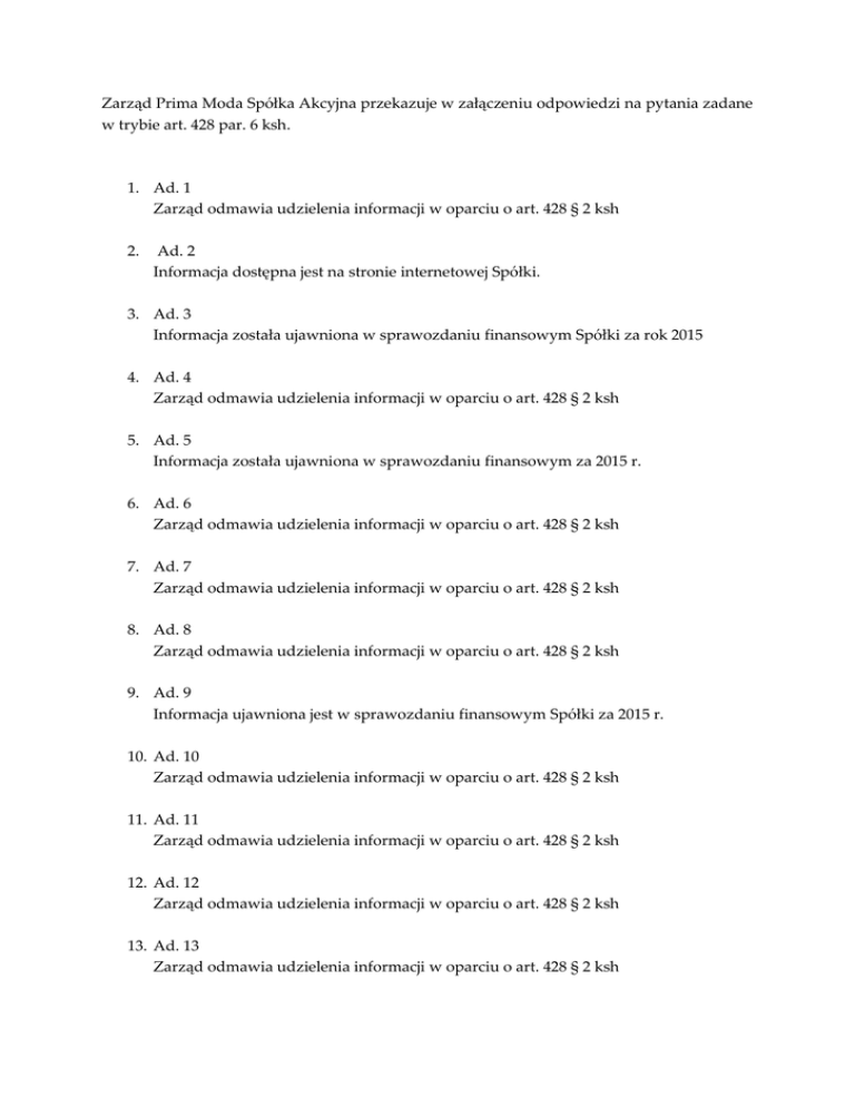 Zarząd Prima Moda Spółka Akcyjna przekazuje w załączeniu odpowiedzi na pytania zadane w trybie art. 428 par. 6 ksh. 1. Ad. 1 Zarząd odmawia udzielenia informacji w oparciu o art. 428 § 2 ksh 2. Ad. 2 Informacja dostępna jest na stronie internetowej Spółki. 3. Ad. 3 Informacja została ujawniona w sprawozdaniu finansowym Spółki za rok 2015 4. Ad. 4 Zarząd odmawia udzielenia informacji w oparciu o art. 428 § 2 ksh 5. Ad. 5 Informacja została ujawniona w sprawozdaniu finansowym za 2015 r. 6. Ad. 6 Zarząd odmawia udzielenia informacji w oparciu o art. 428 § 2 ksh 7. Ad. 7 Zarząd odmawia udzielenia informacji w oparciu o art. 428 § 2 ksh 8. Ad. 8 Zarząd odmawia udzielenia informacji w oparciu o art. 428 § 2 ksh 9. Ad. 9 Informacja ujawniona jest w sprawozdaniu finansowym Spółki za 2015 r. 10. Ad. 10 Zarząd odmawia udzielenia informacji w oparciu o art. 428 § 2 ksh 11. Ad. 11 Zarząd odmawia udzielenia informacji w oparciu o art. 428 § 2 ksh 12. Ad. 12 Zarząd odmawia udzielenia informacji w oparciu o art. 428 § 2 ksh 13. Ad. 13 Zarząd odmawia udzielenia informacji w oparciu o art. 428 § 2 ksh 14. Ad. 14 Zarząd odmawia udzielenia informacji w oparciu o art. 428 § 2 ksh 15. Ad. 15 Zarząd odmawia udzielenia informacji w oparciu o art. 428 § 2 ksh 16. Ad. 16 Zarząd odmawia udzielenia informacji w oparciu o art. 428 § 2 ksh 17. Ad. 17 Zarząd odmawia udzielenia informacji w oparciu o art. 428 § 2 ksh 18. Ad. 18 Zarząd odmawia udzielenia informacji w oparciu o art. 428 § 2 ksh 19. Ad. 19 Zarząd odmawia udzielenia informacji w oparciu o art. 428 § 2 ksh 20. Ad. 20 Zarząd odmawia udzielenia informacji w oparciu o art. 428 § 2 ksh 21. Ad. 21 Zarząd odmawia udzielenia informacji w oparciu o art. 428 § 2 ksh 22. Ad. 22 Zarząd odmawia udzielenia informacji w oparciu o art. 428 § 2 ksh 23. Ad. 23 Zarząd odmawia udzielenia informacji w oparciu o art. 428 § 2 ksh 24. Ad. 24 Zarząd przedstawił swoje plany działania w Liście do akcjonariuszy. Dalsze szczegółowe plany, jeśli ich publikacja okaże się niezbędna zostaną przekazane akcjonariuszom. 25. Ad. 25 Zarząd odmawia udzielenia informacji w oparciu o art. 428 § 2 ksh 26. Ad. 26 Zarząd odmawia udzielenia informacji w oparciu o art. 428 § 2 ksh 27. Ad. 27 Zarząd odmawia udzielenia informacji w oparciu o art. 428 § 2 ksh 28. Ad. 28 Zarząd podejmuje szereg działań, aby osiągnąć prób rentowności w 2016 r. 29. Ad. 29 Zarząd odmawia udzielenia informacji w oparciu o art. 428 § 2 ksh 30. Ad. 30 Zarząd odmawia udzielenia informacji w oparciu o art. 428 § 2 ksh 31. Ad. 31 Zarząd odmawia udzielenia informacji w oparciu o art. 428 § 2 ksh