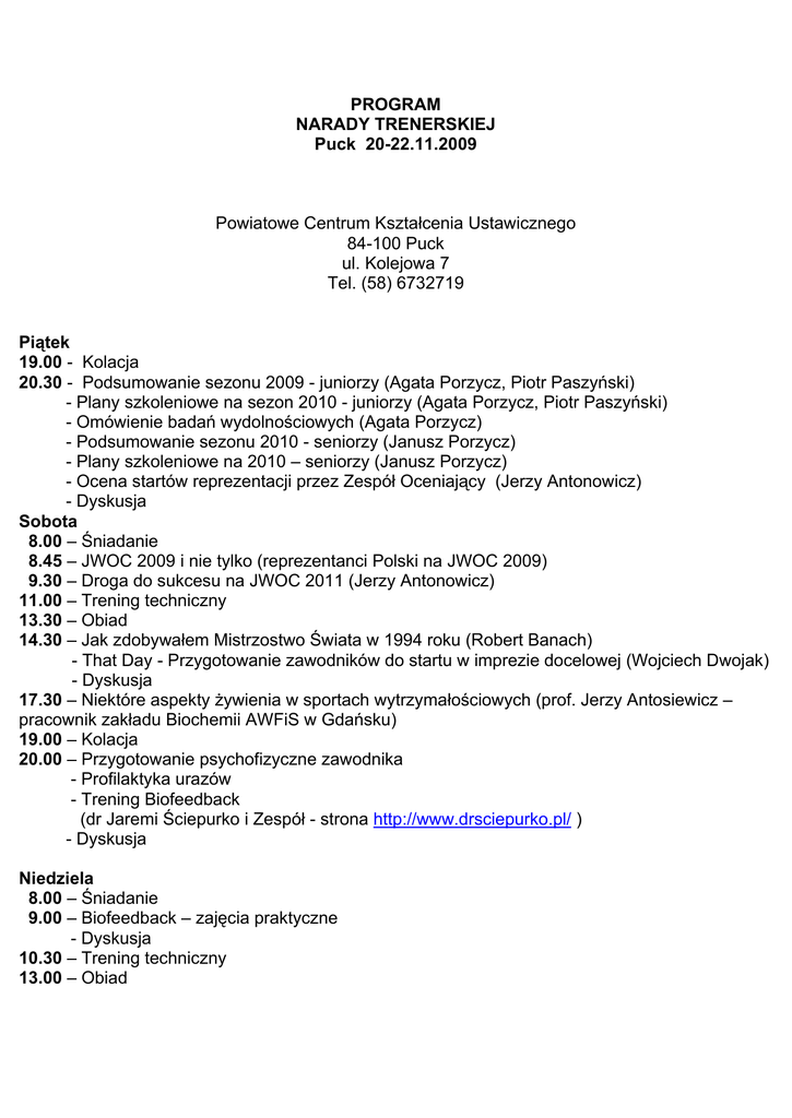 PROGRAM NARADY TRENERSKIEJ Puck 20-22.11.2009 Powiatowe Centrum Kształcenia Ustawicznego 84-100 Puck ul. Kolejowa 7 Tel. (58) 6732719 Piątek 19.00 - Kolacja 20.30 - Podsumowanie sezonu 2009 - juniorzy (Agata Porzycz, Piotr Paszyński) - Plany szkoleniowe na sezon 2010 - juniorzy (Agata Porzycz, Piotr Paszyński) - Omówienie badań wydolnościowych (Agata Porzycz) - Podsumowanie sezonu 2010 - seniorzy (Janusz Porzycz) - Plany szkoleniowe na 2010 – seniorzy (Janusz Porzycz) - Ocena startów reprezentacji przez Zespół Oceniający (Jerzy Antonowicz) - Dyskusja Sobota 8.00 – Śniadanie 8.45 – JWOC 2009 i nie tylko (reprezentanci Polski na JWOC 2009) 9.30 – Droga do sukcesu na JWOC 2011 (Jerzy Antonowicz) 11.00 – Trening techniczny 13.30 – Obiad 14.30 – Jak zdobywałem Mistrzostwo Świata w 1994 roku (Robert Banach) - That Day - Przygotowanie zawodników do startu w imprezie docelowej (Wojciech Dwojak) - Dyskusja 17.30 – Niektóre aspekty żywienia w sportach wytrzymałościowych (prof. Jerzy Antosiewicz – pracownik zakładu Biochemii AWFiS w Gdańsku) 19.00 – Kolacja 20.00 – Przygotowanie psychofizyczne zawodnika - Profilaktyka urazów - Trening Biofeedback (dr Jaremi Ściepurko i Zespół - strona http://www.drsciepurko.pl/ ) - Dyskusja Niedziela 8.00 – Śniadanie 9.00 – Biofeedback – zajęcia praktyczne - Dyskusja 10.30 – Trening techniczny 13.00 – Obiad