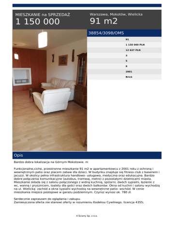 Warszawa, Mokotów, Wielicka MIESZKANIE na SPRZEDAŻ 91 m2 1 150 000 38854/3098/OMS 91 1 150 000 PLN 12 637 PLN 3 5 8 2001 Brick Opis Bardzo dobra lokalizacja na Górnym Mokotowie. m Funkcjonalne,ciche, przestronne mieszkanie 91 m2 w apartamentowcu z 2001 roku z ochroną i wewnętrznym patio oraz placem zabaw dla dzieci. W budynku znajduje się fitness club z basenem i jacuzzi. W okolicy pełna infrastruktura handlowo- usługowa, medyczna oraz edukacyjna. Bardzo dobre połączenia komunikacyjne (autobus, tramwaj, metro) z pozostałymi dzielnicami miasta. Mieszkanie składa się z salonu połączonego z widną kuchnią, spiżarni, dwóch sypialni, łazienki z wc, wanną i prysznicem, toalety dla gości oraz dwóch balkonów. Okna od kuchni i salonu wychodzą na ul. Wielicką- zachód a okna sypialni wychodzą na wewnętrzne patio- wschód. W cenie mieszkania miejsce postojowe w garażu podziemnym. Czynsz wynosi ok. 780 zł. Serdecznie zapraszam do oglądania i zakupu. Zamieszczona oferta nie stanowi oferty w rozumieniu Kodeksu Cywilnego. licencja 4355; 4 Ściany Sp. z o.o. Zapytaj naszego Agenta o pomoc w otrzymaniu kredytu !!! 4 Ściany Sp. z o.o. tel. 22 629 80 80 email: [email protected] 4 Ściany Sp. z o.o. Powered by TCPDF (www.tcpdf.org)