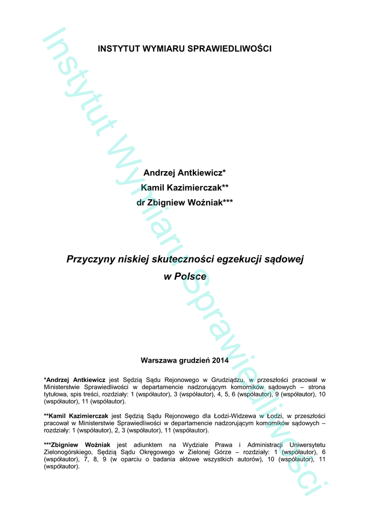 Ins INSTYTUT WYMIARU SPRAWIEDLIWO CI ut tyt m Wy Andrzej Antkiewicz* Kamil Kazimierczak** dr Zbigniew Wo niak*** uS iar Przyczyny niskiej skuteczno ci egzekucji s dowej w Polsce wie pra Warszawa grudzie 2014 dli *Andrzej Antkiewicz jest S dzi S du Rejonowego w Grudzi dzu, w przesz ci pracowa w Ministerstwie Sprawiedliwo ci w departamencie nadzoruj cym komorników s dowych – strona tytu owa, spis tre ci, rozdzia y: 1 (wspó autor), 3 (wspó autor), 4, 5, 6 (wspó autor), 9 (wspó autor), 10 (wspó autor), 11 (wspó autor). wo **Kamil Kazimierczak jest S dzi S du Rejonowego dla odzi-Widzewa w odzi, w przesz ci pracowa w Ministerstwie Sprawiedliwo ci w departamencie nadzoruj cym komorników s dowych – rozdzia y: 1 (wspó autor), 2, 3 (wspó autor), 11 (wspó autor). ***Zbigniew Wo niak jest adiunktem na Wydziale Prawa i Administracji Uniwersytetu Zielonogórskiego, S dzi S du Okr gowego w Zielonej Górze – rozdzia y: 1 (wspó autor), 6 (wspó autor), 7, 8, 9 (w oparciu o badania aktowe wszystkich autorów), 10 (wspó autor), 11 (wspó autor). ci Ins Spis tre ci 1. Wprowadzenie.................................................................................................... 1 tyt 2. Za enia poprzedzaj ce rozpocz cie bada ..................................................... 3 3. Ogólne dane statystyczne dotycz ce skuteczno ci egzekucji w Polsce............ 4 ut 4. Dane statystyczne dotycz ce skuteczno ci egzekucji w poszczególnych okr gach apelacyjnych.................................................................................... 15 m Wy 5. Opis materia u badawczego i metody prowadzenia bada ............................... 19 6. Analiza stanu prawnego pod k tem efektywno ci egzekucji ............................ 22 6.1. Wnioskowy charakter post powania egzekucyjnego .................................. 22 6.2. Ograniczenia egzekucji ............................................................................... 27 6.2.1. Ograniczenie egzekucji z wynagrodzenia za prac ................................. 27 iar 6.2.2. Ograniczenie egzekucji z rachunku bankowego ...................................... 31 6.2.3. Inne ograniczenia egzekucji .................................................................... 33 uS 7. Wp yw wyboru komornika na skuteczno egzekucji ....................................... 34 7.1. Rys historyczny regulacji instytucji wyboru komornika w Polsce ................. 34 7.2. Wst pne wyniki bada aktowych w aspekcie wyboru komornika na pra terytorium Rzeczypospolitej Polskiej .................................................................. 37 7.3. Wp yw obliczania zaleg ci przez iloraz spraw nieza atwionych do spraw za atwionych....................................................................................................... 39 wie 7.4. Pó roczna zaleg i pó roczny termin sprawozdawczy ............................. 42 7.5. Podsumowanie analizy wp ywu prawa wyboru komornika na skuteczno prowadzonej egzekucji ....................................................................................... 43 7.7 Konieczno dli 7.6 Projekt zmiany art. 8 ust. 8 u.k.s.e. – druk sejmowy 2516 ............................ 44 wprowadzenia zmian w zakresie regulacji prawa wyboru wo komornika........................................................................................................... 47 8. Wys uchanie wierzyciela przed umorzeniem post powania egzekucyjnego .... 50 9. Analiza przyczyn faktycznych nieefektywno ci egzekucji ................................. 53 10. Wnioski ........................................................................................................... 61 ci Ins 11. Zalecenia ........................................................................................................ 66 11.1. Zmiana regulacji dotycz cej prowadzenia egzekucji z wyboru .................. 66 tyt 11.2. Zmiany regulacji dotycz cych ogranicze egzekucji i wys uchania wierzyciela.......................................................................................................... 69 ut 12. Za czniki ....................................................................................................... 70 1. Ankieta do bada aktowych ........................................................................... 70 2. Tabelaryczne zestawienia badanych spraw sporz dzone wed ug ankiety przez m Wy trzech autorów.................................................................................................... 72 wo dli wie pra uS iar ci ii Ins 1. Wprowadzenie tyt dowe post powanie egzekucyjne jest ostatnim etapem post powania cywilnego, w którym dochodzi do urzeczywistnienia ochrony praw podmiotowych udzielonej ut przez s d w post powaniu rozpoznawczym. W post powaniu egzekucyjnym egzekwowane s egzekwuje si wszelkie wiadczenia, cho obowi zki pieni ne. Obowi zek wydania rzeczy, obowi zek zaniechania jest niezwykle rzadko przedmiotem post powania m Wy czynienia czy te w zdecydowanej wi kszo ci egzekucyjnego, st d opracowanie przyczyn niskiej skuteczno ci egzekucji s dowej w Polsce koncentrowa si b dzie wy cznie na egzekucji wiadcze pieni nych. Problem skuteczno ci egzekucji s dowej jest zagadnieniem o szczególnie wa kim znaczeniu. Podkre la si , e w ród miar sprawno ci post powania komorniczego ta nie najwa niejsza1, z czym trzeba si zgodzi . Miara ta powinna mie iar miara jest w bezpo redni wp yw na kszta t obowi zuj cych przepisów prawnych, albowiem bezskuteczna egzekucja nie daje adnej ochrony prawnej wierzycielom i mo e uS istotnie wp ywa na os abienie konkurencyjno ci gospodarki. Nic zatem dziwnego, e ju w pierwszych latach po transformacji ustrojowej w 1989 r. rozpocz to gruntowne badania nad skuteczno ci egzekucji wiadcze które znacznie nych dotyka rzeczywistych problemów spo ecznych jest determinowana nie tylko regulacjami prawnymi lecz tak e – wie a jej skuteczno pieni Polsce, ycie ustawy z dnia 29 sierpnia 1997 r. o komornikach s dowych i egzekucji2. Egzekucj
