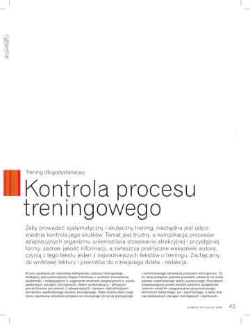 Ekwipunek FI’ZI:K TUNDRA Masa: 210 g Siodło powstało na bazie doświadczeń z wyścigowym Arione i znajdzie się oficjalnie dopiero w przyszłorocznej kolekcji. Z tego powodu nie znamy jeszcze ceny i nie możemy poddać Tundry standardowym procedurom oceniającym. Siodełko jest bardzo długie i ma blisko 30 cm, a biorąc pod uwagę fakt, że zazwyczaj siodełka mają około 25 cm, niska masa Tundry robi wrażenie. Siodło wykonano z kompozytów węglowych, podstawa jest z krótkowłóknowego kompozytu, „pręty” z plecionki kompozytowej, owinięte w miejscu styku z jarzmem tkaniną kewlarową. Pokrycie z microtexu na krawędziach chroni wzmocnienie z carbonu. Siodło jest twarde. Fi’zi:k w swojej kolekcji MTB ma dwa rodzaje siodeł: Aliante i Gobi pasują tym, którzy lubią obłe siodełka. Wierzch Tundry jest praktycznie płaski. I w ten sposób Tundra dołączyła do „górskich” Ze:ak’ów z praktycznie płaskim podparciem. To daje sensowny wybór użytkownikom o różnej budowie anatomicznej. Tundra należy do siodeł wąskich, w najszerszym miejscu ma 12,5 cm. Jednak charakterystyczny kształt i długość pozwala na modyfikacje obciążenia wrażliwych narządów. To pozwala zachować komfort nawet w czasie bardzo długich etapów. Tundra jest siodłem przeznaczonym do XC/XCM dlatego najlepiej sprawuje się przy dużym nachyleniu tułowia. Ale i w rowerach enduro, kiedy pozycja jest bardziej wyprostowana, zyskała naszą sympatię. Nawet na bardzo długich ultra-stromych odcinakach, nos jest wygodny. Działa nieco inaczej niż zwykle, bo amortyzuje nie tylko podściółka, ale i elastyczność długiego nosa. W hardtailach niezwykle przydatny jest długi i bardzo elastyczny tył siodełka. Na nierównych zjazdach wystarczy wysunąć się wstecz, żeby zmusić siodełko do filtracji nierówności. Dla nas to następca legendarnego i płaskiego Nissene, świetne siodło do długodystansowego hardtaila. Wysoka twardość podściółki sprzyja wyczynowej jeździe przy wysokiej kadencji, a kształt pozwala zmieniać pozycję, dostosowując ją do potrzeb danego odcinka, odciążając zmęczone rejony. Tekst: Miłosz Kędracki jakość materiałów i wykończenia niewielka masa kształt, umożliwiający zmiany pozycji Trening długodystansowy Kontrola procesu treningowego Żeby prowadzić systematyczny i skuteczny trening, niezbędna jest odpowiednia kontrola jego skutków. Temat jest trudny, a komplikacja procesów adaptacyjnych organizmu uniemożliwia stosowanie atrakcyjnej i przystępnej formy. Jednak jakość informacji, a zwłaszcza praktyczne wskazówki autora, czynią z tego tekstu jeden z najważniejszych tekstów o treningu. Zachęcamy do wnikliwej lektury i powrotów do niniejszego dzieła - redakcja. W celu uzyskania jak najwyższej efektywności procesu treningowego, niezbędny jest systematyczny dopływ informacji o skutkach prowadzonej działalności i następujących w organizmie zmianach adaptacyjnych w wyniku zadawanych obciążeń treningowych. Zatem systematyczny i precyzyjny proces kontroli jest jednym z najważniejszych i zarazem najtrudniejszych elementów współczesnego procesu treningowego. Stała analiza stanu organizmu sportowca umożliwia przejście od intuicyjnego do ściśle precyzyjnego i kontrolowanego kierowania procesem treningowym. Tylko takie podejście pozwala prowadzić szkolenie na miarę potrzeb współczesnego sportu wyczynowego. Prawidłowo przeprowadzany proces kontroli powinien uwzględniać zarówno wskaźniki przygotowania sprawnościowego, techniczno-taktycznego, jak i psychicznego, a także analizę stosowanych obciążeń treningowych i startowych. bi k e Boa r d # 9 w r z e sie ń 2 0 0 8 43 Nie wolno tu również pominąć bieżącej analizy ogólnego stanu zdrowia sportowca, jak i reakcji jego organizmu na zadawane obciążenia treningowe. Charakter i wielkość zadawanych obciążeń treningowych wpływa bezpośrednio na przebieg procesów adaptacyjnych, decydując o ich kierunku, dynamice, a także wielkości. Znajduje to swoje odzwierciedlenie we wskaźnikach funkcjonalnych organizmu, przy czym czas trwania poszczególnych zmian adaptacyjnych jest różny. Na tej podstawie wyróżnia się trzy stany organizmu (trwały, operacyjny, bieżący), posiadające odrębne rodzaje kontroli. Kontrola okresowa Stany trwałe charakterystyczne są dla adaptacji długotrwałej, powstającej w wyniku systematycznego treningu. Ten efekt potreningowy objęty jest kontrolą okresową, często również określaną, jako etapowa. Przeprowadza się tu przede wszystkim kontrolę stanu wytrenowania w oparciu o specjalistyczne testy sprawnościowe, jak i badania wydolnościowe. Istotne jest również, aby kontroli w tym czasie podlegał stan zdrowia sportowca (np. morfologia krwi, stężenie elektrolitów), a także poziom przygotowania techniczno-taktycznego oraz psychicznego. Zmiany adaptacji długotrwałej oceniane są kilkakrotnie w ciągu roku w wybranych punktach makrocyklu. W zależności od budowy makrocyklu, częstotliwość przeprowadzania kontroli etapowej może być różna. Oczywiście najefektywniejszym rozwiązaniem, pozwalającym „trzymać rękę na pulsie”, byłoby przeprowadzenie takiej kontroli po każdym mezocyklu treningowym. Przykładowo: wykorzystanie w tym celu badań wydolnościowych pozwoliłoby ocenić efektywność dotychczasowego treningu, jak i uzyskać przesłanki do dalszego szkolenia, a także wyznać nowe zakresy intensywności dla każdego zawodnika. Jednakże, biorąc pod uwagę znaczne koszty, bardziej ekonomicznym wariantem może być przeprowadzenie takich badań w pierwszej i drugiej fazie okresu przygotowawczego oraz na początku i w środku (na 6-5 tygodni przed zawodami głównymi) okresu startowego. Uzyskane wyniki badań wydolnościowych porównuje się z wynikami poprzednimi, zarejestrowanymi na różnych etapach treningu, a także zestawia się je z „modelem mistrza” w danej dyscyplinie 