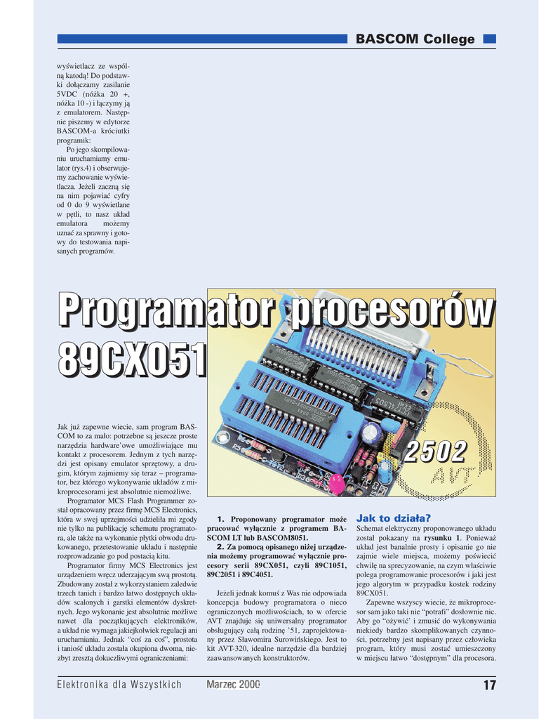 BASCOM College wyświetlacz ze wspól− ną katodą! Do podstaw− ki dołączamy zasilanie 5VDC (nóżka 20 +, nóżka 10 −) i łączymy ją z emulatorem. Następ− nie piszemy w edytorze BASCOM−a króciutki programik: Po jego skompilowa− niu uruchamiamy emu− lator (rys.4) i obserwuje− my zachowanie wyświe− tlacza. Jeżeli zaczną się na nim pojawiać cyfry od 0 do 9 wyświetlane w pętli, to nasz układ emulatora możemy uznać za sprawny i goto− wy do testowania napi− sanych programów. Programator procesorów 89CX051 Jak już zapewne wiecie, sam program BAS− COM to za mało: potrzebne są jeszcze proste narzędzia hardware'owe umożliwiające mu kontakt z procesorem. Jednym z tych narzę− dzi jest opisany emulator sprzętowy, a dru− gim, którym zajmiemy się teraz – programa− tor, bez którego wykonywanie układów z mi− kroprocesorami jest absolutnie niemożliwe. Programator MCS Flash Programmer zo− stał opracowany przez firmę MCS Electronics, która w swej uprzejmości udzieliła mi zgody nie tylko na publikację schematu programato− ra, ale także na wykonanie płytki obwodu dru− kowanego, przetestowanie układu i następnie rozprowadzanie go pod postacią kitu. Programator firmy MCS Electronics jest urządzeniem wręcz uderzającym swą prostotą. Zbudowany został z wykorzystaniem zaledwie trzech tanich i bardzo łatwo dostępnych ukła− dów scalonych i garstki elementów dyskret− nych. Jego wykonanie jest absolutnie możliwe nawet dla początkujących elektroników, a układ nie wymaga jakiejkolwiek regulacji ani uruchamiania. Jednak “coś za coś”, prostota i taniość układu została okupiona dwoma, nie− zbyt zresztą dokuczliwymi ograniczeniami: Elektronika dla Wszystkich 2502 1. Proponowany programator może pracować wyłącznie z programem BA− SCOM LT lub BASCOM8051. 2. Za pomocą opisanego niżej urządze− nia możemy programować wyłącznie pro− cesory serii 89CX051, czyli 89C1051, 89C2051 i 89C4051. Jeżeli jednak komuś z Was nie odpowiada koncepcja budowy programatora o nieco ograniczonych możliwościach, to w ofercie AVT znajduje się uniwersalny programator obsługujący całą rodzinę ’51, zaprojektowa− ny przez Sławomira Surowińskiego. Jest to kit AVT−320, idealne narzędzie dla bardziej zaawansowanych konstruktorów. Jak to działa? Schemat elektryczny proponowanego układu został pokazany na rysunku 1. Ponieważ układ jest banalnie prosty i opisanie go nie zajmie wiele miejsca, możemy poświecić chwilę na sprecyzowanie, na czym właściwie polega programowanie procesorów i jaki jest jego algorytm w przypadku kostek rodziny 89CX051. Zapewne wszyscy wiecie, że mikroproce− sor sam jako taki nie “potrafi” dosłownie nic. Aby go “ożywić’ i zmusić do wykonywania niekiedy bardzo skomplikowanych czynno− ści, potrzebny jest napisany przez człowieka program, który musi zostać umieszczony w miejscu łatwo “dostępnym” dla procesora. 17 BASCOM College Każdy mikroprocesor musi dysponować co najmniej dwoma rodzajami pamięci: pa− mięcią programu i pamięcią danych. Jako pa− mięć danych wykorzystuje się zwykle pamię− ci RAM lub/i EEPROM, umieszczone na ze− wnątrz lub wewnątrz procesora, natomiast pa− mięcią programu jest z zasady pamięć stała, obecnie najczęściej reprogramowalna (przy− najmniej w procesorach stosowanych w kon− strukcjach amatorskich). Dawniej jako repro− gramowalną pamięć programu stosowano zwykle wewnętrzne lub zewnętrzne pamięci EPROM, obecnie coraz większe uznanie uzy− skują pamięci EEPROM, których kasowanie nie wymaga stosowania specjalnych urządzeń i może odbywać się w każdym przystosowa− nym do tego celu programatorze. Zalety procesorów z pamięcią programu typu EEPROM szczególnie powinni docenić amatorzy. Taki procesor możemy przeprogra− mowywać praktycznie w nieskończoność, poprawiać napisany program i wpisywać do jego pamięci nowy. Do tego celu potrzebny nam jest jedynie programator, choćby tak ba− nalnie prosty, jak opisywany w tym artykule. Jakie czynności właściwie wykonuje pro− gramator? Przyjrzyjmy się bliżej algorytmowi programowania procesorów serii 89CX051. Pomocą będzie też rysunek 2. Po umieszcze− niu procesora przeznaczonego do zaprogra− mowania w podstawce programatora muszą zostać wykonane następujące czynności: 1. Wymuszenie stanu niskiego na wejściu RST na okres nie krótszy niż 10ms. 2. Wymuszenie stanu wysokiego na wej− ściach RST i P3.2. 3. Ustawienie odpowiedniej kombinacji sta− nów logicznych, właściwych dla funkcji, która ma zostać wykonana na wejściach P3.3, P3.4, P3.5 i P3.7. W tabeli poniżej ze− stawione zostały wszystkie tryby pracy pro− cesora podczas programowania i odpowiada− jące im stany logiczne na wejściach portu P3. 4. Programowanie i weryfikacja zapisanych danych. Na wejściach portu P1 musi zostać ustawiona kombinacja logiczna odpowiada− jąca pierwszemu bajtowi wpisywanego do pamięci programu (adres 000H). 5. Dołączenie do wejścia RST napięcia do− kładnie równego +12VDC. 6. Podanie na wejście P3.2 krótkiego impul− su ujemnego powodującego zapisanie bajtu w pamięci. Wykaz elementów Kondensatory: C1 . . . . . . . . . . . . . . . . . . . . . . . . . . . . . .100 µF/16 C4, C2 . . . . . . . . . . . . . . . . . . . . . . . . . . . . . .100nF C3 . . . . . . . . . . . . . . . . . . . . . . . . . . . . . .470 µF/25 Rezystory: RP1 . . . . . . . . . . . . . . . . . . . . . . . . .R−PPACK 10k Ω R1 . . . . . . . . . . . . . . . . . . . . . . . . . . . . . . . . .100 Ω R2 . . . . . . . . . . . . . . . . . . . . . . . . . . . . . . . . .470 Ω R3 . . . . . . . . . . . . . . . . . . . . . . . . . . . . . . . . . .2k Ω R4, R5, R6 . . . . . . . . . . . . . . . . . . . . . . . . . . .3,3k Ω Półprzewodniki: D1 . . . . . . . . . . . . . . . . . . . . . . . . . . . . . . . . . .LED D2 . . . . . . .