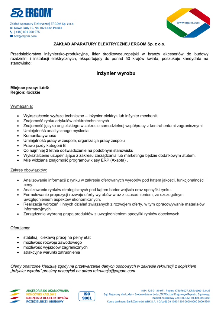 ZAKŁAD APARATURY ELEKTRYCZNEJ ERGOM Sp. z o.o. Przedsiębiorstwo inżyniersko-produkcyjne, lider środkowoeuropejski w branży akcesoriów do budowy rozdzielni i instalacji elektrycznych, eksportujący do ponad 50 krajów świata, poszukuje kandydata na stanowisko: Inżynier wyrobu Miejsce pracy: Łódź Region: łódzkie Wymagania: Wykształcenie wyższe techniczne – inżynier elektryk lub inżynier mechanik Znajomość rynku artykułów elektrotechnicznych Znajomość języka angielskiego w zakresie samodzielnej współpracy z kontrahentami zagranicznymi Umiejętność analitycznego myślenia Komunikatywność Umiejętność pracy w zespole, organizacja pracy zespołu Prawo jazdy kategorii B Co najmniej 2 letnie doświadczenie na podobnym stanowisku Wykształcenie uzupełniające z zakresu zarządzania lub marketingu będzie dodatkowym atutem. Mile widziana znajomość programów klasy ERP (Axapta) . Zakres obowiązków: Analizowanie informacji z rynku w zakresie oferowanych wyrobów pod kątem jakości, funkcjonalności i ceny. Analizowanie rynków strategicznych pod kątem barier wejścia oraz specyfiki rynku. Formułowanie propozycji rozwoju oferty wyrobów wraz z uzasadnieniem, ze szczególnym uwzględnieniem aspektów ekonomicznych. Realizacja wdrożeń i innych działań związanych z rozwojem oferty, w tym opracowywanie materiałów informacyjnych. Zarządzanie wybraną grupą produktów z uwzględnieniem specyfiki rynków docelowych. Oferujemy: stabilną i ciekawą pracę na pełny etat możliwość rozwoju zawodowego możliwość wyjazdów zagranicznych atrakcyjne warunki zatrudnienia Oferty opatrzone klauzulą zgody na przetwarzanie danych osobowych w zakresie rekrutacji z dopiskiem „Inżynier wyrobu” prosimy przesyłać na adres [email protected]