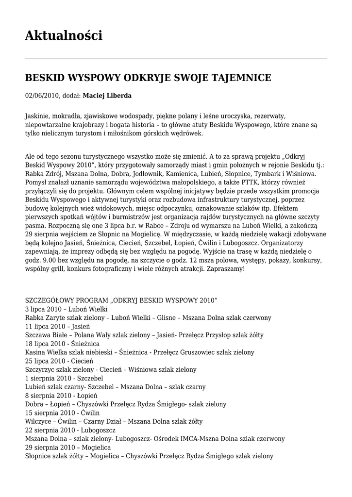 Aktualności BESKID WYSPOWY ODKRYJE SWOJE TAJEMNICE 02/06/2010, dodał: Maciej Liberda Jaskinie, mokradła, zjawiskowe wodospady, piękne polany i leśne uroczyska, rezerwaty, niepowtarzalne krajobrazy i bogata historia – to główne atuty Beskidu Wyspowego, które znane są tylko nielicznym turystom i miłośnikom górskich wędrówek. Ale od tego sezonu turystycznego wszystko może się zmienić. A to za sprawą projektu „Odkryj Beskid Wyspowy 2010”, który przygotowały samorządy miast i gmin położnych w rejonie Beskidu tj.: Rabka Zdrój, Mszana Dolna, Dobra, Jodłownik, Kamienica, Lubień, Słopnice, Tymbark i Wiśniowa. Pomysł znalazł uznanie samorządu województwa małopolskiego, a także PTTK, którzy również przyłączyli się do projektu. Głównym celem wspólnej inicjatywy będzie przede wszystkim promocja Beskidu Wyspowego i aktywnej turystyki oraz rozbudowa infrastruktury turystycznej, poprzez budowę kolejnych wież widokowych, miejsc odpoczynku, oznakowanie szlaków itp. Efektem pierwszych spotkań wójtów i burmistrzów jest organizacja rajdów turystycznych na główne szczyty pasma. Rozpoczną się one 3 lipca b.r. w Rabce – Zdroju od wymarszu na Luboń Wielki, a zakończą 29 sierpnia wejściem ze Słopnic na Mogielicę. W międzyczasie, w każdą niedzielę wakacji zdobywane będą kolejno Jasień, Śnieżnica, Ciecień, Szczebel, Łopień, Ćwilin i Lubogoszcz. Organizatorzy zapewniają, że imprezy odbędą się bez względu na pogodę. Wyjście na trasę w każdą niedzielę o godz. 9.00 bez względu na pogodę, na szczycie o godz. 12 msza polowa, występy, pokazy, konkursy, wspólny grill, konkurs fotograficzny i wiele różnych atrakcji. Zapraszamy! SZCZEGÓŁOWY PROGRAM „ODKRYJ BESKID WYSPOWY 2010” 3 lipca 2010 – Luboń Wielki Rabka Zaryte szlak zielony – Luboń Wielki – Glisne – Mszana Dolna szlak czerwony 11 lipca 2010 – Jasień Szczawa Białe – Polana Wały szlak zielony – Jasień- Przełęcz Przysłop szlak żółty 18 lipca 2010 - Śnieżnica Kasina Wielka szlak niebieski – Śnieżnica - Przełęcz Gruszowiec szlak zielony 25 lipca 2010 - Ciecień Szczyrzyc szlak zielony - Ciecień – Wiśniowa szlak zielony 1 sierpnia 2010 - Szczebel Lubień szlak czarny- Szczebel – Mszana Dolna – szlak czarny 8 sierpnia 2010 - Łopień Dobra – Łopień – Chyszówki Przełęcz Rydza Śmigłego- szlak zielony 15 sierpnia 2010 - Ćwilin Wilczyce – Ćwilin – Czarny Dział – Mszana Dolna szlak żółty 22 sierpnia 2010 - Lubogoszcz Mszana Dolna – szlak zielony- Lubogoszcz- Ośrodek IMCA-Mszna Dolna szlak czerwony 29 sierpnia 2010 – Mogielica Słopnice szlak żółty – Mogielica – Chyszówki Przełęcz Rydza Śmigłego szlak zielony Bierówka Małgorzata Źródło: Anna Strug – UG Słopnice