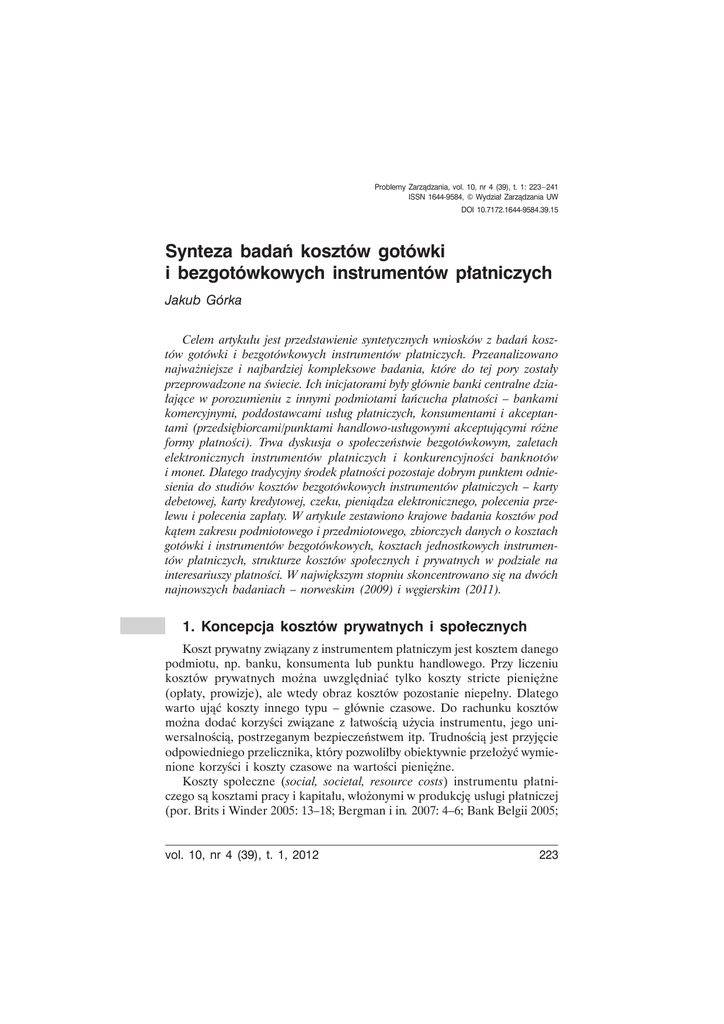 Problemy ZarzÈdzania, vol. 10, nr 4 (39), t. 1: 223 – 241 ISSN 1644-9584, © Wydziaï ZarzÈdzania UW DOI 10.7172.1644-9584.39.15 Synteza badañ kosztów gotówki i bezgotówkowych instrumentów pïatniczych Jakub Górka Celem artykuïu jest przedstawienie syntetycznych wniosków z badañ kosztów gotówki i bezgotówkowych instrumentów pïatniczych. Przeanalizowano najwaĝniejsze i najbardziej kompleksowe badania, które do tej pory zostaïy przeprowadzone na Ăwiecie. Ich inicjatorami byïy gïównie banki centralne dziaïajÈce w porozumieniu z innymi podmiotami ïañcucha pïatnoĂci – bankami komercyjnymi, poddostawcami usïug pïatniczych, konsumentami i akceptantami (przedsiÚbiorcami/punktami handlowo-usïugowymi akceptujÈcymi róĝne formy pïatnoĂci). Trwa dyskusja o spoïeczeñstwie bezgotówkowym, zaletach elektronicznych instrumentów pïatniczych i konkurencyjnoĂci banknotów ibmonet. Dlatego tradycyjny Ărodek pïatnoĂci pozostaje dobrym punktem odniesienia do studiów kosztów bezgotówkowych instrumentów pïatniczych – karty debetowej, karty kredytowej, czeku, pieniÈdza elektronicznego, polecenia przelewu i polecenia zapïaty. W artykule zestawiono krajowe badania kosztów pod kÈtem zakresu podmiotowego i przedmiotowego, zbiorczych danych o kosztach gotówki i instrumentów bezgotówkowych, kosztach jednostkowych instrumentów pïatniczych, strukturze kosztów spoïecznych i prywatnych w podziale na interesariuszy pïatnoĂci. W najwiÚkszym stopniu skoncentrowano siÚ na dwóch najnowszych badaniach – norweskim (2009) i wÚgierskim (2011). 1. Koncepcja kosztów prywatnych i spoïecznych Koszt prywatny zwiÈzany z instrumentem pïatniczym jest kosztem danego podmiotu, np. banku, konsumenta lub punktu handlowego. Przy liczeniu kosztów prywatnych moĝna uwzglÚdniaÊ tylko koszty stricte pieniÚĝne (opïaty, prowizje), ale wtedy obraz kosztów pozostanie niepeïny. Dlatego warto ujÈÊ koszty innego typu – gïównie czasowe. Do rachunku kosztów moĝna dodaÊ korzyĂci zwiÈzane z ïatwoĂciÈ uĝycia instrumentu, jego uniwersalnoĂciÈ, postrzeganym bezpieczeñstwem itp. TrudnoĂciÈ jest przyjÚcie odpowiedniego przelicznika, który pozwoliïby obiektywnie przeïoĝyÊ wymienione korzyĂci i koszty czasowe na wartoĂci pieniÚĝne. Koszty spoïeczne (social, societal, resource costs) instrumentu pïatniczego sÈ kosztami pracy i kapitaïu, wïoĝonymi w produkcjÚ usïugi pïatniczej (por.bBrits i Winder 2005: 13–18; Bergman i in. 2007: 4–6; Bank Belgii 2005; vol. 10, nr 4 (39), t. 1, 2012 223 Jakub Górka Bank Holandii 2004; Bank Australii 2007). Innymi sïowy, koszty spoïeczne sÈ wartoĂciÈ dodanÈ przynajmniej czterech gïównych interesariuszy pïatnoĂci: banku centralnego, banków komercyjnych, akceptantów, konsumentów. Wbrachunku kosztów spoïecznych eliminuje siÚ te pozycje, które dla jednej strony sÈ kosztem, a dla drugiej przychodem (np.bopïata akceptanta – koszt sklepu, przychód banku agenta rozliczeniowego, seniorat – koszt kaĝdego podmiotu posiadajÈcego gotówkÚ, przychód banku centralnego). Jeĝeli przyjmie siÚ w modelu czterech aktorów ekonomicznych, to opïaty uiszczane przez nich na rzecz poddostawców (np. firm CIT, firm procesujÈcych i hurtowo przetwarzajÈcych gotówkÚ, izb rozliczeniowych) bÚdÈ zaliczane do kosztów spoïecznych. Jednak dopiero koszty poddostawców sÈ kosztami zasobów (por. Bergman i in. 2007: 6), chociaĝ takĝe w przypadku poddostawców da siÚ dokonaÊ kolejnego rozbioru na koszty zewnÚtrzne ibwewnÚtrzne. Dobrze koncepcjÚ kosztu spoïecznego moĝna wytïumaczyÊ na przykïadzie zaczerpniÚtym z badañ holenderskich i belgijskich (Brits i Winder 2005: 13; Bank Holandii 2004; Quaden 2005; Górka 2009a: 133–134). Poszczególni interesariusze zaangaĝowani w cykl pïatnoĂci ponoszÈ okreĂlone koszty i realizujÈ pewne przychody. Koszty dzielÈ siÚ na: – zewnÚtrzne (external) – opïaty ponoszone na rzecz innych podmiotów ïañcucha pïatnoĂci; – wewnÚtrzne (internal) – koszty tzw. wartoĂci dodanej usïug pïatniczych; – caïkowite (total) – suma kosztów wewnÚtrznych i zewnÚtrznych; – caïkowite netto (total net costs) – suma kosztów caïkowitych minus suma przychodów (przychody to opïaty pobrane od innych podmiotów ïañcucha pïatnoĂci); – spoïeczne (social, societal costs) – suma kosztów wewnÚtrznych wszystkich podmiotów w ïañcuchu pïatnoĂci (koszty spoïeczne sÈ równe kosztom caïkowitym netto). Model kosztów i dochodów dla czterech gïównych aktorów obiegu pieniÚĝnego w badaniach holenderskich i belgijskich przedstawia siÚ w sposób zaprezentowany na rysunku 1. Kaĝdy z czterech aktorów (bank centralny, bank komercyjny, sklep, konsument) ponosi koszty wewnÚtrzne i zewnÚtrzne pïatnoĂci oraz realizuje pewne przychody, które sÈ kosztem zewnÚtrznym jednego z pozostaïych aktorów (rysunek 1). Moĝna podzieliÊ koszty, przychody i korzyĂci kaĝdego z uczestników cyklu pïatnoĂci na prywatne i spoïeczne, przypisujÈc je do poszczególnych instrumentów pïatniczych. Koszt moĝe byÊ spoïeczny lub prywatny, przychód jest zawsze prywatny, natomiast korzyĂÊ moĝe byÊ i prywatna, i spoïeczna. Przychód moĝna teĝ traktowaÊ jako korzyĂÊ prywatnÈ i tak byï on traktowany wb badaniach amerykañskich Garcia-Swartz i in. (2006a, 2006b) i australijskich Simes i in. (2006). KorzyĂÊ spoïeczna jest wtedy, gdy ma charakter efektu zewnÚtrznego (externality). KorzyĂÊ spoïeczna nie jest explicite ujmowana w rachunku pieniÚĝnym kosztów instrumentów pïatni224 Problemy ZarzÈdzania Synteza badañ kosztów gotówki i bezgotówkowych instrumentów pïatniczych czych. Istnieje nie tylko dla jednej jednostki, lecz dla caïej grupy. Dlatego o korzyĂciach spoïecznych moĝemy mówiÊ gïównie u konsumentów. TypowÈ korzyĂciÈ spoïecznÈ konsumentów jest szerokoĂÊ sieci akceptacyjnej danego instrumentu pïatniczeg