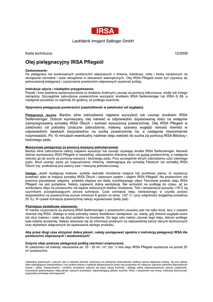 Lackfabrik Irmgard Sallinger GmbH Karta techniczna 12/2006 Olej pielęgnacyjny IRSA Pflegeöl Zastosowanie: Do pielęgnacji nie woskowanych powierzchni olejowanych z drewna, bambusa, cotto i korka narażonych na obciążenia normalne i duże obciążenia w obszarach wewnętrznych. Olej IRSA Pflegeöl może być używany do jednoczesnej pielęgnacji i czyszczenia powierzchni olejowanych (wykonać próbę). Instrukcja użycia / niezbędne przygotowania: Piasek i inne podobne zanieczyszczenia (o działaniu ściernym) usunąć za pomocą odkurzacza, miotły lub innego narzędzia. Szczególnie zabrudzone powierzchnie wyczyścić środkiem IRSA Seifenreiniger lub IRSA G 88, a następnie poczekać co najmniej 24 godziny, aż podłoga wyschnie. Optymalna pielęgnacja powierzchni (częstotliwość w zależności od wyglądu): Pielęgnacja ręczna: Bardzo silne zabrudzenia najpierw wyczyścić lub usunąć środkiem IRSA Seifenreiniger. Dobrze wymieszany olej nanieść w odpowiednio dopasowanej ilości na wstępnie zaimpregnowaną szmatkę IRSA Öltuch i wytrzeć wysuszoną powierzchnię. Olej IRSA Pflegeöl w zależności od potrzeby (znaczne zabrudzenia, matowy, szarawy wygląd) nanosić również w odpowiednich dawkach bezpośrednio na suchą powierzchnię na, a następnie równomiernie rozprowadzić. Po 10 minutach ewentualny nadmiar oleju wetrzeć do sucha za pomocą IRSA Blitzboy i beżowego padu. Maszynowa pielęgnacja za pomocą maszyny jednotarczowej Bardzo silne zabrudzenia należy najpierw wysuszyć lub usunąć używając środka IRSA Seifenreiniger. Nanieść dobrze wymieszany IRSA Pflegeöl w niewielkiej, odpowiednio dobranej ilości na suchą powierzchnię, a następnie wetrzeć go do sucha za pomocą maszyny i beżowego padu. Przy szczególnie silnym zabrudzeniu użyć zielonego padu. Brud usunąć zaraz po rozpuszczeniu chłonną, niestrzępiącą się szmatką Fliestuch lub szmatką IRSA Öltuch (np. podłożoną pod zielony pad / maszynę jednotarczową). Uwaga: Jeżeli występują matowe, wytarte wskutek chodzenia miejsca lub punktowe plamy, to wystarczy przetrzeć tylko te miejsca szmatką IRSA Öltuch / beżowym padem i olejem IRSA Pflegeöl. Na powierzchni nie powinna pozostawać wilgotna powłoka olejowa ani ślady rozchlapanego oleju! Tworzenie powłoki oleju IRSA Pflegeöl nie jest pożądane. Należy zapewnić dobrą wentylację. Nie wchodzić na podłogę do czasu, aż po wchłonięciu oleju na powierzchni nie będzie widocznych śladów chodzenia. Tlen i temperatura powyżej +18°C są czynnikami przyspieszającymi proces schnięcia. Czas schnięcia oleju naniesionego w czystej postaci bezpośrednio na powierzchnię wynosi minimum 6 godzin (w temp. +20° C i przy wilgotności względnej powietrza 55 %). W czasie schnięcia powierzchnię należy wypolerować (biały pad). Późniejsze dodatkowe olejowanie: W trackie czyszczenia za pomocą IRSA Seifenreiniger z powierzchni usuwany jest nie tylko brud, lecz z czasem również olej IRSA. Dlatego w razie potrzeby należy dodatkowo naolejować, np. wtedy, gdy drewno wygląda szaro lub zbyt matowo i stało się zbyt podatne na brudzenie. Do tego celu należy używać tego oleju, którym podłoga była natarta wcześniej. Należy stosować się do informacji podanych na odpowiedniej karcie danych technicznych oraz etykietach dołączonych do opakowania danego produktu. Aby przez długi czas utrzymać dobrą jakość, należy postępować zgodnie z instrukcją pielęgnacji IRSA dla powierzchni olejowanych i woskowanych! Zużycie oleju podczas pielęgnacji podłóg (wartości empiryczne): W zależności od metody nanoszenia ok. 10 - 25 ml / m², tzn. ½ litra oleju IRSA Pflegeöl wystarcza na ponad 20 m² powierzchni. Udzielamy pisemnych i ustnych rad w zakresie techniki użytkowej na podstawie doświadczeń według naszej najlepszej wiedzy. Są one jednak tylko niewiążącymi wskazówkami i nie zwalnia klienta z badania dostarczanych przez nas produktów we własnym zakresie odnośnie planowanych metod i celów. Zastosowanie i obróbka produktów odbywa się poza naszą kontrolą i dlatego pełną odpowiedzialność ponosi użytkownik. Oczywiście gwarantujemy stałą jakość naszych produktów, odpowiadającą jakości wzorów. Wraz z ukazaniem się nowej „Instrukcji technicznej“ poprzednia przestaje obowiązywać! Lackfabrik Irmgard Sallinger GmbH str. 2/ Karta techniczna 12/2006 Przechowywanie: Trwałość w szczelnie zamkniętym opakowaniu wynosi ok. 10 miesięcy. Ostrzeżenie Nasączone szmatki, pady i inne narzędzia przechowywać w zamkniętych pojemnikach. Olej / wosk w połączeniu z pyłem szlifierskim, szmatkami płóciennymi itp. zwilżyć wodą lub przechowywać w zamykanym wiadrze lub poddać utylizacji zgodnie z zasadami bezpieczeństwa przeciwpożarowego. W przeciwnym razie istnieje niebezpieczeństwo samozapłonu. Wskazówka: Klasa zagrożenia wody 1, kod GIS Ö60, UBA 16440310 Więcej informacji można znaleźć na etykiecie dołączonej do opakowania i karcie charakterystyki produktu. Udzielamy pisemnych i ustnych rad w zakresie techniki użytkowej na podstawie doświadczeń według naszej najlepszej wiedzy. Są one jednak tylko niewiążącymi wskazówkami i nie zwalnia klienta z badania dostarczanych przez nas produktów we własnym zakresie odnośnie planowanych metod i celów. Zastosowanie i obróbka produktów odbywa się poza naszą kontrolą i dlatego pełną odpowiedzialność ponosi użytkownik. Oczywiście gwarantujemy stałą jakość naszych produktów, odpowiadającą jakości wzorów. Wraz z ukazaniem się nowej „Instrukcji technicznej“ poprzednia przestaje obowiązywać!