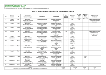 ® BIOGRADEX - HOLDING Sp. z o.o. Robotnicza 55/10, 82-300 Elbląg 055 2394300, 055 6421909, www.biogradex.pl , e-mail: [email protected] WYKAZ RUROCIĄGÓW I PRZEWODÓW TECHNOLOGICZNYCH Lp. Nazwa medium Dz 1 Ścieki surowe 160 2(*) Ścieki 139,7 3(*) Ścieki 168,3 4(*) PróŜnia 38 5(*) Ścieki oczyszczone 114,3 6(*) Ścieki 88,9 7 Ścieki 8 Oznaczenie / Nazwa rurociągu Φ160-SS1 Tłoczny do reaktora biologicznego Φ125-RO1 Recyrkulacja osadu Φ150-OW1 Dopływ do osadnika wtórnego Φ40-OW1 Przewód próŜniowy Gr. ścianki dla stali Trasa-skąd Trasa-dokąd Pompownia lokalna 1 Reaktor biologiczny komora krat 2.1 Reaktor biologiczny - komora defosfatacji 2.3 Reaktor biologiczny - Osadnik wtórny 2.7 Pomieszczenie techniczne - pompy próŜniowe P4, P5 Zbiornik wody chłodzącej pompy próŜniowe 3.8 Reaktor biologiczny komora zagęszczania osadu 2.8 Pomieszczenie techniczne – pompa osadu P6 Pomieszczenie odwadniania osadów – prasa osadu 3.3 Reaktor biologiczny komory nitryfikacji 2.5 Reaktor biologiczny komora nitryfikacji 2.5A – ruszt R1 Reaktor biologiczny komora nitryfikacji Reaktor biologiczny - Osadnik wtórny 2.7 Reaktor biologiczny ® - węzeł BIOGRADEX 2.6 Reaktor biologiczny ® - węzeł BIOGRADEX 2.6 Φ100-SO1 Odpływ ścieków oczyszczonych Φ80-ON1 Osad nadmierny Reaktor biologiczny - Osadnik wtórny 2.7 Rurociąg recyrkulacji osadu Φ125-RO1 76,1 Φ65-ON2 Osad nadmierny Ścieki 76,1 Φ65-ON2 Osad nadmierny 9(*) Powietrze 114,3 10(*) Powietrze 60,3 11(*) Powietrze 60,3 Φ100-SP1 Rozprowadzenie powietrza Φ50-SP2 Zasilanie rusztu napowietrzającego R1 Φ50-SP3 Zasilanie rusztu Reaktor biologiczny komora zagęszczania osadu 2.8 Pomieszczenie techniczne – pompa osadu P6 Pomieszczenie techniczne – dmuchawy K1, K2, K3 Rurociąg rozprowadzenia powietrza Φ100-SP1 Rurociąg rozprowadzenia 2 2 1,80 2 2 Materiał / norma Ciś. nom. [MPa] dla tworzyw PE 1,0 Pianka poliuretanowa – pomiędzy bud. pomp a wieŜą próŜniową 1.4301 / PN-EN 10088 -1 1.4301 / PN-EN 10088 -1 1.4301 / PN-EN 10088 -1 2 1.4301 / PN-EN 10088 -1 2 1.4301 / PN-EN 10088 -1 1.4301 / PN-EN 10088 -1 1.4301 / PN-EN 2 Rodzaj izolacji / Grubość Pianka poliuretanowa – na odcinku ponad terenem 1.4301 / PN-EN 10088 -1 1.4301 / PN-EN 10088 -1 1.4301 / PN-EN 10088 -1 2 2 Ciś. proj [MPa] / temp. proj. [0C] 0,09 / 120 Zadanie Umowa Rewizja Strona Stron Budowa oczyszczalni ścieków dla aglomeracji Naczęsławice 55/07 0 1 3 ® BIOGRADEX - HOLDING Sp. z o.o. Robotnicza 55/10, 82-300 Elbląg 055 2394300, 055 6421909, www.biogradex.pl , e-mail: [email protected] powietrza Φ100-SP1 Rurociąg rozprowadzenia powietrza Φ100-SP1 Rurociąg rozprowadzenia powietrza Φ100-SP1 Rurociąg rozprowadzenia powietrza Φ100-SP1 napowietrzającego R2 Φ50-SP4 Zasilanie rusztu napowietrzającego R3 Φ50-SP5 Zasilanie rusztu napowietrzającego R4 Φ20-SP6 Zasilanie podnośnika mamutowego recyrkulacji denitryfikacyjnej Φ20-SP7 Zasilanie podnośnika mamutowego Rurociąg rozprowadzenia powietrza Φ100-SP1 20 Φ20-SP8 Zasilanie podnośnika mamutowego Rurociąg rozprowadzenia powietrza Φ100-SP1 Powietrze 20 Φ20-SP9 Zasilanie podnośnika mamutowego Rurociąg rozprowadzenia powietrza Φ100-SP1 18(*) Powietrze 15 19(*) Powietrze 20 Rurociąg rozprowadzenia powietrza Φ100-SP1 Rurociąg rozprowadzenia powietrza Φ100-SP1 20 Polimer Φ15-SP10 Zasilanie systemu mieszania Φ20-SP11 Zasilanie podnośnika mamutowego recyrkulacji osadu Φ15-CH1 Dawkowanie polimeru 21(*) Ścieki 20 22(*) Ścieki 20 23(*) Ścieki 20 12(*) Powietrze 60,3 13(*) Powietrze 60,3 14(*) Powietrze 20 15(*) Powietrze 20 16(*) Powietrze 17(*) Φ15-OR1 Odwodnienie rusztu napowietrzającego R1 Φ15-OR2 Odwodnienie rusztu napowietrzającego R1 Φ15-OR3 Odwodnienie rusztu napowietrzającego R1 Pomieszczenie techniczne - zbiornik polimeru 3.7 Reaktor biologiczny komora nitryfikacji 2.5A – ruszt R1 Reaktor biologiczny komora nitryfikacji 2.5A – ruszt R2 Reaktor biologiczny komora nitryfikacji 2.5B – ruszt R3 2.5A – ruszt R2 Reaktor biologiczny komora nitryfikacji 2.5B – ruszt R3 Reaktor biologiczny komora nitryfikacji 2.5B – ruszt R4 Reaktor biologiczny komora nitryfikacji 2.5B – podnośnik mamutowy Reaktor biologiczny komora denitryfikacji 2.4 – podnośnik mamutowy Reaktor biologiczny komora denitryfikacji 2.4 – podnośnik mamutowy Reaktor biologiczny komora defosfatacji 2.3 – podnośnik mamutowy Reaktor biologiczny piaskownik 2.2 – system mieszania Reaktor biologiczny Osadnik wtórny 2.7 – podnośnik mamutowy Pomieszczenie odwadniania osadów – przewód osadu nadmiernego Φ65-ON2 Reaktor biologiczny komora nitryfikacji 2.5A Reaktor biologiczny komora nitryfikacji 2.5A Reaktor biologiczny komora nitryfikacji 2.5B 2 2 1,50 1,50 1,50 10088 -1 1.4301 / PN-EN 10088 -1 1.4301 / PN-EN 10088 -1 PE 6 PE 6 PE 6 PE 6 PE 6 PE 6 PE 6 1.4301 / PN-EN 10088 -1 1.4301 / PN-EN 10088 -1 1.4301 / PN-EN 10088 -1 Zadanie Umowa Rewizja Strona Stron Budowa oczyszczalni ścieków dla aglomeracji Naczęsławice 55/07 0 2 3 ® BIOGRADEX - HOLDING Sp. z o.o. Robotnicza 55/10, 82-300 Elbląg 055 2394300, 055 6421909, www.biogradex.pl , e-mail: [email protected] 24(*) Ścieki 20 Φ15-OR4 Odwodnienie rusztu napowietrzającego R1 Φ50-PI1 Zrzut piasku 25 Ścieki 60,3 114,3 26 Ścieki 114,3 Φ100-PI2 Odcieki z odwadniania piasku 27(*) Ścieki 60,3 Φ50-WN1 Spust wód nadosadowych 28(*) Ścieki 60,3 Φ50-WN1 Spust wód nadosadowych 29(*) Ścieki 60,3 Φ50-WN1 Spust wód nadosadowych 30(*) Woda robocza 40 Φ1 ½”-PR3 Chłodzenie próŜniówek 31(*) Woda robocza 40 Φ40-PR2 Wyrzut wody roboczej próŜniówek 32(*) Ścieki 168,3 Φ150-RD1 Recyrkulacja denityfikacyjna Reaktor biologiczny komora nitryfikacji 2.5B – ruszt R4 Reaktor biologiczny Piaskownik – pompa piasku P3 Zadaszenie na odbiór piasku – separator piasku 4.2.1 Reaktor biologiczny komora zagęszczania osadu 2.8 Reaktor biologiczny komora zagęszczania osadu 2.8 Reaktor biologiczny komora zagęszczania osadu 2.8 Z