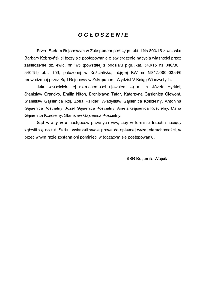 OGŁOSZENIE Przed Sądem Rejonowym w Zakopanem pod sygn. akt. I Ns 803/15 z wniosku Barbary Kobrzyńskiej toczy się postępowanie o stwierdzenie nabycia własności przez zasiedzenie dz. ewid. nr 195 (powstałej z podziału p.gr.l.kat. 340/15 na 340/30 i 340/31) obr. 153, położonej w Kościelisku, objętej KW nr NS1Z/00000383/6 prowadzonej przez Sąd Rejonowy w Zakopanem, Wydział V Ksiąg Wieczystych. Jako właściciele tej nieruchomości ujawnieni są m. in. Józefa Hyrkiel, Stanisław Grandys, Emilia Nitoń, Bronisława Tatar, Katarzyna Gąsienica Giewont, Stanisław Gąsienica Roj, Zofia Palider, Władysław Gąsienica Kościelny, Antonina Gąsienica Kościelny, Józef Gąsienica Kościelny, Aniela Gąsienica Kościelny, Maria Gąsienica Kościelny, Stanisław Gąsienica Kościelny. Sąd w z y w a następców prawnych w/w, aby w terminie trzech miesięcy zgłosili się do tut. Sądu i wykazali swoje prawa do opisanej wyżej nieruchomości, w przeciwnym razie zostaną oni pominięci w toczącym się postępowaniu. SSR Bogumiła Wójcik