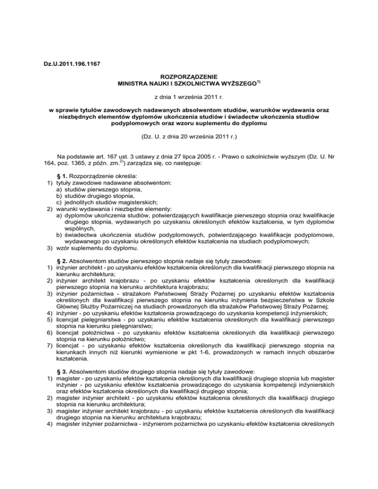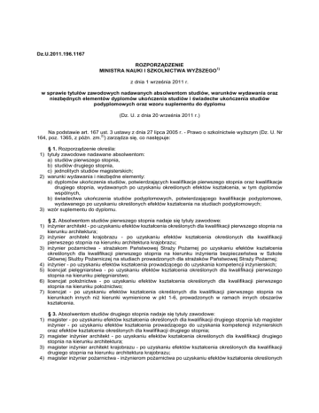 Dz.U.2011.196.1167 ROZPORZĄDZENIE 1) MINISTRA NAUKI I SZKOLNICTWA WYśSZEGO z dnia 1 września 2011 r. w sprawie tytułów zawodowych nadawanych absolwentom studiów, warunków wydawania oraz niezbędnych elementów dyplomów ukończenia studiów i świadectw ukończenia studiów podyplomowych oraz wzoru suplementu do dyplomu (Dz. U. z dnia 20 września 2011 r.) Na podstawie art. 167 ust. 3 ustawy z dnia 27 lipca 2005 r. - Prawo o szkolnictwie wyŜszym (Dz. U. Nr 2) 164, poz. 1365, z późn. zm. ) zarządza się, co następuje: § 1. Rozporządzenie określa: 1) tytuły zawodowe nadawane absolwentom: a) studiów pierwszego stopnia, b) studiów drugiego stopnia, c) jednolitych studiów magisterskich; 2) warunki wydawania i niezbędne elementy: a) dyplomów ukończenia studiów, potwierdzających kwalifikacje pierwszego stopnia oraz kwalifikacje drugiego stopnia, wydawanych po uzyskaniu określonych efektów kształcenia, w tym dyplomów wspólnych, b) świadectwa ukończenia studiów podyplomowych, potwierdzającego kwalifikacje podyplomowe, wydawanego po uzyskaniu określonych efektów kształcenia na studiach podyplomowych; 3) wzór suplementu do dyplomu. § 2. Absolwentom studiów pierwszego stopnia nadaje się tytuły zawodowe: 1) inŜynier architekt - po uzyskaniu efektów kształcenia określonych dla kwalifikacji pierwszego stopnia na kierunku architektura; 2) inŜynier architekt krajobrazu - po uzyskaniu efektów kształcenia określonych dla kwalifikacji pierwszego stopnia na kierunku architektura krajobrazu; 3) inŜynier poŜarnictwa - straŜakom Państwowej StraŜy PoŜarnej po uzyskaniu efektów kształcenia określonych dla kwalifikacji pierwszego stopnia na kierunku inŜynieria bezpieczeństwa w Szkole Głównej SłuŜby PoŜarniczej na studiach prowadzonych dla straŜaków Państwowej StraŜy PoŜarnej; 4) inŜynier - po uzyskaniu efektów kształcenia prowadzącego do uzyskania kompetencji inŜynierskich; 5) licencjat pielęgniarstwa - po uzyskaniu efektów kształcenia określonych dla kwalifikacji pierwszego stopnia na kierunku pielęgniarstwo; 6) licencjat połoŜnictwa - po uzyskaniu efektów kształcenia określonych dla kwalifikacji pierwszego stopnia na kierunku połoŜnictwo; 7) licencjat - po uzyskaniu efektów kształcenia określonych dla kwalifikacji pierwszego stopnia na kierunkach innych niŜ kierunki wymienione w pkt 1-6, prowadzonych w ramach innych obszarów kształcenia. § 3. Absolwentom studiów drugiego stopnia nadaje się tytuły zawodowe: 1) magister - po uzyskaniu efektów kształcenia określonych dla kwalifikacji drugiego stopnia lub magister inŜynier - po uzyskaniu efektów kształcenia prowadzącego do uzyskania kompetencji inŜynierskich oraz efektów kształcenia określonych dla kwalifikacji drugiego stopnia; 2) magister inŜynier architekt - po uzyskaniu efektów kształcenia określonych dla kwalifikacji drugiego stopnia na kierunku architektura; 3) magister inŜynier architekt krajobrazu - po uzyskaniu efektów kształcenia określonych dla kwalifikacji drugiego stopnia na kierunku architektura krajobrazu; 4) magister inŜynier poŜarnictwa - inŜynierom poŜarnictwa po uzyskaniu efektów kształcenia określonych 5) 6) 7) 8) dla kwalifikacji drugiego stopnia na kierunku inŜynieria bezpieczeństwa w Szkole Głównej SłuŜby PoŜarniczej; magister pielęgniarstwa - po uzyskaniu efektów kształcenia określonych dla kwalifikacji drugiego stopnia na kierunku pielęgniarstwo; magister połoŜnictwa - po uzyskaniu efektów kształcenia określonych dla kwalifikacji drugiego stopnia na kierunku połoŜnictwo; magister sztuki - po uzyskaniu efektów kształcenia określonych dla kwalifikacji drugiego stopnia na kierunkach w ramach obszaru sztuki; magister - po uzyskaniu efektów kształcenia określonych dla kwalifikacji drugiego stopnia na kierunkach innych niŜ kierunki wymienione w pkt 5-7, prowadzonych w ramach innych obszarów kształcenia. § 4. Absolwentom jednolitych studiów magisterskich nadaje się tytuły zawodowe: 1) lekarz - po uzyskaniu efektów kształcenia określonych dla jednolitych studiów magisterskich na kierunku lekarskim; 2) lekarz dentysta - po uzyskaniu efektów kształcenia określonych dla jednolitych studiów magisterskich na kierunku lekarsko-dentystycznym; 3) lekarz weterynarii - po uzyskaniu efektów kształcenia określonych dla jednolitych studiów magisterskich na kierunku weterynaria; 4) magister farmacji - po uzyskaniu efektów kształcenia określonych dla jednolitych studiów magisterskich na kierunku farmacja; 5) magister sztuki - po uzyskaniu efektów kształcenia określonych dla jednolitych studiów magisterskich na kierunkach w ramach obszaru sztuki; 6) magister - po uzyskaniu efektów kształcenia określonych dla jednolitych studiów magisterskich na kierunkach innych niŜ kierunki wymienione w pkt 1-5, prowadzonych w ramach innych obszarów kształcenia. § 5. Warunkiem wydania dyplomu ukończenia studiów wyŜszych jest uzyskanie określonych w programie kształcenia efektów kształcenia i wymaganej liczby punktów ECTS, o których mowa w art. 2 ust. 1 pkt 18d ustawy z dnia 27 lipca 2005 r. - Prawo o szkolnictwie wyŜszym, odbycie przewidzianych w programie kształcenia praktyk, złoŜenie egzaminu dyplomowego oraz pracy dyplomowej. § 6. Warunkiem wydania świadectwa ukończenia studiów podyplomowych jest uzyskanie określonych w programie kształcenia tych studiów efektów kształcenia i co najmniej 60 punktów ECTS, złoŜenie egzaminów oraz złoŜenie pracy końcowej lub egzaminu końcowego, jeŜeli przewiduje to program kształcenia studiów podyplomowych. § 7. 1. Dyplom ukończenia studiów wyŜszych zawiera następujące niezbędne elementy: 1) godło uczelni umieszczone w widocznym miejscu oraz informację o treści: "Wydany w Rzeczypospolitej Polskiej"; 2) nazwę uczelni wydającej dyplom lub nazwy uczelni i instytucji naukowych prowadzących studia wspólnie oraz nazwę podstawo