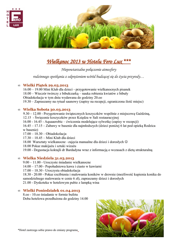 Wielkanoc 2013 w Hotelu Fero Lux *** Niepowtarzalne połączenie atmosfery rodzinnego spotkania z odprężeniem wśród budzącej się do życia przyrody… • Wielki Piątek 29.03.2013 16.00 – 19.00 Mini Klub dla dzieci - przygotowanie wielkanocnych pisanek 18.00 – Wieczór twórczy z bibułczarką – nauka robienia kwiatów z bibuły Obiadokolacja w tym dniu wydawana do godziny 20.oo 19.30 – Zapraszamy na rytuał saunowy (zapisy na recepcji, ograniczona ilość miejsc) • Wielka Sobota 30.03.2013 9.30 – 12.00 - Przygotowanie świątecznych koszyczków wspólnie z miejscową Gaździną, 12.15 - Święcenie koszyczków przez Księdza w Sali restauracyjnej 16.00 - 16.45 - Aquaaerobic – ćwiczenia modelujące sylwetkę (zapisy w recepcji) 16.45 – 17.15 – Zabawy w basenie dla najmłodszych (dzieci poniżej 6 lat pod opieką Rodzica w basenie) 17.00 – 18.30 – Obiadokolacja 17.30 – 18.45 – Mini Klub dla dzieci 18.00 Warsztaty wielkanocne –zajęcia manualne dla dzieci i dorosłych 18.00 Pokaz makijażu i sztuki wizażu 19.00 - Degustacja koktajli dr Bardadyna wraz z informacją o wczasach z dietą strukturalną • Wielka Niedziela 31.03.2013 9.00 – 11.00 - Uroczyste śniadanie wielkanocne 14.00 – 17.00 - Popołudniowa kawa i ciasto w kawiarni 17.00 – 18.30 - Uroczysta obiadokolacja 18.30 - 20.00 - Pokaz rzeźbienia i malowania koników w drewnie (możliwość kupienia konika do samodzielnego malowania w cenie 6 zł), zapraszamy dzieci i dorosłych 21.00 - Dyskoteka w hotelowym pubie z lampką wina • Wielki Poniedziałek 01.04.2013 8.oo - 10.oo śniadanie w formie bufetu Doba hotelowa przedłużona do godziny 14.00 *Hotel zastrzega sobie prawo do zmiany programu CENNIK (pakiety 3-dniowe w terminie 29.03 do 1.04.2013) DOBA STUDIO CZTEROOSOBOWE 870 PAKIET 3 – DNIOWY (obejmujący 3 noclegi i atrakcyjny program) 2570 POKÓJ DWUOSOBOWY LUX 480 1430 POKÓJ DWUOSOBOWY STANDARD 410 1160 POKÓJ JEDNOOSOBOWY 250 740 KOSZT POBYTU DODATKOWEJ OSOBY 85 230 UWAGI DO CENNIKÓW: Dzieci do 3 lat pobyt gratis (bez świadczeń). Dzieci w wieku 4-6 lat 50% kosztów dostawki. W cenie: nocleg, śniadanie (8.oo-10.oo), obiadokolacja (17.oo-18.3o), dodatkowo basen (8.oo-22.oo) i sauna (15.oo- 22.oo), cafe-internet, parking. Cena nie obejmuje opłaty klimatycznej. W przypadku nie skorzystania z posiłków, cena nie ulega zmianie. Warunkiem rezerwacji jest wpłacenie zadatku. Doba hotelowa trwa od 16.oo do 12.oo Możliwy przyjazd ze zwierzętami cena 70 zł / doba (300 zł / pakiet 7-dni) Polecamy zabiegi w GABINECIE ODNOWY BIOLOGICZNEJ SPA (dodatkowa odpłatność) KONTAKT: HOTEL FERO LUX *** KORBIELÓW, UL. SZCZYRBOK 62 TEL. (FAX) 033/ 8636023 - 24 e-mail: [email protected] www.ferosystem.pl
