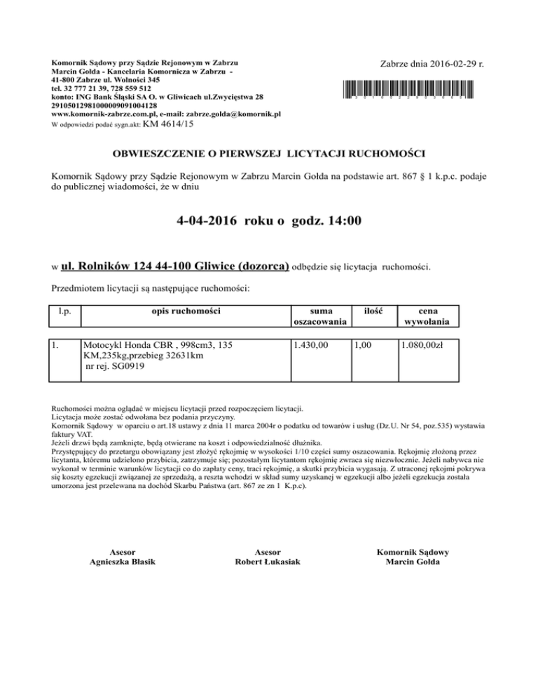 Komornik Sądowy przy Sądzie Rejonowym w Zabrzu Marcin Gołda - Kancelaria Komornicza w Zabrzu 41-800 Zabrze ul. Wolności 345 tel. 32 777 21 39, 728 559 512 konto: ING Bank Śląski SA O. w Gliwicach ul.Zwycięstwa 28 29105012981000009091004128 www.komornik-zabrze.com.pl, e-mail: [email protected] W odpowiedzi podać sygn.akt: KM Zabrze dnia 2016-02-29 r. *3016022903665* 4614/15 OBWIESZCZENIE O PIERWSZEJ LICYTACJI RUCHOMOŚCI Komornik Sądowy przy Sądzie Rejonowym w Zabrzu Marcin Gołda na podstawie art. 867 § 1 k.p.c. podaje do publicznej wiadomości, że w dniu 4-04-2016 roku o godz. 14:00 w ul. Rolników 124 44-100 Gliwice (dozorca) odbędzie się licytacja ruchomości. Przedmiotem licytacji są następujące ruchomości: l.p. 1. opis ruchomości Motocykl Honda CBR , 998cm3, 135 KM,235kg,przebieg 32631km nr rej. SG0919 suma oszacowania 1.430,00 ilość 1,00 cena wywołania 1.080,00zł Ruchomości można oglądać w miejscu licytacji przed rozpoczęciem licytacji. Licytacja może zostać odwołana bez podania przyczyny. Komornik Sądowy w oparciu o art.18 ustawy z dnia 11 marca 2004r o podatku od towarów i usług (Dz.U. Nr 54, poz.535) wystawia faktury VAT. Jeżeli drzwi będą zamknięte, będą otwierane na koszt i odpowiedzialność dłużnika. Przystępujący do przetargu obowiązany jest złożyć rękojmię w wysokości 1/10 części sumy oszacowania. Rękojmię złożoną przez licytanta, któremu udzielono przybicia, zatrzymuje się; pozostałym licytantom rękojmię zwraca się niezwłocznie. Jeżeli nabywca nie wykonał w terminie warunków licytacji co do zapłaty ceny, traci rękojmię, a skutki przybicia wygasają. Z utraconej rękojmi pokrywa się koszty egzekucji związanej ze sprzedażą, a reszta wchodzi w skład sumy uzyskanej w egzekucji albo jeżeli egzekucja została umorzona jest przelewana na dochód Skarbu Państwa (art. 867 ze zn 1 K.p.c). Asesor Agnieszka Błasik Asesor Robert Łukasiak Komornik Sądowy Marcin Gołda