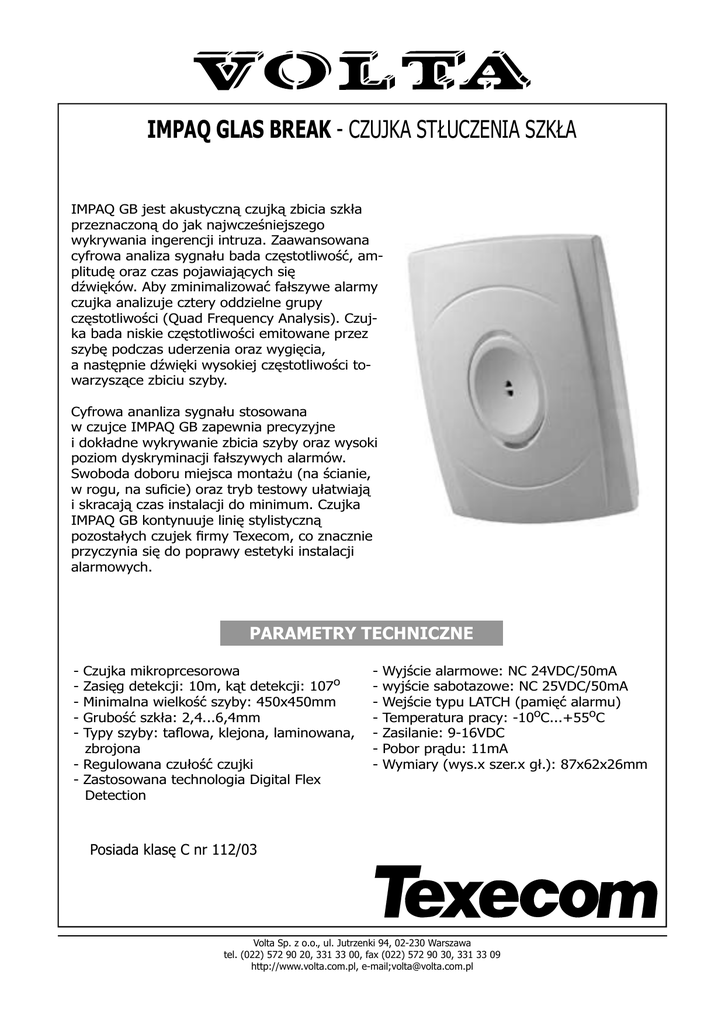IMPAQ GLAS BREAK - CZUJKA STŁUCZENIA SZKŁA IMPAQ GB jest akustyczną czujką zbicia szkła przeznaczoną do jak najwcześniejszego wykrywania ingerencji intruza. Zaawansowana cyfrowa analiza sygnału bada częstotliwość, amplitudę oraz czas pojawiających się dźwięków. Aby zminimalizować fałszywe alarmy czujka analizuje cztery oddzielne grupy częstotliwości (Quad Frequency Analysis). Czujka bada niskie częstotliwości emitowane przez szybę podczas uderzenia oraz wygięcia, a następnie dźwięki wysokiej częstotliwości towarzyszące zbiciu szyby. Cyfrowa ananliza sygnału stosowana w czujce IMPAQ GB zapewnia precyzyjne i dokładne wykrywanie zbicia szyby oraz wysoki poziom dyskryminacji fałszywych alarmów. Swoboda doboru miejsca montażu (na ścianie, w rogu, na suficie) oraz tryb testowy ułatwiają i skracają czas instalacji do minimum. Czujka IMPAQ GB kontynuuje linię stylistyczną pozostałych czujek firmy Texecom, co znacznie przyczynia się do poprawy estetyki instalacji alarmowych. PARAMETRY TECHNICZNE - Czujka mikroprcesorowa Zasięg detekcji: 10m, kąt detekcji: 107o Minimalna wielkość szyby: 450x450mm Grubość szkła: 2,4...6,4mm Typy szyby: taflowa, klejona, laminowana, zbrojona - Regulowana czułość czujki - Zastosowana technologia Digital Flex Detection - Wyjście alarmowe: NC 24VDC/50mA wyjście sabotazowe: NC 25VDC/50mA Wejście typu LATCH (pamięć alarmu) Temperatura pracy: -10oC...+55oC Zasilanie: 9-16VDC Pobor prądu: 11mA Wymiary (wys.x szer.x gł.): 87x62x26mm Posiada klasę C nr 112/03 Volta Sp. z o.o., ul. Jutrzenki 94, 02-230 Warszawa tel. (022) 572 90 20, 331 33 00, fax (022) 572 90 30, 331 33 09 http://www.volta.com.pl, e-mail;[email protected]