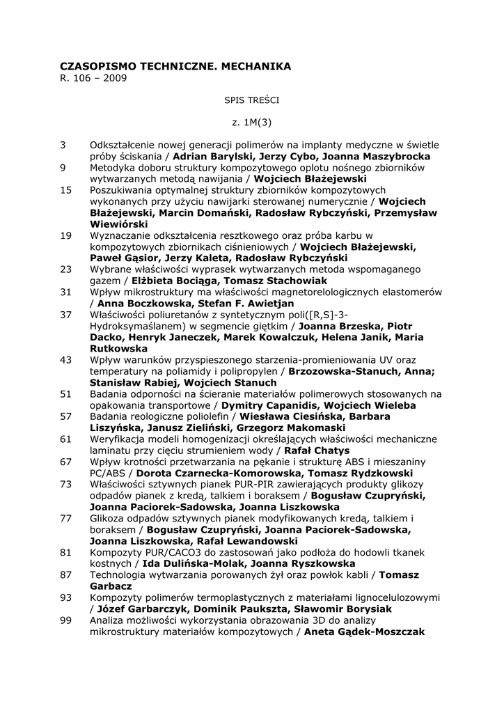 CZASOPISMO TECHNICZNE. MECHANIKA R. 106 – 2009 SPIS TREŚCI z. 1M(3) 3 9 15 19 23 31 37 43 51 57 61 67 73 77 81 87 93 99 Odkształcenie nowej generacji polimerów na implanty medyczne w świetle próby ściskania / Adrian Barylski, Jerzy Cybo, Joanna Maszybrocka Metodyka doboru struktury kompozytowego oplotu nośnego zbiorników wytwarzanych metodą nawijania / Wojciech BłaŜejewski Poszukiwania optymalnej struktury zbiorników kompozytowych wykonanych przy uŜyciu nawijarki sterowanej numerycznie / Wojciech BłaŜejewski, Marcin Domański, Radosław Rybczyński, Przemysław Wiewiórski Wyznaczanie odkształcenia resztkowego oraz próba karbu w kompozytowych zbiornikach ciśnieniowych / Wojciech BłaŜejewski, Paweł Gąsior, Jerzy Kaleta, Radosław Rybczyński Wybrane właściwości wyprasek wytwarzanych metoda wspomaganego gazem / ElŜbieta Bociąga, Tomasz Stachowiak Wpływ mikrostruktury ma właściwości magnetorelologicznych elastomerów / Anna Boczkowska, Stefan F. Awietjan Właściwości poliuretanów z syntetycznym poli([R,S]-3Hydroksymaślanem) w segmencie giętkim / Joanna Brzeska, Piotr Dacko, Henryk Janeczek, Marek Kowalczuk, Helena Janik, Maria Rutkowska Wpływ warunków przyspieszonego starzenia-promieniowania UV oraz temperatury na poliamidy i polipropylen / Brzozowska-Stanuch, Anna; Stanisław Rabiej, Wojciech Stanuch Badania odporności na ścieranie materiałów polimerowych stosowanych na opakowania transportowe / Dymitry Capanidis, Wojciech Wieleba Badania reologiczne poliolefin / Wiesława Ciesińska, Barbara Liszyńska, Janusz Zieliński, Grzegorz Makomaski Weryfikacja modeli homogenizacji określających właściwości mechaniczne laminatu przy cięciu strumieniem wody / Rafał Chatys Wpływ krotności przetwarzania na pękanie i strukturę ABS i mieszaniny PC/ABS / Dorota Czarnecka-Komorowska, Tomasz Rydzkowski Właściwości sztywnych pianek PUR-PIR zawierających produkty glikozy odpadów pianek z kredą, talkiem i boraksem / Bogusław Czupryński, Joanna Paciorek-Sadowska, Joanna Liszkowska Glikoza odpadów sztywnych pianek modyfikowanych kredą, talkiem i boraksem / Bogusław Czupryński, Joanna Paciorek-Sadowska, Joanna Liszkowska, Rafał Lewandowski Kompozyty PUR/CACO3 do zastosowań jako podłoŜa do hodowli tkanek kostnych / Ida Dulińska-Molak, Joanna Ryszkowska Technologia wytwarzania porowanych Ŝył oraz powłok kabli / Tomasz Garbacz Kompozyty polimerów termoplastycznych z materiałami lignocelulozowymi / Józef Garbarczyk, Dominik Paukszta, Sławomir Borysiak Analiza moŜliwości wykorzystania obrazowania 3D do analizy mikrostruktury materiałów kompozytowych / Aneta Gądek-Moszczak 105 111 119 125 137 141 145 153 157 163 171 181 187 191 195 201 205 211 215 221 Elastooptyka i analiza numeryczna stanu napręŜeń w badaniach polistyrenu metodą DMTA / Adam Gnatowski, Paweł Palutkiewicz, Tomasz Stachowiak Trwałość zmęczeniowa tworzyw adhezyjnych / Jan Godzimrski, Marek Rośkowicz Wpływ modyfikacji włókien naturalnych na właściwości kompozytów biodegradowalnych na osnowie PLA / Andrzej Iwańczuk, Marek Kozłowski, Stanisław Frąckowiak Ocena efektywności kształtu i pola przekroju kanałów doprowadzających tworzywo w formie wtryskowej / Tomasz Jaruga, Włodzimierz Baranowski Wpływ modyfikatorów na mechaniczne właściwości polimerobetonów z recyklatem poliestrowoszklanym / Mariola Jastrzębska, Maria Rutkowska, Wojciech Jurczak Wpływ modyfikowanych polo(silseskwioksanów) na właściwości nanokompozytów / Regina Jeziórska, Barbara Świerz-Motysia, Agnieszka Szadkowska Niektóre aspekty badań palności kompozytów polimerowych / Bolesław Jurkowski, Barbara Jurkowska, Henryk Rydarowski Charakterystyka ochładzania wytłoczyn o kształtach złoŜonych / Tomasz Klepka Wybrane właściwości mieszaniny PP/PS w funkcji krotności przetwórstwa / Arkadiusz Kloziński, Paulina Jakubowska Kształtowanie właściwości energetycznych warstwy wierzchniej tworzyw polimerowych w procesie ozonowania / Mariusz Kłonica, Józef Kuczmaszewski Modelowanie i ocena napręŜeń resztkowych w komponentach Ŝywicznych / Grzegorz Kmita, Tomasz Nowak, Robert Sekuła, Yoshihisa Katakura Recykling materiałowy odpadów TETRA-PAKU / Kinga Korniejenko, Stanisław Kuciel, Janusz Mikuła Kalorymetryczna ocena polistyrenu na krystalizację polipropylenu / Artur Kościuszko, Paulina Jakubowska, Arkadiusz Kloziński, Tomasz Sterzyński Stanowisko do badania współczynnika tarcia statycznego par trących typu: metal-polimer / Piotr Kowalewski, Wojciech Wieleba Wpływ biodegradacji na właściwości kompozytów na osnowie termoplastycznej Krobi napełnionej włóknami kenafu lub mączki drzewnej / Stanisław Kuciel, Aneta Liber-Kneć, Stanisław Zajchowski Wpływ temperatury na zmianę właściwości kompozytów PP z włóknami naturalnymi / Stanisław Kuciel, Aneta Liber-Kneć, Stanisław Zajchowski Podatność energetyczna pouŜytkowych tworzyw polimerowych / Marek Macko, Józef Flizikowski Termoochronne właściwości kompozytów epoksydowych z glinokrzemianami warstwowymi / Mariusz Majewski, Michał Przerwa, Wojciech Kucharczyk Zastosowanie techniki mikroidentacji do oceny modyfikacji radiacyjnej UHMW polietylenu w aspekcie ograniczenia skutków deformacji plastycznej polimerowych elementów endoprotez / Joanna Maszybrocka, Jerzy Cybo, Adrian Barylski Kompozyty poliuretanowo-gumowe wulkanizowane siarką / Adam Matkowski, Adolf Balas, Przemysław Sielicki, Helena Janik 229 237 241 245 249 255 259 267 273 281 287 295 301 307 313 317 323 331 337 343 349 355 361 Technologia otrzymywania nanokompozytów poliamidowomontmorylonitowych / Kinga Mencel, Krystyna Kelar, Bolesław Jurkowski Energia aktywacji dla kompozytów termoplastycznych / Renata Porębska Oryginalna metoda badań drgań w polimerach w funkcji częstości i temperatury na jednej próbce / Renata Porębska Energia dyssypacji w kompozytach polimerowych / Renata Porębska, Stanisław Mazurkiewicz