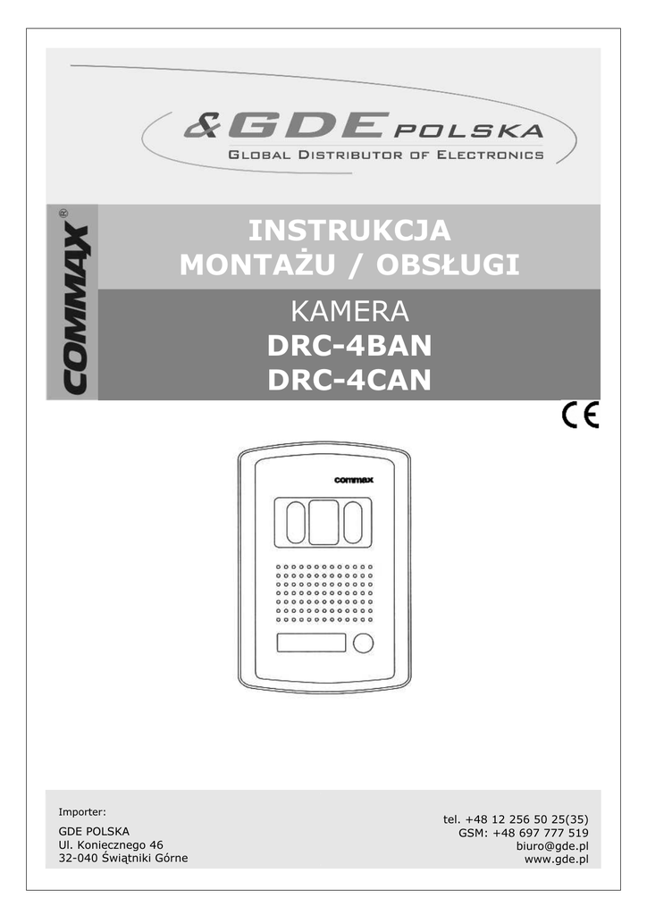 INSTRUKCJA MONTAśU / OBSŁUGI KAMERA DRC-4BAN DRC-4CAN Importer: GDE POLSKA Ul. Koniecznego 46 32-040 Świątniki Górne tel. +48 12 256 50 25(35) GSM: +48 697 777 519 [email protected] www.gde.pl DRC-4BAN, DRC-4CAN Wygląd zewnętrzny 1. Mikrofon 2. Obiektyw kamery 3. Osłona obiektywu 4. Głośnik 5. Przycisk wywołania 6. Panel czołowy 7. Tabliczka imienna 8. Zaślepka śruby mocującej 9. Regulacja kąta widzenia - pełna 10.Zaciski podłączeniowe do monitora 11.Przewód do podł. obwodu z zamkiem - styk MontaŜ Zanim rozpoczniesz montaŜ Nie uszczelniaj silikonem kamery, zaleca się wyłoŜyć wnękę pod kamerę warstwą cienkiego styropianu (tył i ścianki boczne). W miejscach zacieków i duŜej wilgotności koniecznie stosować obudowę z daszkiem typu ODRC. Nie montuj kamery w miejscu bezpośrednio naraŜonym na promieniowanie słoneczne (lub silne oświetlenie). -2- DRC-4BAN, DRC-4CAN Dostępna obudowa(osłona): ODRC 4BANp - osłona / daszek do montaŜu podtynkowego ODRC 4BANn - osłona do montaŜu nadtynkowego Schemat połączenia 1 - AUDIO 2 - MASA 3 - (+12V) 4 - VIDEO 1V p-p MONITOR KAMERA Dane techniczne Przetwornik Zasilanie Okablowanie Otwieranie drzwi Kąt widzenia Regulacja kąta widz. Skanowanie Czułość Temperatura pracy Wymiary Waga DRC-4BAN DRC-4CAN CCD 1/3”, B/W CCD 1/4” DC 12V (z monitora) 4 przewody spolaryzowane 2 przewody niespolaryzowane (styk) Poziomy: 68° ; Pionowy: 55° Pełna ↕↔ Poziome: 15.734 kHz; Pionowe: 60 Hz (EIA) Poziome: 15.625 kHz; Pionowe: 50 Hz (CCIR) 0 LUX (30 cm od soczewki) -20°C ~ +40°C 124 x 186 x 50 (szer./wys./gł.)mm 500g Pozbywanie się starych urządzeń elektrycznych Europejska Dyrektywa 2002/96/EC dotycząca ZuŜytych Elektrycznych i Elektronicznych Urządzeń (WEEE) zakłada zakaz pozbywania się starych urządzeń domowego uŜytku jako nieposortowanych śmieci komunalnych. ZuŜyte urządzenia muszą być osobno zbierane i sortowane w celu zoptymalizowania odzyskiwania oraz ponownego przetworzenia pewnych komponentów i materiałów. Pozwala to ograniczyć zanieczyszczenie środowiska i pozytywnie wpływa na ludzkie zdrowie. Przekreślony symbol „kosza” umieszczony na produkcie przypomina klientowi o obowiązku specjalnego sortowania. Konsumenci powinni kontaktować się z władzami lokalnymi lub sprzedawcą w celu uzyskania informacji dotyczących postępowania z ich zuŜytymi urządzeniami elektrycznymi i elektronicznymi. -3- DRC-4BAN, DRC-4CAN (TŁUMACZENIE DEKLARACJI ZGODNOŚCI) DEKLARACJA ZGODNOŚCI Wyprodukowane przez: Nazwa & adres fabryki: COMMAX Co.,Ltd. 513-11 Sangdaewon Dong, Jungwon Gu, Sungnam, Kyunggi Do 462-120, KOREA Oświadcza się, Ŝe produkty: Typ produktu: 4” B/W Wideodomofon, Wideodomofon kolorowy Model: DPV-4MEN (4” B/W monitor do videodomofonu) DRC-403*seria(kamera wejściowa) DRC-4BA(N), DRC-40P, DRC-40B(S) DP-4RV, 4VR, 4VS (unifon) CDV-50, DRC-40CS, 4CA(N) (kolorowa kamera wejściowa) Spełniają następujące normy: Safety: EN60065:’1998 EMC: EN55022:’1998+A1:’2001 EN50130-4:’1995+A1:’1998 EN61000-3-2:’2000 EN61000-3-3:’1995+A1:’2001 Certyfikowane i raportowane przez: CE LVD Certified to EN60065:’98, TUV Rheinland Produkt Safety GmbH. CE LVD Reported to EN60065:’98, TUV Rheinland Produkt Safety GmbH. CE LVD Reported to EN60065:’98, KESCO CE EMC Reported to EN Standards, ERI CB Scheme Certified to IEC60065:’98, TUV Rheinland Japonia Miejsce przechowywania dokumentacji technicznej: Security Development Team & Information Supporting Team In R&D Center, Quality Assurance Team & Manufacturing Technique Team in Manufacturing Center Dodatkowe informacje Niniejszym oświadczamy, Ŝe zgodnie z wytycznymi Rady UE są spełnione wszystkie główne wymagania bezpieczeństwa dotyczące następujących dyrektyw: CE (93/68/EEC) LVD (73/23/EEC) EMC (89/336/EEC) Osoba odpowiedzialna za sporządzenie deklaracji Dong-Won Lee, Managing Director of Manufacturing Plant 25 Lipiec, 2004 Kyunggi Do, Korea -4-