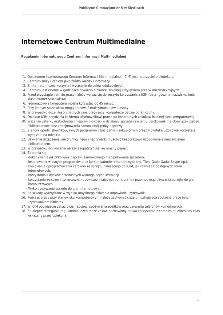Publiczne Gimnazjum nr 5 w Siedlcach Internetowe Centrum Multimedialne Regulamin Internetowego Centrum Informacji Multimedialnej 1. 2. 3. 4. 5. 6. 7. 8. 9. 10. 11. 12. 13. 14. ❍ ❍ ❍ ❍ ❍ ❍ 15. 16. 17. 18. Opiekunem Internetowego Centrum Informacji Multimedialnej (ICIM) jest nauczyciel bibliotekarz. Centrum służy uczniom jako źródło wiedzy i informacji. Z Internetu można korzystać wyłącznie do celów edukacyjnych. Centrum jest czynne w godzinach otwarcia biblioteki szkolnej z wyjątkiem przerw międzylekcyjnych. Przed przystąpieniem do pracy należy wpisać się do zeszytu korzystania z ICIM (data, godzina, nazwisko, imię, klasa, numer stanowiska). Jednorazowo z komputera można korzystać do 45 minut. Przy jednym stanowisku mogą pracować maksymalnie dwie osoby. W przypadku dużej ilości chętnych czas pracy przy komputerze będzie ograniczony. Opiekun ICIM przydziela każdemu użytkownikowi prawa do konkretnych zasobów lokalnej sieci komputerowej. Wszelkie usterki, uszkodzenia i nieprawidłowości w działaniu sprzętu i systemu użytkownik ma obowiązek zgłosić bibliotekarzowi bez podejmowania samowolnej próby naprawy. Z encyklopedii, słowników, innych programów i baz danych zakupionych przez bibliotekę uczniowie korzystają wyłącznie na miejscu. Używanie urządzenia wielofunkcyjnego i nagrywarki musi być każdorazowo uzgodnione z nauczycielem bibliotekarzem. W przypadku drukowania należy zaopatrzyć się we własny papier. Zabrania się: dokonywania jakichkolwiek napraw, samowolnego manipulowania sprzętem, instalowania własnych programów oraz komunikatorów internetowych (np. Tlen, Gadu-Gadu, Skype itp.), kopiowania oprogramowania zarówno ze sprzętu należącego do ICIM, jak również z dostępnych stron internetowych, korzystania z dysków przenośnych wymagających instalacji, korzystania ze stron internetowych upowszechniających pornografię i przemoc oraz używania sprzętu do gier komputerowych. Wykorzystywania sprzętu do gier internetowych. Za szkody wyrządzone w wyniku umyślnego działania odpowiada użytkownik. Podczas pracy przy stanowisku komputerowym należy zachować ciszę umożliwiającą spokojną pracę innym użytkownikom biblioteki. W ICIM obowiązuje zakaz picia napojów, spożywania posiłków oraz używania telefonów komórkowych. Za nieprzestrzeganie regulaminu uczeń może zostać pozbawiony prawa korzystania z centrum na określony czas wskazany przez opiekuna. 1