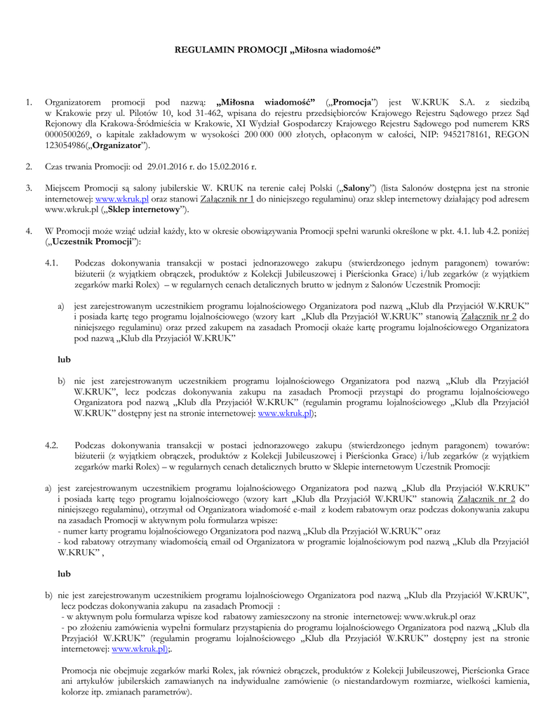 REGULAMIN PROMOCJI „Miłosna wiadomość” 1. Organizatorem promocji pod nazwą: „Miłosna wiadomość” („Promocja”) jest W.KRUK S.A. z siedzibą w Krakowie przy ul. Pilotów 10, kod 31-462, wpisana do rejestru przedsiębiorców Krajowego Rejestru Sądowego przez Sąd Rejonowy dla Krakowa-Śródmieścia w Krakowie, XI Wydział Gospodarczy Krajowego Rejestru Sądowego pod numerem KRS 0000500269, o kapitale zakładowym w wysokości 200 000 000 złotych, opłaconym w całości, NIP: 9452178161, REGON 123054986(„Organizator”). 2. Czas trwania Promocji: od 29.01.2016 r. do 15.02.2016 r. 3. Miejscem Promocji są salony jubilerskie W. KRUK na terenie całej Polski (,,Salony”) (lista Salonów dostępna jest na stronie internetowej: www.wkruk.pl oraz stanowi Załącznik nr 1 do niniejszego regulaminu) oraz sklep internetowy działający pod adresem www.wkruk.pl („Sklep internetowy”). 4. W Promocji może wziąć udział każdy, kto w okresie obowiązywania Promocji spełni warunki określone w pkt. 4.1. lub 4.2. poniżej („Uczestnik Promocji”): 4.1. Podczas dokonywania transakcji w postaci jednorazowego zakupu (stwierdzonego jednym paragonem) towarów: biżuterii (z wyjątkiem obrączek, produktów z Kolekcji Jubileuszowej i Pierścionka Grace) i/lub zegarków (z wyjątkiem zegarków marki Rolex) – w regularnych cenach detalicznych brutto w jednym z Salonów Uczestnik Promocji: a) jest zarejestrowanym uczestnikiem programu lojalnościowego Organizatora pod nazwą „Klub dla Przyjaciół W.KRUK” i posiada kartę tego programu lojalnościowego (wzory kart ,,Klub dla Przyjaciół W.KRUK” stanowią Załącznik nr 2 do niniejszego regulaminu) oraz przed zakupem na zasadach Promocji okaże kartę programu lojalnościowego Organizatora pod nazwą „Klub dla Przyjaciół W.KRUK” lub b) nie jest zarejestrowanym uczestnikiem programu lojalnościowego Organizatora pod nazwą „Klub dla Przyjaciół W.KRUK”, lecz podczas dokonywania zakupu na zasadach Promocji przystąpi do programu lojalnościowego Organizatora pod nazwą „Klub dla Przyjaciół W.KRUK” (regulamin programu lojalnościowego ,,Klub dla Przyjaciół W.KRUK” dostępny jest na stronie internetowej: www.wkruk.pl); 4.2. Podczas dokonywania transakcji w postaci jednorazowego zakupu (stwierdzonego jednym paragonem) towarów: biżuterii (z wyjątkiem obrączek, produktów z Kolekcji Jubileuszowej i Pierścionka Grace) i/lub zegarków (z wyjątkiem zegarków marki Rolex) – w regularnych cenach detalicznych brutto w Sklepie internetowym Uczestnik Promocji: a) jest zarejestrowanym uczestnikiem programu lojalnościowego Organizatora pod nazwą „Klub dla Przyjaciół W.KRUK” i posiada kartę tego programu lojalnościowego (wzory kart ,,Klub dla Przyjaciół W.KRUK” stanowią Załącznik nr 2 do niniejszego regulaminu), otrzymał od Organizatora wiadomość e-mail z kodem rabatowym oraz podczas dokonywania zakupu na zasadach Promocji w aktywnym polu formularza wpisze: - numer karty programu lojalnościowego Organizatora pod nazwą „Klub dla Przyjaciół W.KRUK” oraz - kod rabatowy otrzymany wiadomością email od Organizatora w programie lojalnościowym pod nazwą „Klub dla Przyjaciół W.KRUK” , lub b) nie jest zarejestrowanym uczestnikiem programu lojalnościowego Organizatora pod nazwą „Klub dla Przyjaciół W.KRUK”, lecz podczas dokonywania zakupu na zasadach Promocji : - w aktywnym polu formularza wpisze kod rabatowy zamieszczony na stronie internetowej: www.wkruk.pl oraz - po złożeniu zamówienia wypełni formularz przystąpienia do programu lojalnościowego Organizatora pod nazwą „Klub dla Przyjaciół W.KRUK” (regulamin programu lojalnościowego ,,Klub dla Przyjaciół W.KRUK” dostępny jest na stronie internetowej: www.wkruk.pl);. Promocja nie obejmuje zegarków marki Rolex, jak również obrączek, produktów z Kolekcji Jubileuszowej, Pierścionka Grace ani artykułów jubilerskich zamawianych na indywidualne zamówienie (o niestandardowym rozmiarze, wielkości kamienia, kolorze itp. zmianach parametrów). 5. Uczestnik Promocji spełniający warunki, o których mowa w pkt. 4.1 lit a) lub pkt. 4.2 lit. a) powyżej, jest uprawniony do otrzymania : a) 20% rabatu od regularnej ceny detalicznej brutto kupowanej biżuterii objętej Promocją, b) 15 % rabatu od regularnej ceny detalicznej brutto kupowanego zegarka/-ów objętego/objętych Promocją. Uczestnik Promocji spełniający warunki, o których mowa w pkt. 4.1 lit b) lub pkt. 4.2 lit b) powyżej, jest uprawniony do otrzymania: a) 15 % rabatu od regularnej ceny detalicznej brutto kupowanej biżuterii objętej Promocją, b) 10 % rabatu od regularnej ceny detalicznej brutto kupowanego zegarka/-ów objętego/objętych Promocją. 6. Rabat, o którym mowa w pkt. 5 powyżej nie może być łączony z innymi rabatami oferowanymi przez Organizatora w dniu sprzedaży, ani z rabatem udzielanym w programie lojalnościowym Organizatora pod nazwą „Klub dla Przyjaciół W.KRUK.”. Towary przecenione lub objęte innymi obniżkami oferowane w Salonie i/lub Sklepie internetowym nie podlegają rabatowi. W przypadku obowiązywania innych promocji (w tym zniżek), Uczestnik Promocji ma prawo wyboru czy korzysta z rabatu, o którym mowa w pkt. 5 powyżej od regularnej ceny detalicznej brutto czy uczestniczy w innej promocji. 7. Klienci nie mogą dokonywać płatności za towary objęte Promocją za pomocą punktów zgromadzonych z tytułu uczestnictwa w programie lojalnościowym Organizatora „Klub dla Przyjaciół W.KRUK”. Klienci nie otrzymują punktów w programie lojalnościowym Organizatora „Klub dla Przyjaciół W.KRUK” za nabycie towarów objętych Promocją. 8. Klient może wielokrotnie brać udział w Promocji w okresie jej obowiązywania, pod warunkiem każdorazowego spełnienia warunków określonych w pkt. 4 powyżej. 9. Wszelkie treści zawarte w materiałach reklamowo-promocyjnych dotyczących Promocji mają charakter jedy