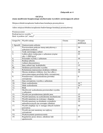 Załącznik nr 4 OCENA stanu możliwości bezpiecznego użytkowania wyrobów zawierających azbest Miejsce/obiekt/urządzenie budowlane/instalacja przemysłowa: …………………………………………………………………… Adres miejsca/obiektu/urządzenia budowlanego/instalacji przemysłowej: ……………………………………………………………………………. Pomieszczenie: ………………………………………………………….. Rodzaj/nazwa wyrobu 1) ………………………………………………. Ilość wyrobów (m2, tony)2 ……………………………………………. Grupa/Nr Wyrób rodzaj I. Sposób Zastosowania azbestu 1. Powierzchnia pokryta masą natryskową z azbestem (torkret) 2. Tynk zawierający azbest 3. Lekkie płyty izolacyjne z azbestem (ciężar obj.<1.000 kg/m3 4. Pozostałe wyroby z azbestem II. Rodzaj azbestu 5. Azbest chryzotylowy 6. Inny azbest (np. krokidiolit) III. Struktura powierzchni wyrobu 7. Rzluźniona (naruszona) struktura włókien 8. Mocna struktura włókien, lecz bez albo z niewystarczającą powłoką farby zewnętrznej 9. Pomalowana i nieuszkodzona powłoka zewnętrzna IV. Stan zewnętrzny wyrobu z azbestem 10. Duże uszkodzenia 11. Małe uszkodzenia 12. Brak V. Możliwość uszkodzenia powierzchni wyrobu z azbestem 13. Wyrób jest przedmiotem jakichś prac 14. Wyrób narażony na uszkodzenia mechaniczne 15. Wyrób narażony na wstrząsy i drgania 16. Wyrób narażony na działanie czynników atmosferycznych (na zewnątrz obiektu) 17. Wyrób znajduje się w zasięgu silnych ruchów powietrza 18. Wyrób nie jest narażony na wpływy zewnętrzne VI. Wykorzystanie pomieszczenia 19. Regularnie przez dzieci, młodzież lub sportowców Ocena Przyjęta punktacja 30 30 25 10 5 15 30 10 0 30 3) 10 4) 0 15 10 10 10 10 0 35 20. 21. VII. 22. 23. 24. 25. Trwałe lub częste przebywanie w pomieszczeniach innych osób Rzadko wykorzystywane pomieszczenie Usytuowanie wyrobu Bezpośrednio w pomieszczeniu Za zawieszonym, nieszczelnym sufitem lub innym pokryciem W systemie wywietrzania pomieszczenia (kanały wentylacyjne) Za zawieszonym szczelnym sufitem lub innym pokryciem, ponad pyłoszczelną powierzchnią lub poza szczelnym kanałem wentylacyjnym. 30 10 30 25 25 10 Suma punktów oceny Stopień pilności I (wymiana lub naprawa wymagana bezzwłocznie) Stopień pilności II (ponowna ocena wymagana w czasie do 1 roku) Stopień pilności III (ponowna ocena w terminie do 5 lat) 65 i więcej punktów powyżej 35 do 60 punktów do 35 punktów UWAGA: podkreślić należy jedną pozycję w grupie jeśli Wystąpi wiecej niż jedna, podkreślić należy najwyższą Punktację. Zsumować ilość punktów, ustalić ocenę końcową I stopień pilności. ……………………………. Oceniający nazwisko i imię …………………………… Właściciel/Zarządca Data …………………………. Adres……………………… 1) Według klasyfikacji wyrobów przyjętych w sprawozdaniu rocznym – załącznik nr 2 rozporządzenia Ministra Gospodarki, Pracy i Polityki Społecznej z dnia 23 października 2003r. w sprawie wymagań w zakresie wykorzystywania i przemieszczania azbest oraz wykorzystywania i oczyszczania instalacji lub urządzeń, w których był lub jest wykorzystywany azbest (dz. U. Nr 192, poz. 1876). 2) Zgodnie z inwentaryzacją i sprawozdaniem rocznym - § 7 wymienionego w odnośniku 1 rozporządzenia. 3) Duże uszkodzenia – widoczne pęknięcia lub ubytki na powierzchni równej lub większej niż3% powierzchni wyrobu. 4) Małe uszkodzenia – brak widocznych pęknięć, a ubytki na powierzchni mniejszej niż 3% powierzchni wyrobu.