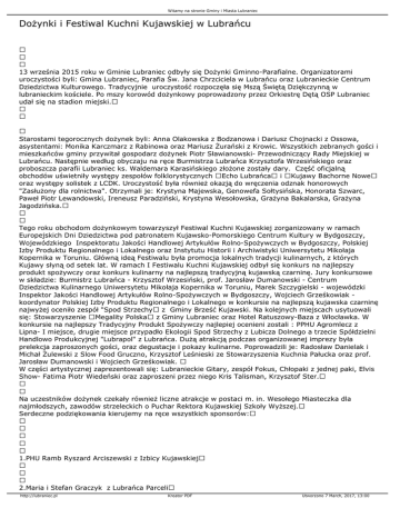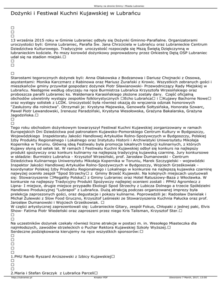 Witamy na stronie Gminy i Miasta Lubraniec Dożynki i Festiwal Kuchni Kujawskiej w Lubrańcu 13 września 2015 roku w Gminie Lubraniec odbyły się Dożynki Gminno-Parafialne. Organizatorami uroczystości byli: Gmina Lubraniec, Parafia Św. Jana Chrzciciela w Lubrańcu oraz Lubranieckie Centrum Dziedzictwa Kulturowego. Tradycyjnie uroczystość rozpoczęła się Mszą Świętą Dziękczynną w lubranieckim kościele. Po mszy korowód dożynkowy poprowadzony przez Orkiestrę Dętą OSP Lubraniec udał się na stadion miejski. Starostami tegorocznych dożynek byli: Anna Olakowska z Bodzanowa i Dariusz Chojnacki z Ossowa, asystentami: Monika Karczmarz z Rabinowa oraz Mariusz Żurański z Krowic. Wszystkich zebranych gości i mieszkańców gminy przywitał gospodarz dożynek Piotr Sławianowski- Przewodniczący Rady Miejskiej w Lubrańcu. Następnie według obyczaju na ręce Burmistrza Lubrańca Krzysztofa Wrzesińskiego oraz proboszcza parafii Lubraniec ks. Waldemara Karasińskiego złożone zostały dary. Część oficjalną obchodów uświetniły występy zespołów folklorystycznych Echo Lubrańca i Kujawy Bachorne Nowe oraz występy solistek z LCDK. Uroczystość była również okazją do wręczenia odznak honorowych "Zasłużony dla rolnictwa". Otrzymali je: Krystyna Majewska, Genowefa Sołtysińska, Honorata Szwarc, Paweł Piotr Lewandowski, Ireneusz Paradziński, Krystyna Wesołowska, Grażyna Bakalarska, Grażyna Jagodzińska. Tego roku obchodom dożynkowym towarzyszył Festiwal Kuchni Kujawskiej zorganizowany w ramach Europejskich Dni Dziedzictwa pod patronatem Kujawsko-Pomorskiego Centrum Kultury w Bydgoszczy, Wojewódzkiego Inspektoratu Jakości Handlowej Artykułów Rolno-Spożywczych w Bydgoszczy, Polskiej Izby Produktu Regionalnego i Lokalnego oraz Instytutu Historii i Archiwistyki Uniwersytetu Mikołaja Kopernika w Toruniu. Główną ideą Festiwalu była promocja lokalnych tradycji kulinarnych, z których Kujawy słyną od setek lat. W ramach I Festiwalu Kuchni Kujawskiej odbył się konkurs na najlepszy produkt spożywczy oraz konkurs kulinarny na najlepszą tradycyjną kujawską czarninę. Jury konkursowe w składzie: Burmistrz Lubrańca - Krzysztof Wrzesiński, prof. Jarosław Dumanowski - Centrum Dziedzictwa Kulinarnego Uniwersytetu Mikołaja Kopernika w Toruniu, Marek Szczygielski - wojewódzki Inspektor Jakości Handlowej Artykułów Rolno-Spożywczych w Bydgoszczy, Wojciech Grześkowiak koordynator Polskiej Izby Produktu Regionalnego i Lokalnego w konkursie na najlepszą kujawska czarninę najwyżej oceniło zespół "Spod Strzechy z Gminy Brześć Kujawski. Na kolejnych miejscach usytuowali się: Stowarzyszenie Megality Polska z Gminy Lubraniec oraz Hotel Ratuszowy-Baza z Włocławka. W konkursie na najlepszy Tradycyjny Produkt Spożywczy najlepiej ocenieni zostali : PPHU Agromlecz z Lipna- I miejsce, drugie miejsce przypadło Ekologii Spod Strzechy z Lubicza Dolnego a trzecie Spółdzielni Handlowo Produkcyjnej "Lubrapol" z Lubrańca. Dużą atrakcją podczas organizowanej imprezy była prelekcja zaproszonych gości, oraz degustacje i pokazy kulinarne. Poprowadzili je: Radosław Danielak i Michał Żulewski z Slow Food Gruczno, Krzysztof Leśnieski ze Stowarzyszenia Kuchnia Pałucka oraz prof. Jarosław Dumanowski i Wojciech Grześkowiak. W części artystycznej zaprezentowali się: Lubranieckie Gitary, zespół Fokus, Chłopaki z jednej paki, Elvis Show- Fatima Piotr Wiedeński oraz zaproszeni przez niego Kris Talisman, Krzysztof Ster. Na uczestników dożynek czekały również liczne atrakcje w postaci m. in. Wesołego Miasteczka dla najmłodszych, zawodów strzeleckich o Puchar Rektora Kujawskiej Szkoły Wyższej. Serdeczne podziękowania kierujemy na ręce wszystkich sponsorów: 1.PHU Ramb Ryszard Arciszewski z Izbicy Kujawskiej 2.Maria i Stefan Graczyk z Lubrańca Parceli http://lubraniec.pl Kreator PDF Utworzono 7 March, 2017, 13:00 Witamy na stronie Gminy i Miasta Lubraniec 3.Ewa Janicka Skarbnik Gminy Lubraniec 4.Krzysztof Wrzesiński Burmistrz Lubrańca 5.Marcin Czarniak Zastępca Burmistrza Lubrańca 6.Danuta i Artur Bączek z Dąbia Kujawskiego 7.Małgorzata i Zbigniew Siewierscy ze Skaszyna 8.Renata i Kazimierz Magos z Lubrańca 9.Mirosław Lewandowski Prezes Zakładu Usług Komunalnych 10.Ryszard Kamiński z Lubrańczyka 11.Jerzy Muraszewski z Lubrańca 12.Zakład Usług Komunalnych 13.PROFESMED Bogdan Czajka Praktyka Lekarza Rodzinnego 14.Włocławskie Przedsiębiorstwo Robót Drogowych Nowa Wieś 15.Stasiak Andrzej 16.Kamila Kruszyńska, Grażyna Maciejewska Art-Hurt 17.Andrzej Górski z Lubrańca http://lubraniec.pl Kreator PDF Utworzono 7 March, 2017, 13:00 Witamy na stronie Gminy i Miasta Lubraniec 18.Jadwiga i Włodzimierz Nowakowscyz Biernatek 19.Bank Spółdzielczy w Lubrańcu 20.Kazimierz Mańkowski Petroman II Sp. z o.o. 21."Rafał" Przedsiębiorstwo Mięsne Mirosław Miętkiewicz 22.Polskie Przetwory Sp. z o.o. 23.Kujawsko - Pomorska Izba Rolnicza 24.KFMR KRUKOWIAK Sp. z o.o. 25.Teresa i Ryszard Czynszak 26.SHP Lubrapol 27.Ireneusz Paradziński 28.Violetta i Jacek Urbańscy z Kłobi 29.Anita i Piotr Burmistrzak z Kąkowej Woli 30.Agnieszka i Paweł Misterscy z Sułkowa 31.Bożena i Janusz Nowiccy z Kłobi 32.Anita i Roman Woźniak ze Skaszyna 33.Agnieszka i Roman Miastowscy z Milżyna http://lubraniec.pl Kreator PDF Utworzono 7 March, 2017, 13:00 Witamy na stronie Gminy i Miasta Lubraniec 34.Zofia i Jerzy Stanowscy z Bielaw 35.Elżbieta i Marek Chlaściak z Lubrańca 36.Katarzyna i Dariusz Afeltowicz z Końca 37.Grażyna i Krzysztof Bett z Siarczyc 38.Małgorzata i Józef Lewiccy z Kłobi 39.Lidia i Paweł Kuczyńscy Twój Warzywniaczek Lubraniec http://lubraniec.pl Kreator PDF Utworzono 7 March, 2017, 13:00