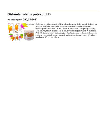 Girlanda lody na patyku LED Nr katalogowy: 090,57-8017 Girlanda z 10 lampkami LED w plastikowych, kolorowych lodach na patyku. Produkt do użytku wewnątrz pomieszczeń na baterie (wymagane zasilanie: 2 x AA - brak w zestawie). Długość girlandy: 165 cm. Wymiary 1 loda: ok. 8 cm. Produkt zapakowany w pudełko PVC. Świetny gadżet dekoracyjny. Fantastyczna ozdoba do każdego rodzaju wnętrza. Świetny gadżet na imprezę tematyczną. Wymiary produktu: 13 x 13 x 12 cm.
