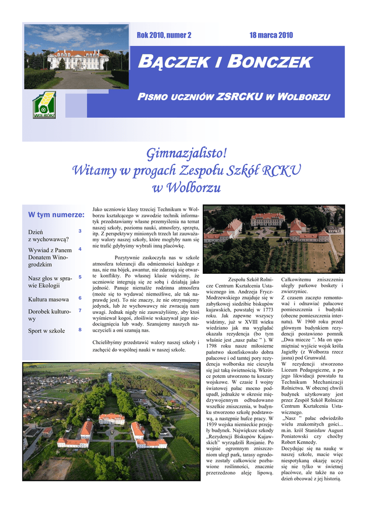 Rok 2010, numer 2 18 marca 2010 BĄCZEK I BONCZEK PISMO UCZNIÓW ZSRCKU W WOLBORZU Gimnazjalisto! Witamy w progach Zespołu Szkół RCKU w Wolborzu W tym numerze: Dzień z wychowawcą? 3 Wywiad z Panem Donatem Winogrodzkim 4 Nasz głos w sprawie Ekologii 5 Kultura masowa 6 Dorobek kulturowy 7 Sport w szkole 8 Jako uczniowie klasy trzeciej Technikum w Wolborzu kształcącego w zawodzie technik informatyk przedstawiamy własne przemyślenia na temat naszej szkoły, poziomu nauki, atmosfery, sprzętu, itp. Z perspektywy minionych trzech lat zauważamy walory naszej szkoły, które mogłyby nam się nie trafić gdybyśmy wybrali inną placówkę. Pozytywnie zaskoczyła nas w szkole atmosfera tolerancji dla odmienności każdego z nas, nie ma bójek, awantur, nie zdarzają się otwarte konflikty. Po własnej klasie widzimy, że uczniowie integrują się ze sobą i działają jako jedność. Panuje niemalże rodzinna atmosfera (może się to wydawać niemożliwe, ale tak naprawdę jest). To nie znaczy, że nie otrzymujemy jedynek, lub że wychowawcy nie zwracają nam uwagi. Jednak nigdy nie zauważyliśmy, aby ktoś wyśmiewał kogoś, złośliwie wskazywał jego niedociągnięcia lub wady. Szanujemy naszych nauczycieli a oni szanują nas. Chcielibyśmy przedstawić walory naszej szkoły i zachęcić do wspólnej nauki w naszej szkole. Zespołu Szkół Rolnicze Centrum Kształcenia Ustawicznego im. Andrzeja FryczModrzewskiego znajduje się w zabytkowej siedzibie biskupów kujawskich, powstałej w 1773 roku. Jak zapewne wszyscy widzimy, już w XVIII wieku wiedziano jak ma wyglądać okazała rezydencja (bo tym właśnie jest „nasz pałac ” ). W 1798 roku nasze miłosierne państwo skonfiskowało dobra pałacowe i od tamtej pory rezydencja wolborska nie cieszyła się już taką świetnością. Wkrótce potem utworzono tu koszary wojskowe. W czasie I wojny światowej pałac mocno podupadł, jednakże w okresie międzywojennym odbudowano wszelkie zniszczenia, w budynku stworzono szkołę podstawową, a następnie hufce pracy. W 1939 wojska niemieckie przejęły budynek. Największe szkody „Rezydencji Biskupów Kujawskich” wyrządzili Rosjanie. Po wojnie ogromnym zniszczeniom uległ park, tarasy ogrodowe zostały całkowicie pozbawione roślinności, znacznie przerzedzono aleję lipową. Całkowitemu zniszczeniu uległy parkowe boskety i zwierzyniec. Z czasem zaczęto remontować i odnawiać pałacowe pomieszczenia i budynki (obecne pomieszczenia internatu). W 1960 roku przed głównym budynkiem rezydencji postawiono pomnik „Dwa miecze ”. Ma on upamiętniać wyjście wojsk króla Jagiełły (z Wolborza rzecz jasna) pod Grunwald. W rezydencji stworzono Liceum Pedagogiczne, a po jego likwidacji powstało tu Technikum Mechanizacji Rolnictwa. W obecnej chwili budynek użytkowany jest przez Zespół Szkół Rolnicze Centrum Kształcenia Ustawicznego. „Nasz ” pałac odwiedziło wielu znakomitych gości... m.in. król Stanisław August Poniatowski czy choćby Robert Kennedy. Decydując się na naukę w naszej szkole, macie więc niespotykaną okazję uczyć się nie tylko w świetnej placówce, ale także na co dzień obcować z jej historią. Bączek i Bonczek cy z końmi, oraz rozwijanie zainteresowań związanych rekreacją i sportem jeździeckim. Drugim profilem liceum będzie klasa taneczno-estardowa. Tu, młodzi ludzie będą mogli wykazać się umiejętnościami artystycznymi, zaprezentować je szerszej publiczności, zaistnieć na przeglądach, konkursach, koncertach. Nowe szkoły w ZS RCKU Zapraszamy wszystkich absolwentów gimnazjów do nauki w naszej szkole! W związku z rosnącą popularnością szeroko rozumianego sportu jeździeckiego powiększa się grono osób, które decydują się na posiadanie oraz hodowanie koni. Coraz więcej młodych ludzi pragnie związać swoją przyszłość z końmi. Jest to zajęcie emocjonujące i twórcze, ale trudne, wymagające dużej wiedzy na temat specyfikacji zachowań i potrzeb tych zwierząt. Tylko właściwa wiedza poparta praktyką pozwala w pełni cieszyć się z obcowania z końmi dostarczając jednocześnie niezapomnianych wrażeń. Wychodząc naprzeciw wzrastającemu zainteresowaniu młodych ludzi końmi i zapotrzebowaniu na rynku pracy na wykwalifikowaną kadrę do obsługi koni postanowiliśmy poszerzyć naszą ofertę edukacyjną o liceum ogólnokształcące o profilu jeździeckim. Zadaniem tej szkoły będzie oprócz wypracowania programu liceum ogólnokształcącego doskonalenie umiejętności jeździeckich, pra- Szkoła w Wolborzu to nie tylko miejsce, które kojarzy się z monotonną nauką, ale również niepowtarzalna atmosfera, kreatywni ludzie, zawsze pomocni nauczyciele. Miejsce to posiada niesamowitą magię, udziela się każdemu, kto spędzi tutaj część swojego życia. Sukcesy naszych uczniów w konkursach Piątego marca 2010 roku na Wydziale Elektrotechniki, Elektroniki, Informatyki i Automatyki Politechniki Łódzkiej w Łodzi odbył się wojewódzki etap konkursu informatycznego Intersieć 2009/2010. Szkołę reprezentowało aż trzech uczniów. Po ciężkich bojach Dawid Gosławski (na zdjęciu) zajął trzecie miejsce i tym samym przeszedł do etapu ogólnopolskiego. Miejmy nadzieję, że i tam Dawid wykaże się swoją wiedzą i umiejętnościami, co pozwoli mu uzyskać tytuł laureata na tym jakże wysokim szczeblu. Życzymy powodzenia! Drugi z reprezentantów naszej szkoły – Paweł Guzdraj uplasował Str. 2 się na szóstej pozycji… do awansu zabrakło jednej minuty… Trzecim uczniem naszej szkoły, który pojechał do Łodzi był Adrian Kaczmarek – uczeń pierwszej klasy. Zdobył on cenne doświadczenie, które może zaprocentować w przyszłości. Przygotowaniem nas do konkursu zajął się nasz nauczyciel informatyki Pan Januszu Łukasik. Szkoła w Wolborzu wypadła bardzo dobrze. Mieliśmy najwięcej reprezentantów na szczeblu wojewódzkim. Do drugiego, internetowego etapu awansowało zaś w