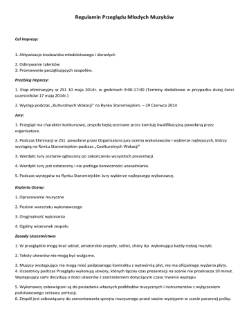 Regulamin Przeglądu Młodych Muzyków Cel Imprezy: 1. Aktywizacja środowiska młodzieżowego i dorosłych 2. Odkrywanie talentów 3. Promowanie początkujących zespołów. Przebieg Imprezy: 1. Etap eliminacyjny w ZS1 10 maja 2014r. w godzinach 9:00-17:00 (Terminy dodatkowe w przypadku dużej ilości uczestników 17 maja 2014r.) 2. Występ podczas „Kulturalnych Wakacji” na Rynku Staromiejskim. – 29 Czerwca 2014 Jury: 1. Przegląd ma charakter konkursowy, zespoły będą oceniane przez komisję kwalifikacyjną powołaną przez organizatora. 2. Podczas Eliminacji w ZS1 powołane przez Organizatora jury ocenia wykonawców i wybierze najlepszych, którzy wystąpią na Rynku Staromiejskim podczas „Coolturalnych Wakacji” 3. Werdykt Jury zostanie ogłoszony po zakończeniu wszystkich prezentacji. 4. Werdykt Jury jest ostateczny i nie podlega konieczności uzasadniania. 5. Podczas występów na Rynku Staromiejskim Jury wybierze najlepszego wykonawcę. Kryteria Oceny: 1. Opracowanie muzyczne 2. Poziom warsztatu wykonawczego 3. Oryginalność wykonania 4. Ogólny wizerunek zespołu Zasady Uczestnictwa: 1. W przeglądzie mogą brać udział, amatorskie zespoły, soliści, chóry itp. wykonujący każdy rodzaj muzyki. 2. Teksty utworów nie mogą być wulgarne. 3. Muzycy występujący nie mogą mieć podpisanego kontraktu z wytwórnią płyt, nie ma oficjalnego wydania płyty. 4. Uczestnicy podczas Przeglądu wykonują utwory, których łączny czas prezentacji na scenie nie przekracza 10 minut. Występujący sami decydują o ilości utworów z zastrzeżeniem dotyczącym czasu trwania występu. 5. Wykonawcy zobowiązani są do posiadania własnych podkładów muzycznych i instrumentów z wyłączeniem podstawowego zestawu perkusji. 6. Zespół jest zobowiązany do zamontowania sprzętu muzycznego przed swoim występem w czasie porannej próby. 7. Nie dopuszcza się do Przeglądu wykonawców wykonujących utwory z playbacku. 8. Organizator w zależności od liczby zgłoszonych do Przeglądu podmiotów wykonawczych, zastrzega sobie prawo do skrócenia czasu poszczególnych prezentacji do 7 minut. 9 . Kolejność prezentacji ustala organizator. 10. Udział w Przeglądzie dla uczestników jest bezpłatny. Warunki Uczestnictwa: 1. Lider zespołu lub osoba upoważniona do kontaktu ma obowiązek złożyć kartę zgłoszenia wraz z wykazem utworów, wg załączonego wzoru do dnia 8 maja 2014 roku w sekretariacie ZS1 ul. Park 3 Maja. w Stargardzie Szczecińskim lub wysłać na adres e-mail [email protected] (Błędnie wypełnione zgłoszenia nie będą przyjmowane) 2. Dostarczona organizatorowi karta zgłoszenia zespołu jest równoznaczna z akceptacją niniejszego regulaminu. 3. Wszystkie zespoły zobowiązane są być w miejscu przeglądu na godzinę przed planowanym występem i zgłosić organizatorom swoją obecność. Niestawienie dyskwalifikuje uczestników. 4. Uczestnicy Przeglądu zobowiązani są do przestrzegania porządku, bezpieczeństwa ogólnego oraz przepisów bhp i ppoż obowiązujących w ZS1. Informacje Dodatkowe: 1. Lista zakwalifikowanych uczestników ukaże się na internetowej stronie organizatora 26.05.2014r. 2. Na terenie ZS1 obowiązuje całkowity zakaz spożywania alkoholu oraz inny substancji odurzających. 3. Organizator ma prawo zdyskwalifikować zespół, gdy stwierdzi, iż członkowie są pod wpływem alkoholu lubi innych substancji odurzających. 4. Organizator nie ponosi odpowiedzialności za rzeczy pozostawione w garderobach. 5. Organizator zastrzega sobie prawo do zmian w Regulaminie Przeglądu 6. W przypadku małej liczby zgłoszeń na przegląd, organizator może odwołać imprezę. 8. Kwestie sporne, nieobjęte regulaminem lub wymagające dodatkowych interpretacji, rozstrzygać będzie organizator. Warunki Techniczne: Organizator zapewnia: (ZS1) Wraz z kartą zgłoszeń, zespół zobowiązany jest do dostarczenia Ridera technicznego. W razie problemów ze zorganizowaniem sprzętu, organizator będzie kontaktował się telefonicznie. Organizator zapewnia: (Rynek Staromiejski) 1. Sprzęt nagłaśniający o mocy nieprzekraczającej 2x 4kW z sześcioma kolumnami monitorowymi, połączonymi w trzy linie, konsolę miksującą z efektami typu: hall, reverb, delay. 2. Oświetlenie sceniczne. 3. Podstawowy zestaw perkusyjny (perkusiści są zobowiązani do używania własnych pałek, talerzy oraz stopy.) 4. Mikrofony na statywach. 5. Istnieje możliwość zainstalowania własnych wzmacniaczy, blach, werbla itp. Wyłącznie po wcześniejszym uzgodnieniu z organizatorem. 6 . Scenę o wymiarach 6x6. Nagrody: Możliwość wystąpienia podczas „Dni Stargardu 2015” (czas występu ok. 30 minut). Dodatkowo: Proponowane nagrody: - Nagroda pieniężna w wysokości 500/300/200 zł dla 1/2/3 miejsca. W zależności od poziomu wykonawców jury może zmienić wartość nagrody. - Dyplomy dla uczestników, którzy przeszli eliminacje. - Mogą wystąpić wyróżnienia Koncert Finałowy: W trakcie podejmowania decyzji przez jury, występy „profesjonalistów”. Po ogłoszeniu wszystkich wyników koncert zespołów/laureatów przeglądu rockowego. Prowadzący: Koncert na Rynku Staromiejskim (godz. 17:00) będą prowadziły dwie osoby. I zadaniem jest zapowiadanie zespołów i zajmowanie publiczności w trakcie rozstawiania sprzętu lub ewentualnych przerw.