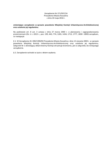 Zarządzenie Nr 271/937/16 Prezydenta Miasta Koszalina z dnia 10 maja 2016 r. zmieniające zarządzenie w sprawie powołania Miejskiej Komisji Urbanistyczno-Architektonicznej oraz ustalenia jej regulaminu. Na podstawie art. 8 ust. 3 ustawy z dnia 27 marca 2003 r. o planowaniu i zagospodarowaniu przestrzennym (Dz. U. z 2015 r., poz. 199, 443, 774, 1265, 1434, 1713, 1777, 1830 i 1890) zarządzam, co następuje: § 1. W Zarządzeniu Nr 200/1390/04 Prezydenta Miasta Koszalina z dnia 13 sierpnia 2004 r. w sprawie powołania Miejskiej Komisji Urbanistyczno-Architektonicznej oraz ustalenia jej regulaminu, Załącznik Nr 1 określający skład imienny Komisji otrzymuje brzmienie, jak w załączniku do niniejszego zarządzenia. § 2. Zarządzenie wchodzi w życie z dniem wydania. Załącznik do Zarządzenia Prezydenta Miasta Koszalina Nr 271/937/16 z dnia 10 maja 2016 r. : ……………………………………………………………………………………........................................................................... Załącznik Nr 1 do Zarządzenia Prezydenta Miasta Koszalina Nr 200/1390/04 z dnia 13 sierpnia 2004 r. Skład imienny Miejskiej Komisji Urbanistyczno-Architektonicznej w Koszalinie Członkowie Komisji: A. Stali: 1) Iwona Stepanow, 2) Marek Perepeczo, 3) Tomasz Samborski, 4) Stanisław Skład, 5) Andrzej Fijałkowski, 6) Barbara Sożyńska-Maciejko, 7) Lidia Zielińska-Lorek, 8) Julian Giedych, 9) Jerzy Mikrzak, 10) Jan Sontowski, 11) Witold Korzyński, 12) Urszula Barańska, 13) Łukasz Adamczyk, 14) Teresa Bryzek, 15) Waldemar Czuszel, 16) Zofia Furman, 17) Bogdan Wojdyło, 18) Marta Pieczątkiewicz. B. Niestali : 1) Jolanta Frankiewicz, 2) Artur Studziński, 3) Bożena Giedych, 4) Ewa Miśkiewicz-Żebrowska. UZASADNIENIE W dniu 13 sierpnia 2004 r. Prezydent Miasta powołał Miejską Komisję UrbanistycznoArchitektoniczną jako organ doradczy i opiniodawczy w sprawach planowania i zagospodarowania przestrzennego, urbanistyki i architektury. Z uwagi na zmiany personalne, jakie zaszły od 2004 r., w instytucjach oraz wydziałach tut. Urzędu, wskazujących osoby na członków Komisji, konieczne jest uaktualnienie jej składu imiennego określonego w załączniku nr 1 do zarządzenia Prezydenta Miasta Koszalina z dnia 13 sierpnia 2004 r. w sprawie powołania Miejskiej Komisji Urbanistyczno-Architektonicznej oraz ustalenia jej regulaminu. Zgodnie z art.8 ust.6 ustawy o planowaniu i zagospodarowaniu przestrzennym organ doradczy (MKUA) składa się z osób o wykształceniu i przygotowaniu fachowym związanym bezpośrednio z teorią i praktyką planowania przestrzennego, w tym co najmniej w połowie z osób rekomendowanych przez branżowe stowarzyszenia i samorządy zawodowe.