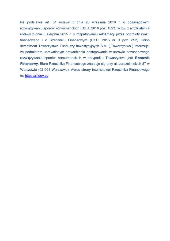 Na podstawie art. 31 ustawy z dnia 23 września 2016 r. o pozasądowym rozwiązywaniu sporów konsumenckich (Dz.U. 2016 poz. 1823) w zw. z rozdziałem 4 ustawy z dnia 5 sierpnia 2015 r. o rozpatrywaniu reklamacji przez podmioty rynku finansowego i o Rzeczniku Finansowym (Dz.U. 2016 nr 0 poz. 892) Union Investment Towarzystwo Funduszy Inwestycyjnych S.A. („Towarzystwo”) informuje, że podmiotem uprawnionym prowadzenia postępowania w sprawie pozasądowego rozwiązywania sporów konsumenckich w przypadku Towarzystwa jest Rzecznik Finansowy. Biuro Rzecznika Finansowego znajduje się przy al. Jerozolimskich 87 w Warszawie (02-001 Warszawa). Adres strony internetowej Rzecznika Finansowego to: https://rf.gov.pl/.