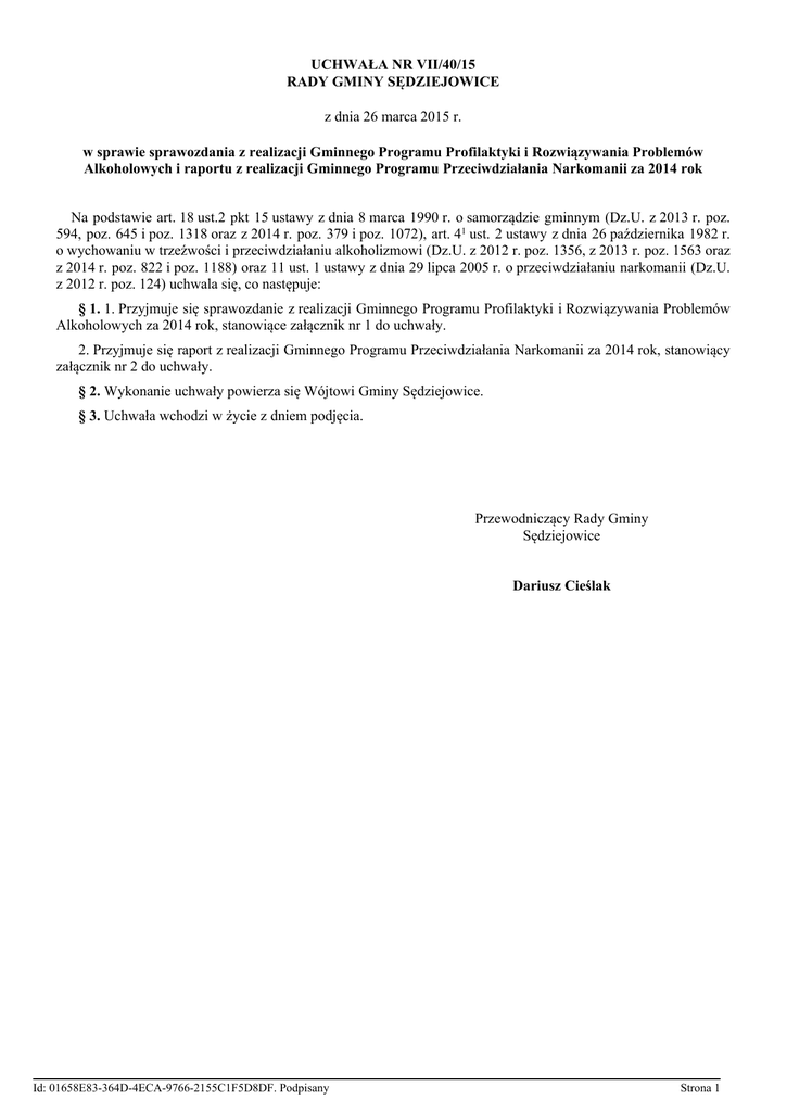 UCHWAŁA NR VII/40/15 RADY GMINY SĘDZIEJOWICE z dnia 26 marca 2015 r. w sprawie sprawozdania z realizacji Gminnego Programu Profilaktyki i Rozwiązywania Problemów Alkoholowych i raportu z realizacji Gminnego Programu Przeciwdziałania Narkomanii za 2014 rok Na podstawie art. 18 ust.2 pkt 15 ustawy z dnia 8 marca 1990 r. o samorządzie gminnym (Dz.U. z 2013 r. poz. 594, poz. 645 i poz. 1318 oraz z 2014 r. poz. 379 i poz. 1072), art. 41 ust. 2 ustawy z dnia 26 października 1982 r. o wychowaniu w trzeźwości i przeciwdziałaniu alkoholizmowi (Dz.U. z 2012 r. poz. 1356, z 2013 r. poz. 1563 oraz z 2014 r. poz. 822 i poz. 1188) oraz 11 ust. 1 ustawy z dnia 29 lipca 2005 r. o przeciwdziałaniu narkomanii (Dz.U. z 2012 r. poz. 124) uchwala się, co następuje: § 1. 1. Przyjmuje się sprawozdanie z realizacji Gminnego Programu Profilaktyki i Rozwiązywania Problemów Alkoholowych za 2014 rok, stanowiące załącznik nr 1 do uchwały. 2. Przyjmuje się raport z realizacji Gminnego Programu Przeciwdziałania Narkomanii za 2014 rok, stanowiący załącznik nr 2 do uchwały. § 2. Wykonanie uchwały powierza się Wójtowi Gminy Sędziejowice. § 3. Uchwała wchodzi w życie z dniem podjęcia. Przewodniczący Rady Gminy Sędziejowice Dariusz Cieślak Id: 01658E83-364D-4ECA-9766-2155C1F5D8DF. Podpisany Strona 1 Załącznik Nr 1 do Uchwały Nr VII/40/15 Rady Gminy Sędziejowice z dnia 26 marca 2015 r. SPRAWOZDANIE Z REALIZACJI GMINNEGO PROGRAMU PROFILAKTYKI I ROZWIĄZYWANIA PROBLEMÓW ALKOHOLOWYCH ZA 2014 ROK DZIAŁ I. Sprawy ogólne Prowadzenie działań związanych z profilaktyką uzależnień należy do zadań własnych gminy, a organizacyjną formę nadał im „Gminny Program Profilaktyki i Rozwiązywania Problemów Alkoholowych na 2014 rok”, który stanowi załącznik do uchwały Nr XXXII/254/13 Rady Gminy Sędziejowice z dnia 30 grudnia 2013 r., zwany w dalszej części sprawozdania „Programem”. Art. 111 ust. 1 ustawy o wychowaniu w trzeźwości i przeciwdziałaniu alkoholizmowi brzmi: „W celu pozyskania dodatkowych środków na finansowanie zadań określonych w art. 41 ust. 1 gminy pobierają opłaty za korzystanie z zezwoleń na sprzedaż napojów alkoholowych, o których mowa w art. 18”. Według uchwały budżetowej na 2014 rok w dziale 851 - ochrona zdrowia rozdz. 85154 - zapobieganie alkoholizmowi na finansowanie zadań określonych w „Programie” zaplanowano kwotę 79.000 zł. Za okres sprawozdawczy wpływy z opłat za korzystanie z zezwoleń na sprzedaż napojów alkoholowych na dzień 31.12.2014 r. wyniosły 90.282 zł, z tego: 57.094 zł wydatkowano na realizację zadań „Programu”, 1.300 zł przeznaczono na realizację Gminnego Programu Przeciwdziałania Narkomanii na 2014 rok oraz 30.000 zł na dofinansowanie zadania inwestycyjnego pn. „Budowa siłowni zewnętrznej i placu zabaw w Sędziejowicach” ; pozostała kwota 1.888 zł. DZIAŁ II. Realizacja programu zgodnie z przyjętymi celami Rozdział 1. Prowadzenie profilaktycznej działalności informacyjnej i edukacyjnej w zakresie rozwiązywania problemów alkoholowych, w szczególności dla dzieci i młodzieży. 1. Do działalności informacyjno - edukacyjnej wykorzystywane były wywiadówki i spotkania z rodzicami prowadzone przez psychologa i pedagoga szkolnego. Wykorzystywano do tego celu także zajęcia w okresie ferii i wakacji szkolnych. Zakupiono pakiety materiałów profilaktycznych: „ Reaguj na przemoc” i „Prawda o alkoholu” (2.460 zł). 2. 6 marca 2014 r. młodzież gimnazjalna brała udział w zajęciach warsztatowych pn. „Uzależnieniom NIE”, które były przeprowadzone w ramach projektu pt. „Zdrowa szkoła” w Zespole Szkół Ogólnokształcących Nr 1 w Sędziejowicach (300 zł). 3. W okresie od 22 września do 30 października 2014 r. realizowany był program profilaktyczny pt. „Niezapominajka”,którym objęto 49 uczniów z klas I (a,b) gimnazjum ZSO Nr 1 w Sędziejowicach (400 zł). 4. W okresie ferii zimowych uczniowie klas I-III (50 dzieci) z ZSO Nr 1 w Sędziejowicach brali udział w przedstawieniu teatralnym pt. „Brakujący element" (200 zł). 5. 2 czerwca 2014 r. dzieci z przeszkoli i uczniowie klas I-III szkół: ZSO Nr 1 w Sędziejowicach i ZS w Marzeninie uczestniczyły w profilaktycznym spektaklu pt. „Przygody Wilka i Zająca” (2.000 zł). Na powyższe zadania wydatkowano ogółem kwotę -5.360 zł. Rozdział 2. Wzbogacenie oferty atrakcyjnego spędzenia czasu wolnego i promowanie zdrowego stylu życia. 1. W 2014 r. nie działały świetlice z programem opiekuńczo - wychowawczym dla dzieci i młodzieży z rodzin z problemem alkoholowym. Opiekę po zajęciach szkolnych przejęły świetlice szkolne i świetlica w Gminnym Ośrodku Kultury w Sędziejowicach. Id: 01658E83-364D-4ECA-9766-2155C1F5D8DF. Podpisany Strona 1 2. Dla dzieci i młodzieży ze środowisk zagrożonych uzależnieniami oraz tych, które czynnie uczestniczą w życiu kulturalnym gminy dofinansowano organizowanie aktywnych form wypoczynku: 1) w okresie ferii zimowych (20.01-02.02.2014 r.) zajęcia dla dzieci i młodzieży organizowały: Zespół Szkół Ogólnokształcących Nr 1 w Sędziejowicach, Zespół Szkół w Marzeninie, Gminny Ośrodek Kultury w Sędziejowicach. Bogata oferta programowa to: zajęcia i turnieje sportowe, konkursy, teleturnieje, gry i zabawy multimedialne, bal karnawałowy, wyjazdy na basen, do kina i na lodowisko oraz urządzono rekreacyjny plac zabaw. Z powyższych form wypoczynku skorzystało około 400 uczestników. Dofinansowano organizację ferii zimowych w kwocie 4.047 zł; 2) dofinansowano wypoczynek zimowy dla 11 dzieci do Suchego k/ Poronina w dniach 19.01. -28.01.2014 r. zorganizowany przez Związek Zawodowy Centrum Narodowe Młodych Rolników z siedzibą w Warszawie w kwocie 2.200 zł; 3) dofinansowano obóz szkoleniowo - wypoczynkowy w Mrzeżynie k/ Kołobrzegu w terminie 13.07. 23.07.2014 r. dla uczestników zespołów i solistów z Gminnego Ośrodka Kultury