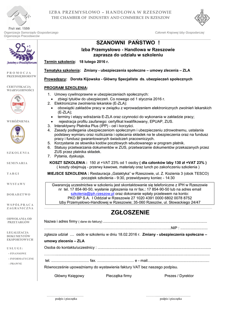 IZBA PRZEMYSŁOWO – HANDLOWA W RZESZOWIE THE CHAMBER OF INDUSTRY AND COMMERCE IN RZESZOW Organizacja Samorządu Gospodarczego Organizacja Pracodawców Członek Krajowej Izby Gospodarczej SZANOWNI PAŃSTWO ! Izba Przemysłowo - Handlowa w Rzeszowie zaprasza do udziału w szkoleniu Termin szkolenia: 18 lutego 2016 r. PROMOCJA PRZEDSIĘBIORSTW CERTYFIKACJA WIARYGODNOŚCI WYRÓŻNIENIA SZKOLENIA SEMINARIA TARGI WYSTAWY DORADZT WO WSPÓŁPRACA ZAGRANICZNA ODWOŁANIA OD PRZETARGÓW Tematyka szkolenia: Zmiany - ubezpieczenia społeczne – umowy zlecenia – ZLA Prowadzący: Dorota Kijowska - Główny Specjalista ds. ubezpieczeń społecznych PROGRAM SZKOLENIA: 1. Umowy cywilnoprawne w ubezpieczeniach społecznych: zbiegi tytułów do ubezpieczeń. Co nowego od 1 stycznia 2016 r. 2. Elektroniczne zwolnienia lekarskie (E-ZLA): obowiązki zakładów pracy w związku z wprowadzeniem elektronicznych zwolnień lekarskich (E-ZLA); terminy i etapy wdrażania E-ZLA oraz czynności do wykonania w zakładzie pracy; rejestracja profilu zaufanego: certyfikat kwalifikowany, EPUAP, ZUS. 3. Interaktywny Płatnika Plus (IPP) - cel i korzyści. 4. Zasady podlegania ubezpieczeniom społecznym i ubezpieczeniu zdrowotnemu, ustalania podstawy wymiaru oraz rozliczania i opłacania składek na te ubezpieczenia oraz na fundusz pracy i fundusz gwarantowanych świadczeń pracowniczych. 5. Korzystanie ze słownika kodów pocztowych wbudowanego w program płatnik. 6. Statusy przetwarzania dokumentów w ZUS, przetwarzanie dokumentów przekazanych przez ZUS przez płatnika składek. 7. Pytania, dyskusja. KOSZT SZKOLENIA : 150 zł +VAT 23% od 1 osoby ( dla członków Izby 130 zł +VAT 23% ) ( koszty obejmują - przerwy kawowe, materiały oraz lunch po zakończeniu szkolenia ) MIEJSCE SZKOLENIA : Restauracja „Galaktyka” w Rzeszowie, ul. Z. Kozienia 3 (obok TESCO) początek szkolenia - 9:30, przewidywany koniec - 14:30 Gwarancją uczestnictwa w szkoleniu jest skontaktowanie się telefoniczne z IPH w Rzeszowie nr tel. 17 854-90-50, wysłanie zgłoszenia na nr fax.: 17 854-90-50 lub na adres email [email protected] oraz dokonanie wpłaty przelewem na konto: PKO BP S.A. I Oddział w Rzeszowie 27 1020 4391 0000 6802 0078 8752 Izby Przemysłowo-Handlowej w Rzeszowie; 35-060 Rzeszów, ul. Słowackiego 24/47 …………………………………………………………………………………………………………………………………………………………………………………………………………………................................... ZGŁOSZENIE Nazwa i adres firmy ( dane do faktury) ................................................................................................... ………………………………………………………………………………………..NIP : .......................... LEGALIZACJA DOKUMENTÓW EKSPORTOWYCH zgłasza udział .... osób w szkoleniu w dniu 18.02.2016 r. Zmiany - ubezpieczenia społeczne – USŁUGI: Osoba do kontaktu/uczestnicy : ............................................................................................................ - FINANSOWE - INFORMATYCZNE - PRAWNE umowy zlecenia – ZLA ………................................................................................................................................................... tel. .................................... fax. ................................... e - mail........................................................... Równocześnie upoważniamy do wystawienia faktury VAT bez naszego podpisu. Główny Księgowy ……………........................................ podpis i pieczątka Pieczątka firmy Prezes / Dyrektor …………........................................................ podpis i pieczątka