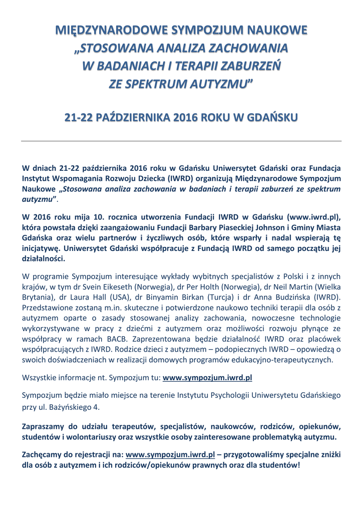 MIĘDZYNARODOWE SYMPOZJUM NAUKOWE „STOSOWANA ANALIZA ZACHOWANIA W BADANIACH I TERAPII ZABURZEŃ ZE SPEKTRUM AUTYZMU” 21-22 PAŹDZIERNIKA 2016 ROKU W GDAŃSKU W dniach 21-22 października 2016 roku w Gdańsku Uniwersytet Gdański oraz Fundacja Instytut Wspomagania Rozwoju Dziecka (IWRD) organizują Międzynarodowe Sympozjum Naukowe „Stosowana analiza zachowania w badaniach i terapii zaburzeń ze spektrum autyzmu”. W 2016 roku mija 10. rocznica utworzenia Fundacji IWRD w Gdańsku (www.iwrd.pl), która powstała dzięki zaangażowaniu Fundacji Barbary Piaseckiej Johnson i Gminy Miasta Gdańska oraz wielu partnerów i życzliwych osób, które wsparły i nadal wspierają tę inicjatywę. Uniwersytet Gdański współpracuje z Fundacją IWRD od samego początku jej działalności. W programie Sympozjum interesujące wykłady wybitnych specjalistów z Polski i z innych krajów, w tym dr Svein Eikeseth (Norwegia), dr Per Holth (Norwegia), dr Neil Martin (Wielka Brytania), dr Laura Hall (USA), dr Binyamin Birkan (Turcja) i dr Anna Budzińska (IWRD). Przedstawione zostaną m.in. skuteczne i potwierdzone naukowo techniki terapii dla osób z autyzmem oparte o zasady stosowanej analizy zachowania, nowoczesne technologie wykorzystywane w pracy z dziećmi z autyzmem oraz możliwości rozwoju płynące ze współpracy w ramach BACB. Zaprezentowana będzie działalność IWRD oraz placówek współpracujących z IWRD. Rodzice dzieci z autyzmem – podopiecznych IWRD – opowiedzą o swoich doświadczeniach w realizacji domowych programów edukacyjno-terapeutycznych. Wszystkie informacje nt. Sympozjum tu: www.sympozjum.iwrd.pl Sympozjum będzie miało miejsce na terenie Instytutu Psychologii Uniwersytetu Gdańskiego przy ul. Bażyńskiego 4. Zapraszamy do udziału terapeutów, specjalistów, naukowców, rodziców, opiekunów, studentów i wolontariuszy oraz wszystkie osoby zainteresowane problematyką autyzmu. Zachęcamy do rejestracji na: www.sympozjum.iwrd.pl – przygotowaliśmy specjalne zniżki dla osób z autyzmem i ich rodziców/opiekunów prawnych oraz dla studentów!