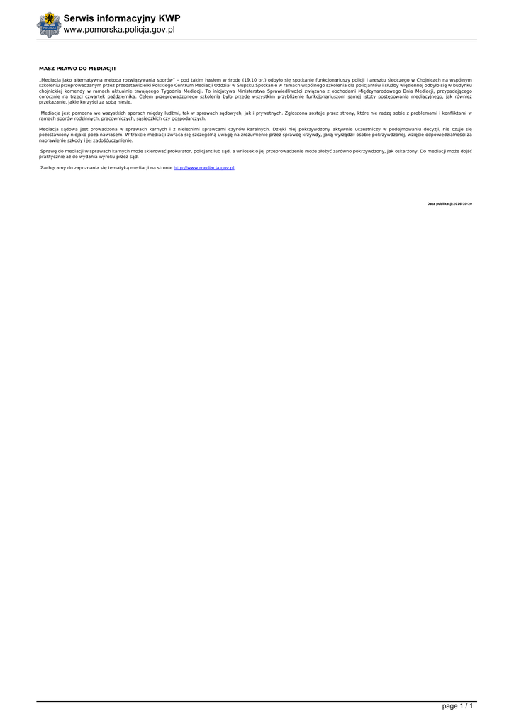 Serwis informacyjny KWP www.pomorska.policja.gov.pl MASZ PRAWO DO MEDIACJI! „Mediacja jako alternatywna metoda rozwiązywania sporów” – pod takim hasłem w środę (19.10 br.) odbyło się spotkanie funkcjonariuszy policji i aresztu śledczego w Chojnicach na wspólnym szkoleniu przeprowadzanym przez przedstawicielki Polskiego Centrum Mediacji Oddział w Słupsku.Spotkanie w ramach wspólnego szkolenia dla policjantów i służby więziennej odbyło się w budynku chojnickiej komendy w ramach aktualnie trwającego Tygodnia Mediacji. To inicjatywa Ministerstwa Sprawiedliwości związana z obchodami Międzynarodowego Dnia Mediacji, przypadającego corocznie na trzeci czwartek października. Celem przeprowadzonego szkolenia było przede wszystkim przybliżenie funkcjonariuszom samej istoty postępowania mediacyjnego, jak również przekazanie, jakie korzyści za sobą niesie. Mediacja jest pomocna we wszystkich sporach między ludźmi, tak w sprawach sądowych, jak i prywatnych. Zgłoszona zostaje przez strony, które nie radzą sobie z problemami i konfliktami w ramach sporów rodzinnych, pracowniczych, sąsiedzkich czy gospodarczych. Mediacja sądowa jest prowadzona w sprawach karnych i z nieletnimi sprawcami czynów karalnych. Dzięki niej pokrzywdzony aktywnie uczestniczy w podejmowaniu decyzji, nie czuje się pozostawiony niejako poza nawiasem. W trakcie mediacji zwraca się szczególną uwagę na zrozumienie przez sprawcę krzywdy, jaką wyrządził osobie pokrzywdzonej, wzięcie odpowiedzialności za naprawienie szkody i jej zadośćuczynienie. Sprawę do mediacji w sprawach karnych może skierować prokurator, policjant lub sąd, a wniosek o jej przeprowadzenie może złożyć zarówno pokrzywdzony, jak oskarżony. Do mediacji może dojść praktycznie aż do wydania wyroku przez sąd. Zachęcamy do zapoznania się tematyką mediacji na stronie http://www.mediacja.gov.pl Data publikacji:2016-10-20 page 1 / 1 Powered by TCPDF (www.tcpdf.org)