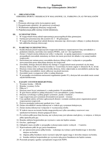 Regulamin Piłkarska Liga Gimnazjalistów 2016/2017 I. II. ORGANIZATOR: OŚRODEK SPORTU I REKREACJI W MALANOWIE, UL. PARKOWA 29, 62-709 MALANÓW CEL: 1. Promocja zdrowego stylu życia poprzez sport. 2. Przygotowanie młodzież do sportowej rywalizacji. 3. Wyłonienie najlepszej drużyny rozgrywek. 4. Popularyzacja piłki nożnej wśród młodzieży. III. UCZESTNICTWO: 1. W rozgrywkach biorą udział reprezentacje poszczególnych klas gimnazjum. 2. Turniej jest przeznaczony dla uczniów kl. I – III gimnazjum. 3. W rozgrywkach mogą brać udział drużyny mieszane (np. dziewczęta i chłopcy w jednej drużynie lub oddzielne drużyny dziewcząt) IV. WARUNKI UCZESTNICTWA: 1. Każda drużyna przed rozpoczęciem rozgrywek dostarczy organizatorowi listę zawodników z podaniem imienia, nazwiska oraz numeru PESEL, (zał. nr 1 do regulaminu). 2. Zmian w listach można dokonywać tylko i wyłącznie za zgodą organizatora w uzasadnionych przypadkach (zawodnik zmieniony na liście nie może powrócić do składu w tej samej rundzie rozgrywek) 3. Dozwolona jest zmiana przez zawodnika drużyny (klasy) tylko i wyłącznie w przypadku niewystawienia przez daną klasę drużyny do rozgrywek. 4. Zawodnik, którego drużyna (klasa) nie startuje w rozgrywkach może przenieść się do innej drużyny (klasy) tylko w swoim roczniku tz. Uczeń klasy Ia może zagrać w drużynie Ib, Ic, Id itd. 5. Drużyna winna mieć jednego kierownika drużyny, który odpowiada za zawodników podczas ligi. 6. Weryfikacja zawodników może odbywać się przed meczem. 7. Zawodnik może występować tylko w jednej drużynie. 8. W przypadku stwierdzenia naruszenia regulaminu (punkt IV), drużyna lub zawodnik może zostać zdyskwalifikowana. V. ZASADY I SYSTEM ROZGRYWEK: Wymiary boiska – ORLIK Bramka: wymiary 2x5m Piłka nr 5 Drużyna musi liczyć minimum 6, a maksymalnie 10 zawodników. W grze bierze udział (w jednej drużynie) 5-ciu zawodników z pola i bramkarz. Drużyny rywalizują w jednej grupie systemem „każdy z każdym”, Liga rozgrywana jest systemem dwurundowym (jesień - wiosna) Czas spotkań zależy od ilości zgłoszonych drużyn i zostanie ustalony przez organizatora przed rozpoczęciem rozgrywek. 9. Przerwa pomiędzy połowami spotkań trwa 1 min 10. Zmian zawodników można dokonywać w trakcie gry systemem hokejowym, 11. Zmian można dokonywać wyłącznie w wyznaczonej strefie. 12. W trakcie meczu na terenie boiska mogą przebywać tylko zawodnicy rezerwowi oraz opiekunowie/trenerzy drużyn grających mecz. 13. Po wybiciu piłki poza linię boczną, aut wykonywany jest rękoma znad głowy, w miejscu, w którym piłka opuściła pole gry. 14. Bramka zdobyta bezpośrednio po wyrzucie z autu nie będzie uznana. 15. Gra bez „spalonego”. 16. Odległość muru od piłki w przypadku wykonywania rzutów wolnych – 5 metrów. 17. Wprowadzenie piłki do gry przez bramkarza: a) po opuszczeniu przez piłkę boiska – wykonuje się wykop z pola bramkowego w dowolne miejsce na boisku. b) złapana piłkę bramkarz może wyrzucić ręką lub zagrać nogą w dowolne miejsce na boisku. c) bramka zdobyta bezpośrednio po wyrzucie ręką przez bramkarza nie będzie uznana. 20. Pozostałe przepisy zgodne z przepisami rozgrywek PZPN. 1. 2. 3. 4. 5. 6. 7. 8. VI. 1. 2. 3. 4. VII. 1. 2. 3. 4. 5. 6. VIII. IX. PUNKTACJA. Za wygrany mecz drużyna otrzymuje 3 punkty, za remis 1 punkt, w przypadku porażki 0 punktów. O miejscu w tabeli decyduje liczba zdobytych punktów. W przypadku uzyskania równej liczby punktów przez dwa zespoły, o kolejności decydują: a) wynik bezpośredniego spotkania pomiędzy tymi drużynami, b) lepsza różnica bramek w lidze, c) większa liczba zdobytych bramek w lidze. W przypadku uzyskania równej liczby punktów przez klika zespołów (3 i więcej) o kolejności decyduje tzw. "mała tabela” (o kolejności w „małej tabeli” decydują takie same kryteria jak w punkcie 2 podpunkty a, b, c). W przypadku ustalania tabeli końcowej rozgrywek o kolejności decydują powyższe kryteria z punktów 1, 2, 3. KARY. Kary regulaminowe: Upomnienie, a) żółta kartka, b) czerwona kartka, Zawodnik ukarany czerwoną kartką w trakcie gry pauzuje w następnym meczu. Otrzymane przez zawodnika 2 żółte kartki, a konsekwencji czerwona w trakcie meczu nie zobowiązują go do pauzowania w następnym spotkaniu. Uzbieranie przez zawodnika 4 żółtych kartek w rozgrywkach zobowiązuje go do pauzowania w kolejnym meczu. Jeżeli dojdzie do bójki pomiędzy zawodnikami, zostają oni zdyskwalifikowani do końca rozgrywek. SPRZĘT. 1. Dozwolona jest gra tylko w obuwiu miękkim, tj. buty halowe, turfy, korki gumowe. 2. Bezwzględnie zakazana jest gra w korkach plastikowych bądź metalowych, kolcach itp. 3. Jeżeli jedna z drużyn nie posiada jednolitych strojów, wówczas zobowiązana jest do założenia plastronów. KLASYFIKACJE. 1. Prowadzona będzie klasyfikacja strzelców bramek, w celu wyłonienia króla strzelców ligi. 2. Prowadzona będzie klasyfikacja żółtych i czerwonych kartek. 3. Prowadzona będzie klasyfikacja na najlepszego bramkarza: a) bramkarz, który najwięcej razy zachował „czyste konto bramkowe”, b) bramkarz, który wpuścił najmniej bramek podczas ligi. X. NAGRODY. 1. Drużyny z miejsc I-III otrzymają pamiątkowe puchary. 2. Wszystkie drużyny otrzymają pamiątkowe dyplomy. 3. Nagrody indywidualne: - król strzelców - najlepszy bramkarz XI. SPRAWY ORGANIZACYJNE. 1. Organizatorzy informują, że obiekt jest monitorowany i dodatkowo obserwowany przez organizatorów. 2. Organizatorzy zapewniają podstawową opiekę medyczną. 3. Organizatorzy zapewniają obsługę sędziowską. 4. Organizatorzy nie ponoszą odpowiedzialności za rzeczy pozostawione na obiekcie 5. W przypadku stwierdzenia przez organizatorów szkód lub zniszczeń na terenie obiektu sportowego gdzie odbywa się dana impreza sportowa, organizatorzy mają prawo wyciągnąć konsekwencje wobec sprawców zaistniałego zda