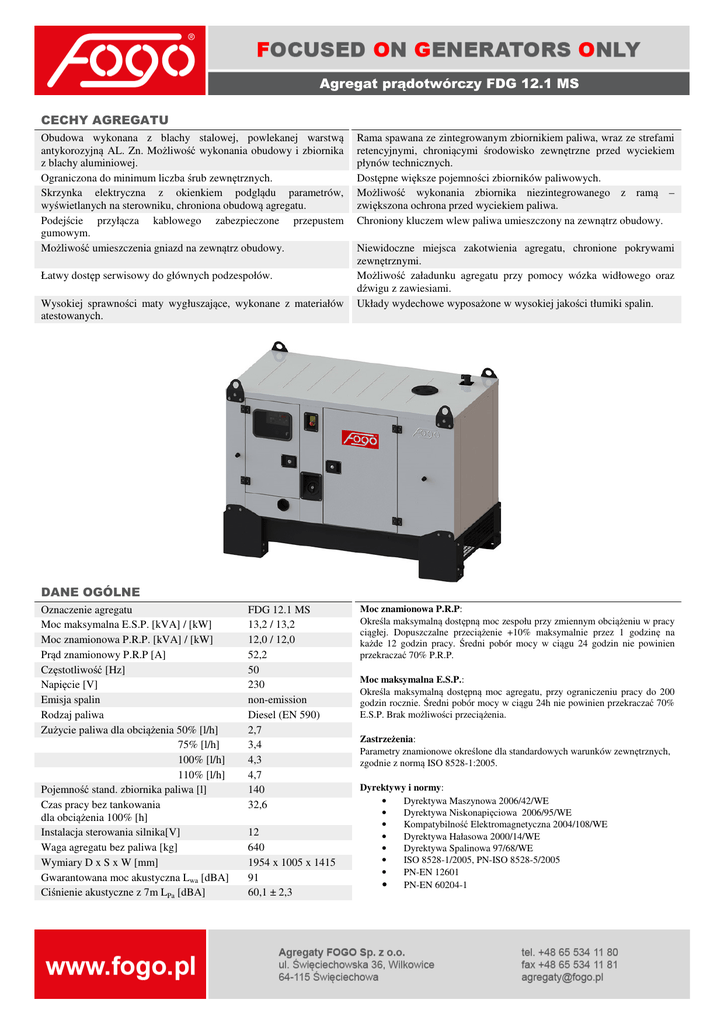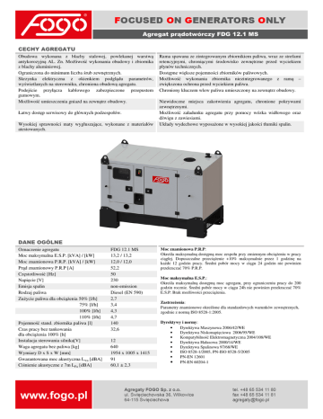 Agregat prądotwórczy FDG 12.1 MS CECHY AGREGATU Obudowa wykonana z blachy stalowej, powlekanej warstwą antykorozyjną AL. Zn. Możliwość wykonania obudowy i zbiornika z blachy aluminiowej. Ograniczona do minimum liczba śrub zewnętrznych. Skrzynka elektryczna z okienkiem podglądu parametrów, wyświetlanych na sterowniku, chroniona obudową agregatu. Podejście przyłącza kablowego zabezpieczone przepustem gumowym. Możliwość umieszczenia gniazd na zewnątrz obudowy. Łatwy dostęp serwisowy do głównych podzespołów. Wysokiej sprawności maty wygłuszające, wykonane z materiałów atestowanych. Rama spawana ze zintegrowanym zbiornikiem paliwa, wraz ze strefami retencyjnymi, chroniącymi środowisko zewnętrzne przed wyciekiem płynów technicznych. Dostępne większe pojemności zbiorników paliwowych. Możliwość wykonania zbiornika niezintegrowanego z ramą – zwiększona ochrona przed wyciekiem paliwa. Chroniony kluczem wlew paliwa umieszczony na zewnątrz obudowy. Niewidoczne miejsca zakotwienia agregatu, chronione pokrywami zewnętrznymi. Możliwość załadunku agregatu przy pomocy wózka widłowego oraz dźwigu z zawiesiami. Układy wydechowe wyposażone w wysokiej jakości tłumiki spalin. DANE OGÓLNE Oznaczenie agregatu Moc maksymalna E.S.P. [kVA] / [kW] Moc znamionowa P.R.P. [kVA] / [kW] Prąd znamionowy P.R.P [A] Częstotliwość [Hz] Napięcie [V] Emisja spalin Rodzaj paliwa Zużycie paliwa dla obciążenia 50% [l/h] 75% [l/h] 100% [l/h] 110% [l/h] Pojemność stand. zbiornika paliwa [l] Czas pracy bez tankowania dla obciążenia 100% [h] Instalacja sterowania silnika[V] Waga agregatu bez paliwa [kg] Wymiary D x S x W [mm] Gwarantowana moc akustyczna Lwa [dBA] Ciśnienie akustyczne z 7m LPa [dBA] FDG 12.1 MS 13,2 / 13,2 12,0 / 12,0 52,2 50 230 non-emission Diesel (EN 590) 2,7 3,4 4,3 4,7 140 32,6 12 640 1954 x 1005 x 1415 91 60,1 ± 2,3 Moc znamionowa P.R.P: Określa maksymalną dostępną moc zespołu przy zmiennym obciążeniu w pracy ciągłej. Dopuszczalne przeciążenie +10% maksymalnie przez 1 godzinę na każde 12 godzin pracy. Średni pobór mocy w ciągu 24 godzin nie powinien przekraczać 70% P.R.P. Moc maksymalna E.S.P.: Określa maksymalną dostępną moc agregatu, przy ograniczeniu pracy do 200 godzin rocznie. Średni pobór mocy w ciągu 24h nie powinien przekraczać 70% E.S.P. Brak możliwości przeciążenia. Zastrzeżenia: Parametry znamionowe określone dla standardowych warunków zewnętrznych, zgodnie z normą ISO 8528-1:2005. Dyrektywy i normy: • Dyrektywa Maszynowa 2006/42/WE • Dyrektywa Niskonapięciowa 2006/95/WE • Kompatybilność Elektromagnetyczna 2004/108/WE • Dyrektywa Hałasowa 2000/14/WE • Dyrektywa Spalinowa 97/68/WE • ISO 8528-1/2005, PN-ISO 8528-5/2005 • PN-EN 12601 • PN-EN 60204-1 Agregat prądotwórczy FDG 12.1 MS STEROWNIK STANDARD Typ sterownika: AMF 25 Intuicyjny interfejs graficzny Zegar czasu rzeczywistego z akumulatorem Kontrola zasilania sieciowego, automatyczny start generatora Dziennik zdarzeń: do 119 pozycji Pomiar wartości prądu w 3 fazach Pomiar wartości napięcia sieci i generatora Pomiar mocy czynnej, biernej i pozornej Licznik energii czynnej i biernej generatora Licznik czasu pracy Pomiar napięcia akumulatora Pomiar poziomu paliwa Ochrona generatora (częstotliwość, napięcie, asymetria, przeciążenie) Obsługa silników z protokołem CAN wg. standardu J1939 Komunikacja RS 485 Modbus oraz RS232 (wymagany moduł IL-NT RS232-485) Obsługa zdalna przez GPRS (wymagany moduł IL-NT GPRS) Obsługa zdalna przez Internet (wymagany moduł IB-Lite) Darmowy system InteliMonitor do podglądu parametrów agregatów Darmowa aplikacja WebSupervisor dla Android lub iOS do podglądu floty agregatów Wysyłanie powiadomień o błędach poprzez SMS lub e-mail (wymagany moduł IL-NT GPRS lub IB-Lite) SILNIK Producent silnika Typ silnika Kraj produkcji Moc silnika netto [kW] Emisja spalin* Obroty [obr/min] Regulacja obrotów Klasa wykonania** Pojemność silnika [l] Liczba cylindrów Układ paliwowy Instalacja [V] Płyn chłodzący Pojemność cieczy chłodzącej [l] Olej silnikowy Pojemność miski olejowej [l] Rodzaj paliwa Zużycie paliwa dla obciążenia 75% [l/h] Zużycie paliwa dla obciążenia 100% [l/h] * PRĄDNICA Mitsubishi S4L2-61SD Indie 13,9 non-emission 1500 mechaniczna G2 1,8 4 12 Anti Freeze 2,5 Shell Rimula R4L 6,0 Diesel (EN 590) 3,4 4,3 Zgodnie z Dyrektywą 97/68/WE dotyczącą ograniczenia emisji zanieczyszczeń gazowych i pyłowych z silników spalinowych, montowanych w maszynach samojezdnych, nieporuszających się po drogach. ** Zgodnie z normą PN-ISO 8528-5/1997 Producent prądnicy Typ prądnicy Kraj produkcji Moc prądnicy (40 ºC, 1000m n.p.m.) [kVA] Moc prądnicy (27 ºC, 1000m n.p.m.) [kVA] Sprawność prądnicy [%] Stabilizacja napięcia Poziom stabilizacji napięcia [%] Ochrona Klasa izolacji Odkształcenia harmoniczne prądu THD [%] Reaktancja Xd’’ [%] * Sincro* SK160CA1 Włochy 14,5 16,0 86,8 AVR analogowy +/- 1 IP 23 H <3,0 Możliwość zabudowy prądnicy firmy STAMFORD lub innej, wskazanej przez klienta. Dane znamionowe agregatu mogą w takim przypadku ulec zmianie. Agregat prądotwórczy FDG 12.1 MS WYPOSAŻENIE STANDARDOWE Sterownik AMF25 Wyłącznik sterownika Wyłącznik agregatu Eaton FAZ-Z63/1 Cewka wzrostowa wyłącznika generatora Analogowy AVR Sygnalizator dźwiękowy awarii Przycisk awaryjnego zatrzymania Akumulator rozruchowy 75 Ah Ładowarka akumulatora Świece żarowe Grzałka silnika z termostatem Olej silnikowy Shell Rimula R4L Kontrola niskiego ciśnienia oleju Kontrola wysokiej temperatury silnika Ramozbiornik z przestrzenią retencyjną Zamykany wlew paliwa na zewnątrz obudowy Pomiar poziomu paliwa Tłumik spalin z kompensatorem drgań Płyn chłodzący Anti Freeze Wlew płynu chłodzącego na dachu obudowy Zawór spustowy płynu chłodniczego Wibroizolatory drgań silnika i prądnicy Obudowa wyciszona, wykonana z blachy Al-Zn Standardowy kolor RAL