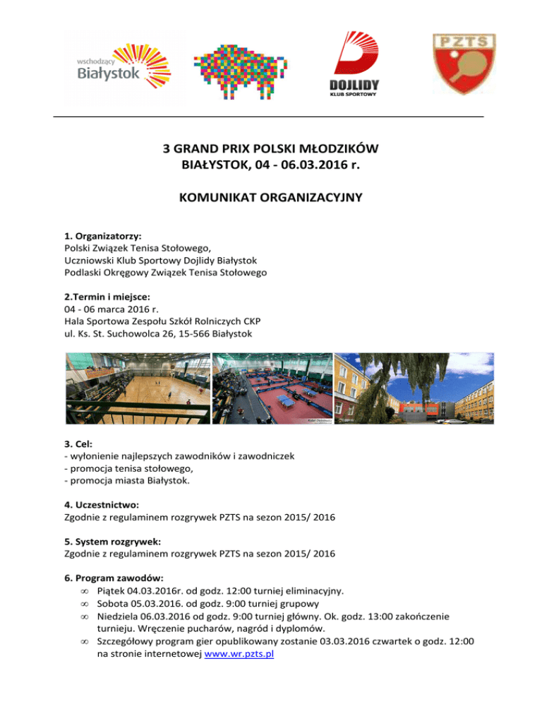 3 GRAND PRIX POLSKI MŁODZIKÓW BIAŁYSTOK, 04 - 06.03.2016 r. KOMUNIKAT ORGANIZACYJNY 1. Organizatorzy: Polski Związek Tenisa Stołowego, Uczniowski Klub Sportowy Dojlidy Białystok Podlaski Okręgowy Związek Tenisa Stołowego 2.Termin i miejsce: 04 - 06 marca 2016 r. Hala Sportowa Zespołu Szkół Rolniczych CKP ul. Ks. St. Suchowolca 26, 15-566 Białystok 3. Cel: - wyłonienie najlepszych zawodników i zawodniczek - promocja tenisa stołowego, - promocja miasta Białystok. 4. Uczestnictwo: Zgodnie z regulaminem rozgrywek PZTS na sezon 2015/ 2016 5. System rozgrywek: Zgodnie z regulaminem rozgrywek PZTS na sezon 2015/ 2016 6. Program zawodów: • Piątek 04.03.2016r. od godz. 12:00 turniej eliminacyjny. • Sobota 05.03.2016. od godz. 9:00 turniej grupowy • Niedziela 06.03.2016 od godz. 9:00 turniej główny. Ok. godz. 13:00 zakończenie turnieju. Wręczenie pucharów, nagród i dyplomów. • Szczegółowy program gier opublikowany zostanie 03.03.2016 czwartek o godz. 12:00 na stronie internetowej www.wr.pzts.pl 7. Sprzęt sportowy: - zawody zostaną rozegrane na 16 stołach z atestem ITTF piłeczkami Andro 40+ PCV ***, - obowiązuje obuwie sportowe na jasnych podeszwach i strój sportowy 8. Zgłoszenia: Zgłoszenie wraz z potwierdzeniem dokonania opłaty wpisowego w wysokości 30 zł należy przesłać w nieprzekraczalnym terminie do dnia 1 marca 2016 do godziny 21:00 na adresy emailowe: Przewodniczący Wydziału Rozgrywek PZTS Marek Przybyłowicz, tel. 607 922 249, e-mail: [email protected] oraz Organizator Piotr Anchim, tel. 792 313 001, e-mail: [email protected] Wpisowe w wysokości 30 zł należy dokonać na rachunek: SBR Bank: 43 8769 0002 0391 6548 2000 0010 w treści wpisując: „wpisowe do 3 Grand Prix Młodzików – imię i nazwisko zawodnika” UKS Dojlidy Białystok ul. Ks. St. Suchowolca 26 15-566 Białystok 9. Zakwaterowanie: • Hotel Santana ( tel. 857437700 ) - 55 miejsc, standard *** www.hotelsantana.pl Białystok, ul. Baranowicka 55 (2 km od miejsca zawodów): - Cena za pokój 2- osobowy ze śniadaniem 196 zł - Cena za pokój 3- osobowy ze śniadaniem 247 zł - Cena za pokój 4- osobowy ze śniadaniem 289 zł - bezpłatny parking - cena podana przez organizatora na hasło „tenis stołowy” - rezerwacji i płatności dokonujemy bezpośrednio w Hotelu Santana - pierwszeństwo rezerwacji mają osoby zamawiające na 2 bądź 3 doby • Internat Zespołu Szkół Rolniczych, 100 miejsc standard * Białystok, ul. Ks. St. Suchowolca 26 (miejsce zawodów): - Cena za osobę ze śniadaniem w pokoju 2,3 lub 4-osobowym – 50 zł - bezpłatny parking - rezerwacji i płatności dokonujemy przez Organizatora ( Marcin Klejno, tel. 789164355, e-mail: [email protected] - pierwszeństwo rezerwacji mają osoby zamawiające na 2 bądź 3 doby 10. Wyżywienie: W trakcie trwania zawodów będzie można bezpośrednio u Organizatora zamówić obiady w cenie 17 zł. / os 11. Nagrody: Zawodniczki i zawodnicy, którzy zajęli miejsca 1 i 2 oraz 3-4 w turnieju głównym otrzymają dyplomy, puchary oraz nagrody rzeczowe. 12. Kontakt do Organizatora: Piotr Anchim, tel. 792313001, e-mail: [email protected] Marcin Klejno, tel. 789164355, e-mail: [email protected]