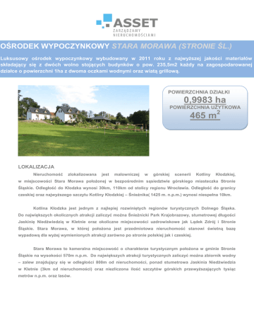 OŚRODEK WYPOCZYNKOWY STARA MORAWA (STRONIE ŚL.) Luksusowy ośrodek wypoczynkowy wybudowany w 2011 roku z najwyższej jakości materiałów składający się z dwóch wolno stojących budynków o pow. 235,5m2 każdy na zagospodarowanej działce o powierzchni 1ha z dwoma oczkami wodnymi oraz wiatą grillową. POWIERZCHNIA DZIAŁKI 0,9983 ha POWIERZCHNIA UŻYTKOWA 465 m2 LOKALIZACJA Nieruchomość zlokalizowana jest malowniczej w górskiej scenerii Kotliny Kłodzkiej, w miejscowości Stara Morawa położonej w bezpośrednim sąsiedztwie górskiego miasteczka Stronie Śląskie. Odległość do Kłodzka wynosi 30km, 110km od stolicy regionu Wrocławia. Odległość do granicy czeskiej oraz najwyższego szczytu Kotliny Kłodzkiej – Śnieżnika( 1425 m. n.p.m.) wynosi niespełna 10km. Kotlina Kłodzka jest jednym z najlepiej rozwiniętych regionów turystycznych Dolnego Śląska. Do największych okolicznych atrakcji zaliczyć można Śnieżnicki Park Krajobrazowy, stumetrowej długości Jaskinię Niedźwiedzią w Kletnie oraz okoliczne miejscowości uzdrowiskowe jak Lądek Zdrój i Stronie Śląskie. Stara Morawa, w której położona jest przedmiotowa nieruchomość stanowi świetną bazę wypadową dla wyżej wymienionych atrakcji zarówno po stronie polskiej jak i czeskiej. Stara Morawa to kameralna miejscowość o charakterze turystycznym położona w gminie Stronie Śląskie na wysokości 570m n.p.m. Do największych atrakcji turystycznych zaliczyć można zbiornik wodny – zalew znajdujący się w odległości 800m od nieruchomości, ponad stumetrowa Jaskinia Niedźwiedzia w Kletnie (3km od nieruchomości) oraz niezliczona ilość szczytów górskich przewyższających tysiąc metrów n.p.m. oraz lasów. Czarna Góra - największy, poza Zieleńcem, kurort narciarski w polskiej części Sudetów położony w miejscowości Sienna, położony ok. 8 km od Starej Morawy. W skład kompleksu wchodzi m.in. 6 tras narciarskich (w tym także w pełni dośnieżane) oraz krzesełkowa kolej linowa. Zalew w Starej Morawie - Rekreacyjne kąpielisko w Starej Morawie położone 800m od przedstawianej nieruchomości. Piaszczysta plaża, bar, pole namiotowe, pomosty, rowery wodne, kajaki i możliwość wędkowania zapewniają masę możliwości na ciekawe spędzenie wolnego czasu. Śnieżnik - najwyższy szczyt Kotliny Kłodzkiej (1425m.n.p.m.) na pograniczu polsko – czeskim. 22 kilometry szlaków w Masywie Śnieżnika, źródła rzeki Morawy czy też schronisko Pod Śnieżnikiem gwarantują długie godziny spędzone na szlaku wokół zieleni oraz piękne widoki na okoliczne pasma górskie. Wapiennik w Starej Morawie – Budowla (piec wapienniczy) z XIX wieku odrestaurowana w 1978 roku służy aktualnie jako Muzeum Przemysłu Wapienniczego oraz miejsce imprez kulturalnych. Czarna Żmija – najdłuższa zjeżdżalnia grawitacyjna znajduje się w kompleksie Czarna Góra (Sienna). Jaskinia Niedźwiedzia w Kletnie – jedna z największych atrakcji Kotliny Kłodzkiej, najdłuższa (ponad stumetrowa) jaskinia w Sudetach odkryta W 1966 roku, do zwiedzania dostępna jest trasa turystyczna o długości 250m wraz z atrakcjami np. szkielet niedźwiedzia jaskiniowego znaleziony w jaskini. NIERUCHOMOŚĆ Obiekt składa się z działki gruntu o powierzchni 0,9983ha, dwóch wolno stojących budynków o powierzchni 232,50m2 każdy (łącznie 465m2), oraz przestronnej wiaty/hali grillowej i miejsca na ognisko. Działka jest w pełni zagospodarowana, w części ogrodzona oraz obsadzona dojrzałymi drzewami iglastymi zapewniającymi intymność oraz cień w letnie popołudnia. Na terenie ośrodka znajdują się boisko do siatkówki, przestronna drewniana wiata/hala grillowa. Przez środek działki, w znacznym oddaleniu od zabudowań przepływa urokliwy strumyk. Na terenie nieruchomości znajdują się dwa wolno stojące budynki wybudowane w 2011 roku wybudowane z materiałów najwyższej jakości (ściany wykonane z pustaków ceramicznych Porotherm, strop żelbetowy gęstożebrowy Teriva, schody wejściowe i wewnątrz budynków granitowe, parapety wewnętrzne granitowe, zewnętrzne z piaskowca). Do dyspozycji gości 16 pokoi o wysokim standardzie (pierwszy budynek – 9 pokoi, drugi – 7), wykończonych drewnem oraz kamieniem. Każdy z pokoi posiada łazienkę. Ponadto w każdym budynku znajduje się aneks kuchenny do dyspozycji gości. Na terenie obiektu znajduje się w pełni wyposażony punkt gastronomiczny na 40 miejsc. Obydwa budynki wyposażone są w piece na biomasę. Nieruchomość posiada bardzo duże możliwości dostosowania do wymagań nabywcy. Aktualnie wykorzystywana jest jako bardzo dobrze prosperujący ośrodek wypoczynkowy. Obiekt może zostać przekształcony w dwa niezależne domy jednorodzinne, apartamenty na wynajem, agroturystykę czy też pokoje gościnne. CENA NIERUCHOMOŚCI 2 500 000,00 PLN WRAZ Z WYPOSAŻENIEM! KONTAKT Asset Nieruchomości sp. z o.o. [email protected] www.asset-nieruchomosci.pl osoba odpowiedzialna: Maciej Kamiński tel. 781 722 150