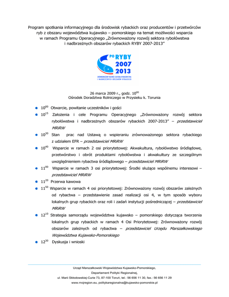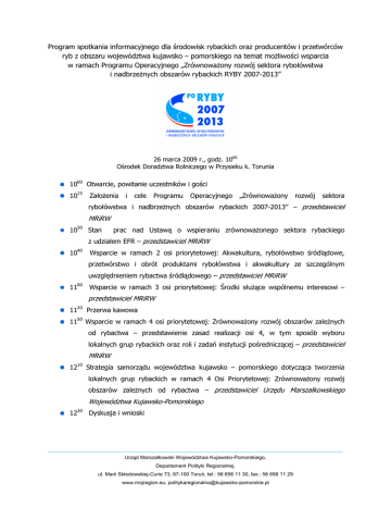 Program spotkania informacyjnego dla środowisk rybackich oraz producentów i przetwórców ryb z obszaru województwa kujawsko – pomorskiego na temat moŜliwości wsparcia w ramach Programu Operacyjnego „ZrównowaŜony rozwój sektora rybołówstwa i nadbrzeŜnych obszarów rybackich RYBY 2007-2013” 26 marca 2009 r., godz. 1000 Ośrodek Doradztwa Rolniczego w Przysieku k. Torunia 1000 Otwarcie, powitanie uczestników i gości 1015 ZałoŜenia i cele Programu Operacyjnego „ZrównowaŜony rozwój sektora rybołówstwa i nadbrzeŜnych obszarów rybackich 2007-2013” – przedstawiciel MRiRW 1030 Stan prac nad Ustawą o wspieraniu zrównowaŜonego sektora rybackiego z udziałem EFR – przedstawiciel MRiRW 40 10 Wsparcie w ramach 2 osi priorytetowej: Akwakultura, rybołówstwo śródlądowe, przetwórstwo i obrót produktami rybołówstwa i akwakultury ze szczególnym uwzględnieniem rybactwa śródlądowego – przedstawiciel MRiRW 00 11 Wsparcie w ramach 3 osi priorytetowej: Środki słuŜące wspólnemu interesowi – przedstawiciel MRiRW 20 11 Przerwa kawowa 1150 Wsparcie w ramach 4 osi priorytetowej: ZrównowaŜony rozwój obszarów zaleŜnych od rybactwa – przedstawienie zasad realizacji osi 4, w tym sposób wyboru lokalnych grup rybackich oraz roli i zadań instytucji pośredniczącej – przedstawiciel MRiRW 1210 Strategia samorządu województwa kujawsko – pomorskiego dotycząca tworzenia lokalnych grup rybackich w ramach 4 Osi Priorytetowej: ZrównowaŜony rozwój obszarów zaleŜnych od rybactwa – przedstawiciel Urzędu Marszałkowskiego Województwa Kujawsko-Pomorskiego 1230 Dyskusja i wnioski _____________________________________________________________________________________________________ Urząd Marszałkowski Województwa Kujawsko-Pomorskiego, Departament Polityki Regionalnej, ul. Marii Skłodowskiej-Curie 73, 87-100 Toruń, tel.: 56 656 11 30, fax.: 56 656 11 29 www.mojregion.eu, [email protected]