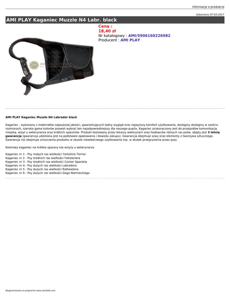 Informacje o produkcie Utworzono 07-03-2017 AMI PLAY Kaganiec Muzzle N4 Labr. black Cena : 18,40 zł Nr katalogowy : AMI/5906160226982 Producent : AMI PLAY AMI PLAY Kaganiec Muzzle N4 Labrador black Kaganiec - wykonany z materiałów najwyższej jakości, gwarantujących ładny wygląd oraz najwyższy komfort użytkowania, dostępny dostępny w sześciu rozmiarach, szeroka gama kolorów pozwoli wybrać ten najodpowiedniejszy dla naszego pupila. Kaganiec przeznaczony jest do przejazdów komunikacją miejską, wizyt u weterynarza oraz krótkich spacerów. Produkt testowany przez lekarzy weterynarii oraz hodowców różnych ras psów, objęty jest 3 letnią gwarancją (gwarancja udzielana jest na podstawie opakowania i dowodu zakupu). Gwarancja obejmuje szwy oraz elementy z tworzywa sztucznego. Gwarancja nie obejmuje zniszczenia produktu w skutek niewłaściwego użytkowania (np. w skutek przegryzienia przez psa). Kolorowy kaganiec na krótkie spacery lub wizyty u weterynarza Kaganiec nr 1 - Psy małych ras wielkości Yorkshire Terrier Kaganiec nr 2 - Psy średnich ras wielkości Foksteriera Kaganiec nr 3 - Psy średnich ras wielkości Cocker Spaniela Kaganiec nr 4 - Psy dużych ras wielkości Labradora Kaganiec nr 5 - Psy dużych ras wielkości Rottwielera Kaganiec nr 6 - Psy dużych ras wielkości Doga Niemieckiego Wygenerowano w programie www.oscGold.com