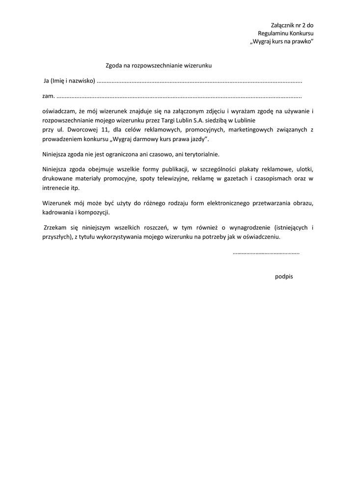 Załącznik nr 2 do Regulaminu Konkursu „Wygraj kurs na prawko” Zgoda na rozpowszechnianie wizerunku Ja (Imię i nazwisko) ............................................................................................................................ zam. .................................................................................................................................................... oświadczam, że mój wizerunek znajduje się na załączonym zdjęciu i wyrażam zgodę na używanie i rozpowszechnianie mojego wizerunku przez Targi Lublin S.A. siedzibą w Lublinie przy ul. Dworcowej 11, dla celów reklamowych, promocyjnych, marketingowych związanych z prowadzeniem konkursu „Wygraj darmowy kurs prawa jazdy”. Niniejsza zgoda nie jest ograniczona ani czasowo, ani terytorialnie. Niniejsza zgoda obejmuje wszelkie formy publikacji, w szczególności plakaty reklamowe, ulotki, drukowane materiały promocyjne, spoty telewizyjne, reklamę w gazetach i czasopismach oraz w intrenecie itp. Wizerunek mój może być użyty do różnego rodzaju form elektronicznego przetwarzania obrazu, kadrowania i kompozycji. Zrzekam się niniejszym wszelkich roszczeń, w tym również o wynagrodzenie (istniejących i przyszłych), z tytułu wykorzystywania mojego wizerunku na potrzeby jak w oświadczeniu. …………………………………….. podpis