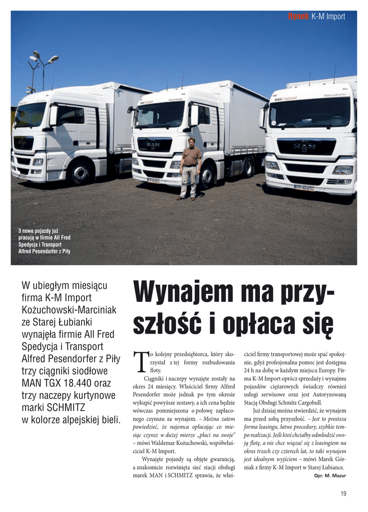 Rynek K-M Import 3 nowe pojazdy już pracują w firmie All Fred Spedycja i Transport Alfred Pesendorfer z Piły W ubiegłym miesiącu firma K-M Import Kożuchowski-Marciniak ze Starej Łubianki wynajęła firmie All Fred Spedycja i Transport Alfred Pesendorfer z Piły trzy ciągniki siodłowe MAN TGX 18.440 oraz trzy naczepy kurtynowe marki SCHMITZ w kolorze alpejskiej bieli. Wynajem ma przyszłość i opłaca się T o kolejny przedsiębiorca, który skorzystał z tej formy rozbudowania floty. Ciągniki i naczepy wynajęte zostały na okres 24 miesięcy. Właściciel firmy Alfred Pesendorfer może jednak po tym okresie wykupić powyższe zestawy, a ich cena będzie wówczas pomniejszona o połowę zapłaconego czynszu za wynajem. – Można zatem powiedzieć, że najemca opłacając co miesiąc czynsz w dużej mierze „płaci na swoje” – mówi Waldemar Kożuchowski, współwłaściciel K-M Import. Wynajęte pojazdy są objęte gwarancją, a znakomicie rozwinięta sieć stacji obsługi marek MAN i SCHMITZ sprawia, że właś- ciciel firmy transportowej może spać spokojnie, gdyż profesjonalna pomoc jest dostępna 24 h na dobę w każdym miejscu Europy. Firma K-M Import oprócz sprzedaży i wynajmu pojazdów ciężarowych świadczy również usługi serwisowe oraz jest Autoryzowaną Stacją Obsługi Schmitz Cargobull. Już dzisiaj można stwierdzić, że wynajem ma przed sobą przyszłość. – Jest to prostsza forma leasingu, łatwe procedury, szybkie tempo realizacji. Jeśli ktoś chciałby odmłodzić swoją flotę, a nie chce wiązać się z leasingiem na okres trzech czy czterech lat, to taki wynajem jest idealnym wyjściem – mówi Marek Górniak z firmy K-M Import w Starej Łubiance. Opr. M. Mazur 19