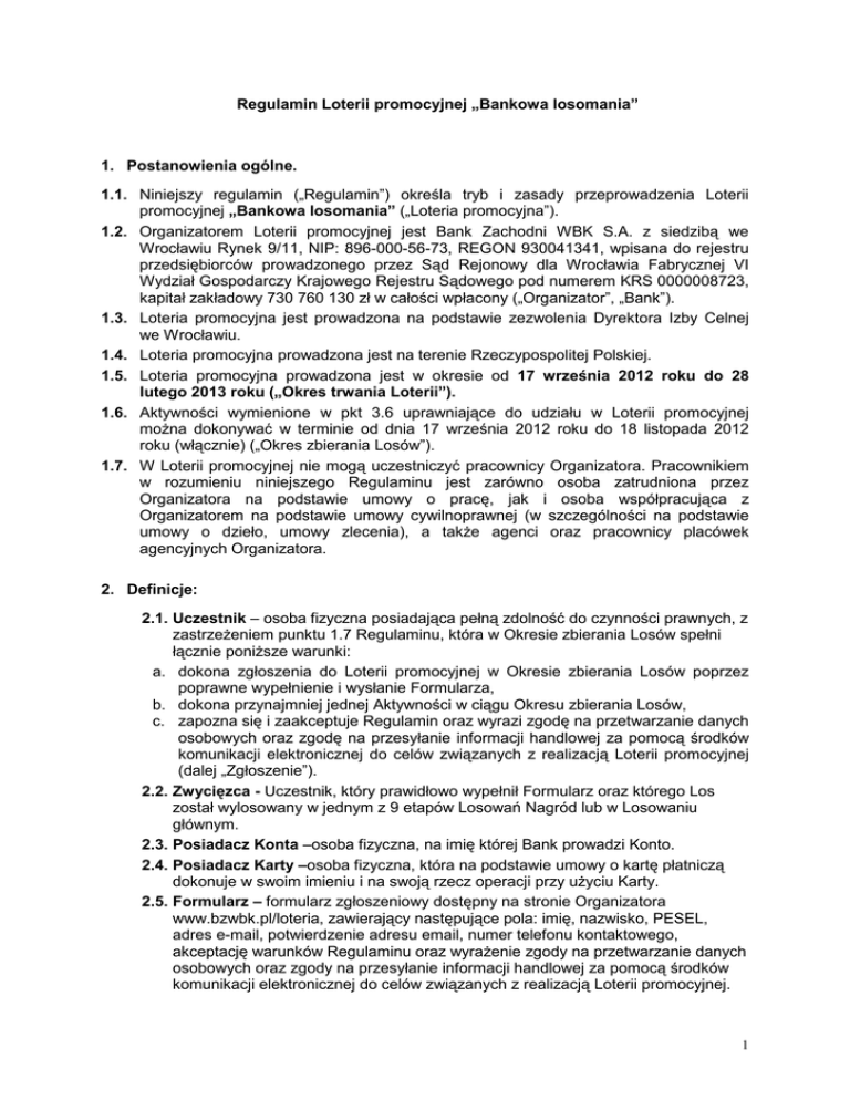 Regulamin Loterii promocyjnej „Bankowa losomania” 1. Postanowienia ogólne. 1.1. Niniejszy regulamin („Regulamin”) określa tryb i zasady przeprowadzenia Loterii promocyjnej „Bankowa losomania” („Loteria promocyjna”). 1.2. Organizatorem Loterii promocyjnej jest Bank Zachodni WBK S.A. z siedzibą we Wrocławiu Rynek 9/11, NIP: 896-000-56-73, REGON 930041341, wpisana do rejestru przedsiębiorców prowadzonego przez Sąd Rejonowy dla Wrocławia Fabrycznej VI Wydział Gospodarczy Krajowego Rejestru Sądowego pod numerem KRS 0000008723, kapitał zakładowy 730 760 130 zł w całości wpłacony („Organizator”, „Bank”). 1.3. Loteria promocyjna jest prowadzona na podstawie zezwolenia Dyrektora Izby Celnej we Wrocławiu. 1.4. Loteria promocyjna prowadzona jest na terenie Rzeczypospolitej Polskiej. 1.5. Loteria promocyjna prowadzona jest w okresie od 17 września 2012 roku do 28 lutego 2013 roku („Okres trwania Loterii”). 1.6. Aktywności wymienione w pkt 3.6 uprawniające do udziału w Loterii promocyjnej moŜna dokonywać w terminie od dnia 17 września 2012 roku do 18 listopada 2012 roku (włącznie) („Okres zbierania Losów”). 1.7. W Loterii promocyjnej nie mogą uczestniczyć pracownicy Organizatora. Pracownikiem w rozumieniu niniejszego Regulaminu jest zarówno osoba zatrudniona przez Organizatora na podstawie umowy o pracę, jak i osoba współpracująca z Organizatorem na podstawie umowy cywilnoprawnej (w szczególności na podstawie umowy o dzieło, umowy zlecenia), a takŜe agenci oraz pracownicy placówek agencyjnych Organizatora. 2. Definicje: 2.1. Uczestnik – osoba fizyczna posiadająca pełną zdolność do czynności prawnych, z zastrzeŜeniem punktu 1.7 Regulaminu, która w Okresie zbierania Losów spełni łącznie poniŜsze warunki: a. dokona zgłoszenia do Loterii promocyjnej w Okresie zbierania Losów poprzez poprawne wypełnienie i wysłanie Formularza, b. dokona przynajmniej jednej Aktywności w ciągu Okresu zbierania Losów, c. zapozna się i zaakceptuje Regulamin oraz wyrazi zgodę na przetwarzanie danych osobowych oraz zgodę na przesyłanie informacji handlowej za pomocą środków komunikacji elektronicznej do celów związanych z realizacją Loterii promocyjnej (dalej „Zgłoszenie”). 2.2. Zwycięzca - Uczestnik, który prawidłowo wypełnił Formularz oraz którego Los został wylosowany w jednym z 9 etapów Losowań Nagród lub w Losowaniu głównym. 2.3. Posiadacz Konta –osoba fizyczna, na imię której Bank prowadzi Konto. 2.4. Posiadacz Karty –osoba fizyczna, która na podstawie umowy o kartę płatniczą dokonuje w swoim imieniu i na swoją rzecz operacji przy uŜyciu Karty. 2.5. Formularz – formularz zgłoszeniowy dostępny na stronie Organizatora www.bzwbk.pl/loteria, zawierający następujące pola: imię, nazwisko, PESEL, adres e-mail, potwierdzenie adresu email, numer telefonu kontaktowego, akceptację warunków Regulaminu oraz wyraŜenie zgody na przetwarzanie danych osobowych oraz zgody na przesyłanie informacji handlowej za pomocą środków komunikacji elektronicznej do celów związanych z realizacją Loterii promocyjnej. 1 2.6. Konto/Konto osobiste - rachunek rozliczeniowo oszczędnościowy w złotych zawarty zgodnie z umową z Bankiem. 2.7. Karta – karta płatnicza wydana przez Bank: a. Karta kredytowa lub b. Karta debetowa wydana do Konta osobistego dla klientów detalicznych. 2.8. Karta PAYBACK – Karty debetowe MasterCard PAYBACK, MasterCard PAYBACK Multi, Naklejka MasterCard PAYBACK lub kredytowa MasterCard PAYBACK. 2.9. Transakcja bezgotówkowa - płatność Kartą w kraju lub zagranicą dokonana przez Uczestnika w punkcie handlowo-usługowym lub w Internecie na kwotę minimum 20 zł. 2.10. Usługa Ratio – usługa oferowana w ramach limitu kredytowego przyznanego Posiadaczowi Karty kredytowej umoŜliwiająca rozłoŜenie na raty, zakupów dokonanych Kartą kredytową. 2.11. Przelew z Karty kredytowej – dokonanie przelewu z rachunku Karty kredytowej w usługach BZWBK24 na kwotę min.20zł. 2.12. Przelew24 – usługa pozwalająca płacić w sklepach internetowych bez ręcznego wprowadzania danych o transakcji i odbiorcy na kwotę min.20zł. 2.13. Aktywność – poszczególne działania Uczestnika, które uprawniają go do wzięcia udziału w Loterii promocyjnej pod warunkiem prawidłowego wypełnienia i wysłania Formularza. W skład Aktywności wchodzą: załoŜenie Konta osobistego wraz z Kartą debetową i usługami bankowości elektronicznej; podpisanie Umowy o udzielenie kredytu i wydanie płatniczej Karty kredytowej wraz z usługami bankowości elektronicznej; dokonywanie Transakcji bezgotówkowej Kartami debetowymi, kredytowymi; uruchomienie Usługi Ratio, dokonanie Przelewu z Karty kredytowej, Przelewu24. 2.14. Los – przyznawany Uczestnikowi za dokonane Aktywności uprawniający do wzięcia udziału w Losowaniu. 2.15. Losowanie – losowy wybór zwycięzców Nagród w Loterii promocyjnej dokonany zgodnie z zasadami opisanymi w punkcie 5.2 i 5.3. 3. Zasady prowadzenia Loterii promocyjnej. 3.1. Zgłoszenia do Loterii promocyjnej przez Uczestnika moŜna dokonywać od 17 września 2012 roku do 18 listopada 2012 roku. 3.2. KaŜdy Uczestnik poprzez wypełnienie Formularza dokonuje Zgłoszenia do Loterii promocyjnej tylko raz. Uczestnik bierze udział w kolejnych etapach i będzie brany pod uwagę w kolejnych Losowaniach pod warunkiem uzyskania w danym etapie Losów za Aktywność. Uczestnik otrzymuje Losy za Aktywność począwszy od etapu w którym dokonał Zgłoszenia. 3.3. W Okresie zbierania Losów Uczestnik moŜe wypełnić Formularz tylko raz. 3.4. W kaŜdym Losowaniu Uczestnik moŜe wygrać tylko jedną nagrodę z zastrzeŜeniem pkt 4.6. 3.5. Nieprawidłowe wypełnienie Formularza jednoznaczne jest z wykluczeniem Uczestnika z Loterii promocyjnej. 3.6. Zasady przyznawania Losów: Aktywność Otwarcie: - Konta osobistego wraz z Kartą debetową i usługami bankowości elektronicznej, (ty
