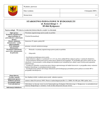 Wydanie: pierwsze Data wydania: 4 listopada 2009 r. Strona/stron 1/1 STAROSTWO POWIATOWE W BYDGOSZCZY ul. Konarskiego 1 – 3 85-066 Bydgoszcz Nazwa usługi: WYMIANA ZAGRANICZNEGO PRAWA JAZDY NA POLSKIE Opis sprawy Komórka organizacyjna odpowiedzialna za prowadzenie i załatwianie sprawy Miejsce składania dokumentów / osoba odpowiedzialna Tryb składania dokumentów Wymagane dokumenty oraz wzory dokumentów do pobrania Wymiana zagranicznego prawa jazdy na polskie Wydział Komunikacji biurowiec IV piętro, pokój 403 pisemny wniosek zainteresowanego 1. Wniosek o wymianę zagranicznego prawa jazdy na polskie. 2. Załączniki: - kserokopia posiadanego prawa jazdy, - jedno kolorowe zdjęcie o wymiarach 3,5 x 4,5 cm, (lewy półprofil bez nakrycia głowy i ciemnych okularów), - uwierzytelnione tłumaczenie prawa jazdy (przez tłumacza przysięgłego). W przypadku gdy prawo jazdy nie jest określone w konwencjach o ruchu drogowym dodatkowym warunkiem jest zdanie części teoretycznej egzaminu państwowego, - świadectwo lekarskie wystawione przez lekarza uprawnionego do badań kierowców w przypadku utraty ważności badania lekarskiego w posiadanym prawie jazdy, - kserokopia karty pobytu lub innego dokumentu potwierdzającego posiadanie prawa pobytu na terenie RP w przypadku obcokrajowca. Kogo dotyczy Termin i sposób załatwienia sprawy Podstawa prawna Ewentualne opłaty Tryb odwoławczy Informacje dodatkowe bez zbędnej zwłoki, wydanie prawa jazdy zakańcza sprawę ustawa z dnia 20 czerwca 1997r. Prawo o ruchu drogowym (Dz. U. z 2005r. Nr 108, poz. 908 z późn. zm.). Odwołanie na decyzję wnosi się do Samorządowego Kolegium Odwoławczego w Bydgoszczy za pośrednictwem Starosty Bydgoskiego w terminie 14 dni od dnia doręczenia decyzji stronie.