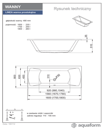 WANNY Rysunek techniczny LINEA wanna prostokątna głębokość wanny: 480 mm 310 450 630 800 510 35 pojemność: 1600 - 235 l 1700 - 255 l 1800 - 260 l 50 920 (980,1040) 1560 (1670,1780) 1600 (1700,1800) 2x 6x w zestawie nóżki i wsporniki zakres regulacji: 110 - 155 mm 4x 4x Data: 160112
