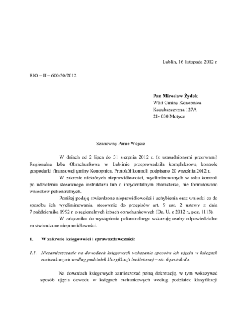 Lublin, 16 listopada 2012 r. RIO – II – 600/30/2012 Pan Mirosław Żydek Wójt Gminy Konopnica Kozubszczyzna 127A 21- 030 Motycz Szanowny Panie Wójcie W dniach od 2 lipca do 31 sierpnia 2012 r. (z uzasadnionymi przerwami) Regionalna Izba Obrachunkowa w Lublinie przeprowadziła kompleksową kontrolę gospodarki finansowej gminy Konopnica. Protokół kontroli podpisano 20 września 2012 r. W zakresie niektórych nieprawidłowości, wyeliminowanych w toku kontroli po udzieleniu stosownego instruktażu lub o incydentalnym charakterze, nie formułowano wniosków pokontrolnych. Poniżej podaję stwierdzone nieprawidłowości i uchybienia oraz wnioski co do sposobu ich wyeliminowania, stosownie do przepisów art. 9 ust. 2 ustawy z dnia 7 października 1992 r. o regionalnych izbach obrachunkowych (Dz. U. z 2012 r., poz. 1113). W załączniku do wystąpienia pokontrolnego wskazuję osoby odpowiedzialne za stwierdzone nieprawidłowości. 1. W zakresie księgowości i sprawozdawczości: 1.1. Niezamieszczanie na dowodach księgowych wskazania sposobu ich ujęcia w księgach rachunkowych według podziałek klasyfikacji budżetowej – str. 6 protokołu. Na dowodach księgowych zamieszczać pełną dekretację, w tym wskazywać sposób ujęcia dowodu w księgach rachunkowych według podziałek klasyfikacji 2 budżetowej, stosownie do przepisów art. 21 ust. 1 pkt 6 ustawy z dnia 29 września 1994 r. o rachunkowości (Dz. U. z 2009 r. Nr 152, poz. 1223 z późn. zm.). 1.2. Przypadki nieujęcia w księgach rachunkowych 2011 r. wszystkich osiągniętych przychodów – str. 9, 10 protokołu. W księgach rachunkowych jednostki ujmować wszystkie osiągnięte, przypadające na jej rzecz przychody dotyczące danego roku obrotowego, niezależnie od terminu ich zapłaty, stosownie do przepisów art. 6 ust. 1 ustawy o rachunkowości. 1.3. Nieterminowe dokonywanie zwrotu zabezpieczeń należytego wykonania umów wniesionych w pieniądzu oraz zwrot tych zabezpieczeń i wadiów – bez odsetek wynikających z rachunku bankowego i bez rozliczenia kosztów prowadzenia rachunku, na którym kwoty te były przechowywane. Nieprawidłowe zabezpieczenie należytego wykonania umowy nr 100/2008 z 26.08.2008 r. – str. 11 - 14, 107, 110 protokołu. Zabezpieczenie należytego wykonania umowy o zamówienie publiczne zwracać wykonawcy: - w terminie 30 dni od dnia wykonania zamówienia i uznania przez zamawiającego za należycie wykonane – w przypadku zabezpieczenia należytego wykonania umowy, - nie później niż w 15. dniu po upływie okresu rękojmi za wady – w przypadku kwot pozostawionych na zabezpieczenie roszczeń z tego tytułu, zgodnie z przepisami art. 151 ust. 1 i 3 ustawy z dnia 29 stycznia 2004 r. Prawo zamówień publicznych (Dz. U. z 2010 r. Nr 113, poz. 759 z późn. zm.). Przepis art. 151 ust. 2 tej ustawy mówi o kwocie pozostawionej na zabezpieczenie roszczeń z tytułu rękojmi za wady, z czego wynika, że kwota ta powinna stanowić część wniesionego już zabezpieczenia (część, która ma być pozostawiona), tym samym kwota ta nie może być wniesiona przez wykonawcę dopiero po zakończeniu umowy. Wnoszone przez wykonawców w pieniądzu wadia i zabezpieczenia należytego wykonania umów zwracać wraz z odsetkami wynikającymi z umowy rachunku bankowego, na którym były one przechowywane, pomniejszone o koszty prowadzenia tego rachunku oraz prowizji bankowej za przelew pieniędzy na rachunek bankowy wykonawcy, stosownie do przepisów art. 46 ust. 4 i art. 148 ust. 5 ustawy Prawo zamówień publicznych. 1.4. Wykazanie w jednostkowym sprawozdaniu Rb-27S za okres od początku roku do dnia 31.12.2011 r.: 3 - zawyżonych kwot zaległości w dz. 756 rozdz. 75616: w § 0310 o 14.839,43 zł i w § 0320 o 1.446,43 zł, - zrealizowanych dochodów z tytułu podatku od środków transportowych od trzech osób fizycznych jako dochodów od osób prawnych – str. 19 - 22, 69 protokołu. Jednostkowe sprawozdanie Rb-27 S „Miesięczne/roczne sprawozdanie z wykonania planu dochodów budżetowych jednostki samorządu terytorialnego” sporządzać na podstawie ksiąg rachunkowych, stosownie do przepisów § 6 ust. 1 pkt 1 i § 9 ust. 2 rozporządzenia Ministra Finansów z dnia 3 lutego 2010 r. w sprawie sprawozdawczości budżetowej (Dz. U. Nr 20, poz. 103). W kolumnie „zaległości” tego sprawozdania nie należy wykazywać zaległości płatnych w ratach (jeżeli termin płatności nie minął) lub odroczonych (w przypadku gdy odroczony termin płatności nie minął), zgodnie z przepisami § 2 ust. 1 pkt 1 „Instrukcji sporządzania sprawozdań budżetowych w zakresie budżetów jednostek samorządu terytorialnego”, stanowiącej załącznik Nr 39 do rozporządzenia w związku z przepisami § 10 ust. 4 pkt 1 d „Instrukcji sporządzania sprawozdań budżetowych w zakresie budżetu państwa”, stanowiącej załącznik Nr 37 do tego rozporządzenia. Kwoty dotyczące zrealizowanych dochodów z tytułu podatku od środków transportowych od osób fizycznych wykazywać w sprawozdaniu Rb-27S w rozdziale 75616 „Wpływy z podatku rolnego, podatku leśnego, podatku od spadków i darowizn, podatku od czynności cywilnoprawnych oraz podatków i opłat lokalnych od osób fizycznych”, zgodnie z „Klasyfikacją rozdziałów”, stanowiącą załącznik Nr 2 do rozporządzenia Ministra Finansów z dnia 2 marca 2010 r. w sprawie szczegółowej klasyfikacji dochodów, wydatków, przychodów i rozchodów oraz środków pochodzących ze źródeł zagranicznych (Dz. U. Nr 38, poz. 207 z późn. zm.). 1.5. Wykazanie w bilansie z wykonania budżetu gminy, sporządzonym na 31 grudnia 2011 r., zobowiązań krótkoterminowych jako długoterminowych (w kwocie 2.474.260,00 zł) – str. 25 protokołu. Zobowiązania, które stają się wymagalne w ciągu 12 miesięcy od dnia bilansowego, wykazywać w bilansie z wykonania budżetu gminy jako zobowiązania krótkoterminowe, zgodnie z przepisami art. 3 ust. 1 pkt 22 ustaw