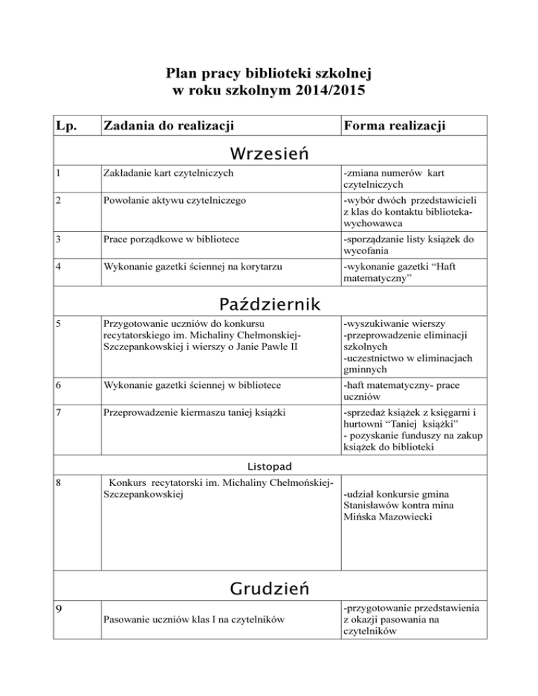 Plan pracy biblioteki szkolnej w roku szkolnym 2014/2015 Lp. Zadania do realizacji Forma realizacji Wrzesień 1 Zakładanie kart czytelniczych -zmiana numerów kart czytelniczych 2 Powołanie aktywu czytelniczego -wybór dwóch przedstawicieli z klas do kontaktu bibliotekawychowawca 3 Prace porządkowe w bibliotece -sporządzanie listy książek do wycofania 4 Wykonanie gazetki ściennej na korytarzu -wykonanie gazetki “Haft matematyczny” Październik 5 Przygotowanie uczniów do konkursu recytatorskiego im. Michaliny ChełmonskiejSzczepankowskiej i wierszy o Janie Pawle II -wyszukiwanie wierszy -przeprowadzenie eliminacji szkolnych -uczestnictwo w eliminacjach gminnych 6 Wykonanie gazetki ściennej w bibliotece -haft matematyczny- prace uczniów 7 Przeprowadzenie kiermaszu taniej książki -sprzedaż książek z księgarni i hurtowni “Taniej książki” - pozyskanie funduszy na zakup książek do biblioteki Listopad 8 Konkurs recytatorski im. Michaliny ChełmońskiejSzczepankowskiej -udział konkursie gmina Stanisławów kontra mina Mińska Mazowiecki Grudzień 9 Pasowanie uczniów klas I na czytelników -przygotowanie przedstawienia z okazji pasowania na czytelników -przygotowanie dyplomów dla nowych czytelników Styczeń 10 Przygotowanie statystyki semestralnej -sporządzenie statystyki semestralnej dla poszczególnych klas - analiza stanu czytelnictwa Luty 11 Dzien Kota -konkurs na napisanie wiersza o kocie dla klas I-III Marzec 12 Konkurc czytelniczy “Miziolek to ja!- konkurs czytelniczy dla uczniów klas IV-VI Kwiecień 13 Przygotowanie uczniów do konkursu recytatorskiego Warszawska Syrenka -wyszukiwanie wierszy -przeprowadzenie eliminacji szkolnych -uczestnictwo w eliminacjach gminnych 14 Konkurs plastyczny -”Znany ptak z literstury “ portret -konkurs dla uczniów klas I-IV Maj 15 Przygotowanie konkursu czytelniczego 'Baśnie H.Ch. -przygotowanie zestawu pytan Andersena” dla klas III-IV na konkurs -przygotowanie listy baśni do przeczytania na konkurs -przeprowadzenie konkursu 16 Przygotowanie uczniów do konkursu recytatorskiego im. Kornela Makuszńskiego -wyszukiwanie wierszy -przeprowadzenie eliminacji szkolnych -uczestnictwo w eliminacjach gminnych Czerwiec I 17 Przygotowanie statystyki rocznej -sporządzenie statystyki rocznej dla poszcególnych klas i uczniów - analiza stanu czytelnictwa Inne zadania wykonywane cyklicznie 18 Prowadzenie zajęć kółka ornitologicznego 19 Nauka haftu matematycznego 20 Organizacja spotkań członków Samorządu Uczniowskiego 21 Wydawanie miesięczne gazetki bibliotecznej “Donosiciel” 22 Sporządzanie statystyki miesięcznej, semestralnej i rocznej dla poszczególnych uczniów i klas 23 Katalogowanie i opracowywanie zakupionych książek 24 Akcesja czasopism 25 Udział w konferencjach, szkoleniach, warsztatach Elżbieta Binkowska
